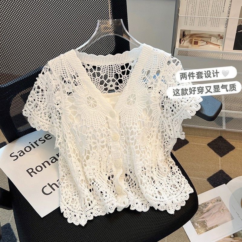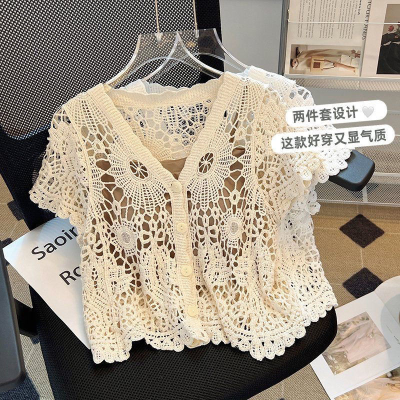 크로 셰 뜨개질 빈 니트 카디건 여자 여름 반팔 바깥 쪽 얇은 탑, 스트랩리스 블라우스스토어 가기