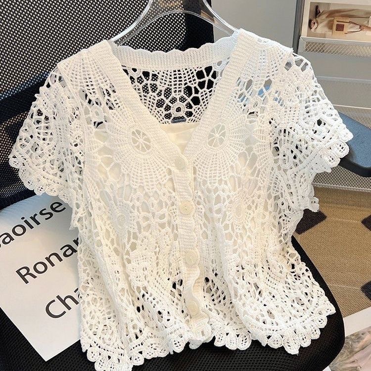 크로 셰 뜨개질 빈 니트 카디건 여자 여름 반팔 바깥 쪽 얇은 탑, 스트랩리스 블라우스