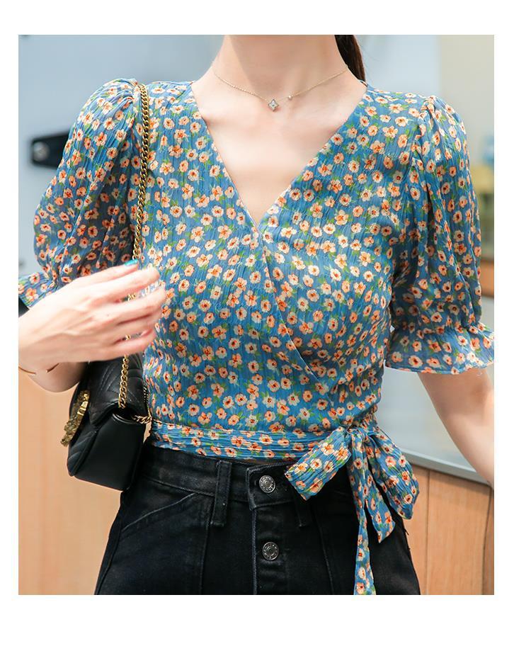 여름 프랑스 틈새 달콤한 데이지 쉬폰 셔츠 여성용 반팔 웨스턴 스타일 꽃 셔츠 퍼프 소매 쇼트 탑