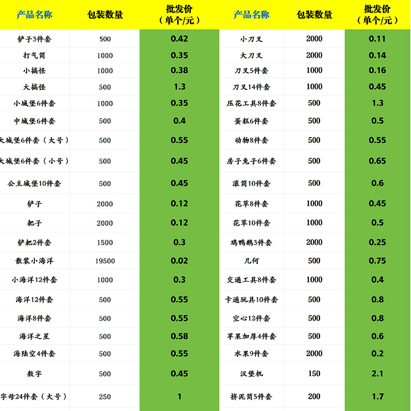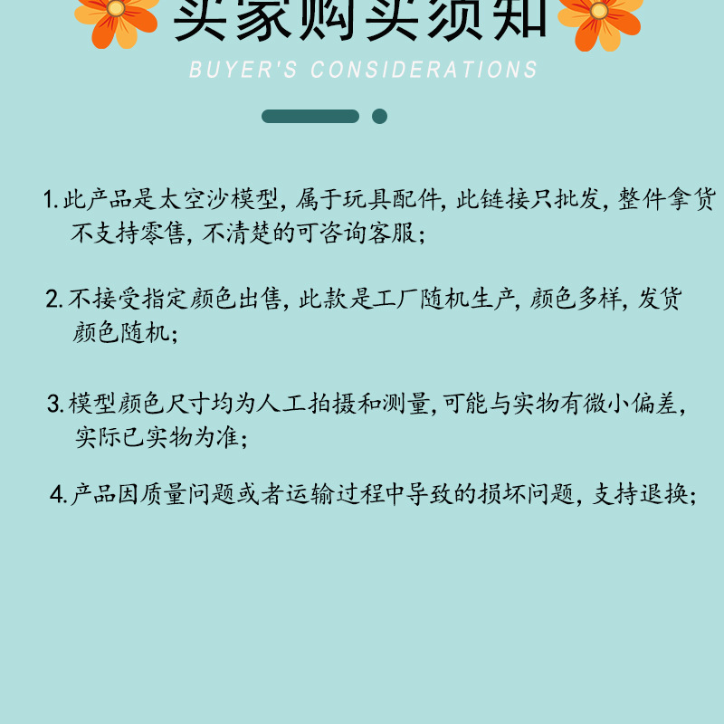 本款产品是太空沙玩具配件,只支持整件下单,只批发不接受零售,不清楚的话可以看下面的价格表或者联系客服!
