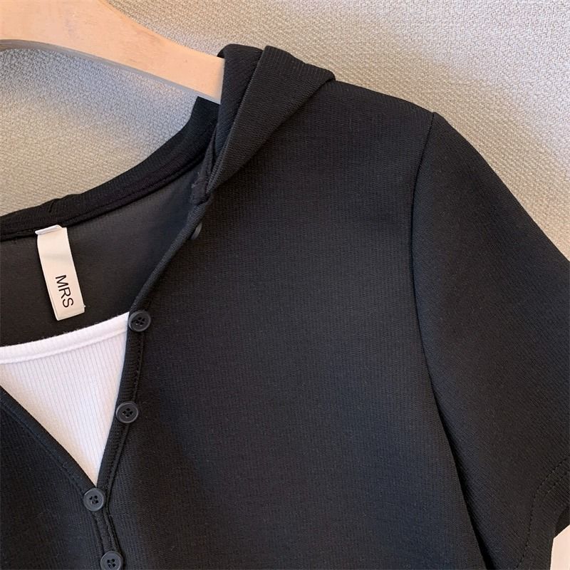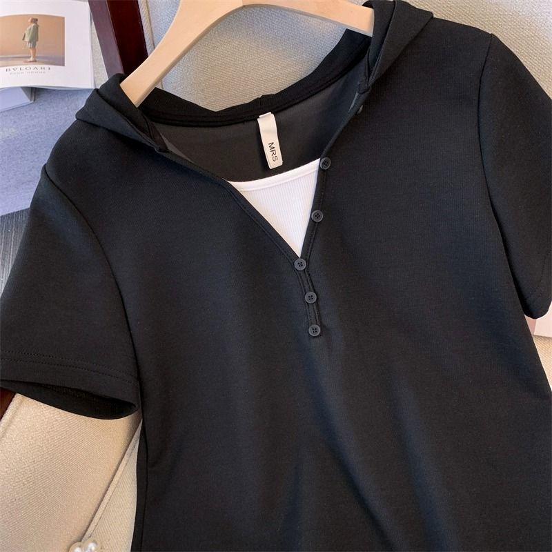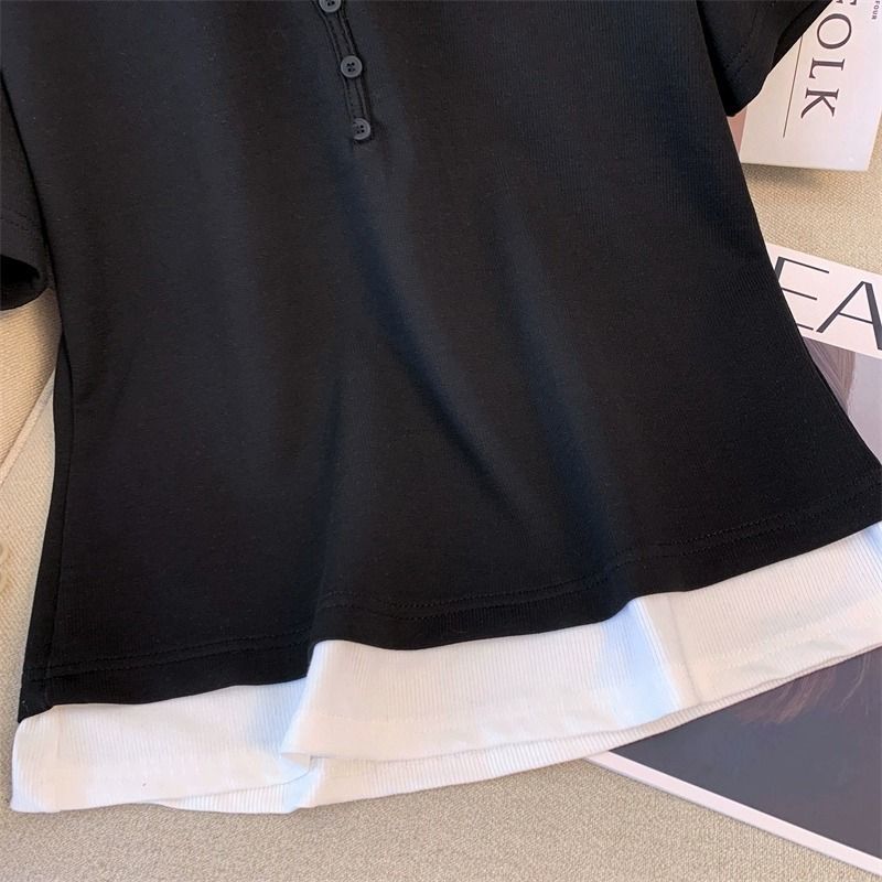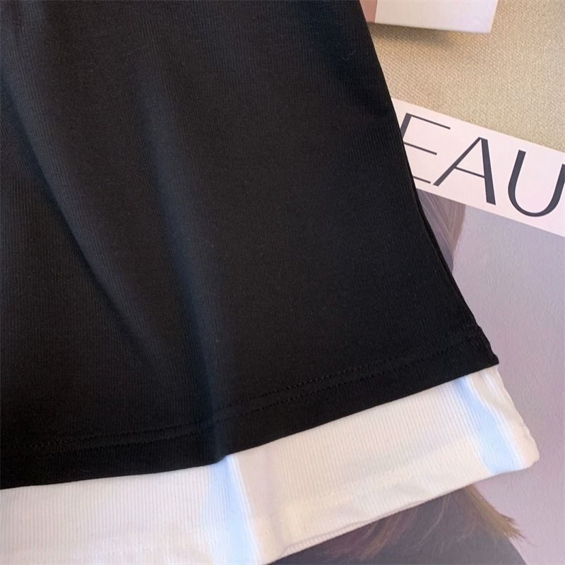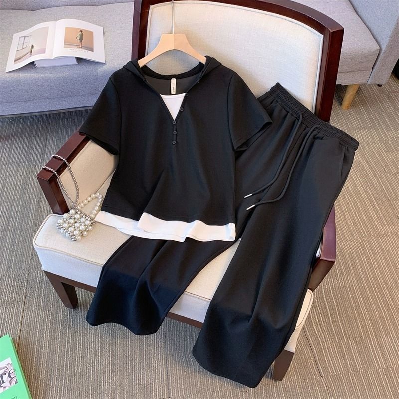 캐주얼 스포츠웨어 세트 여성 여름 플러스 사이즈 통통녀 컬러 대비 가짜 투피스 탑 티셔츠 와이드 레그 바지 투피스 세트스토어 가기