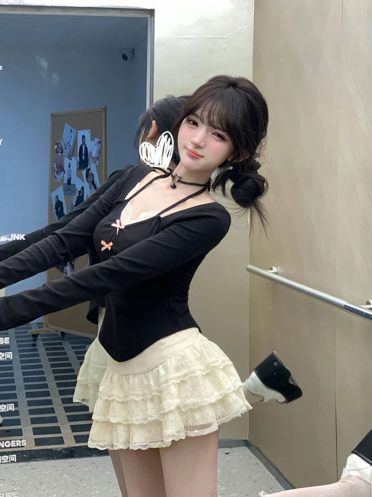순수한 욕망 레이스 바느질 목 탑 여성의 봄과 여름 새로운 높은 허리 슬리밍 푹신한 케이크 스커트 세트 여성 투피스 세트