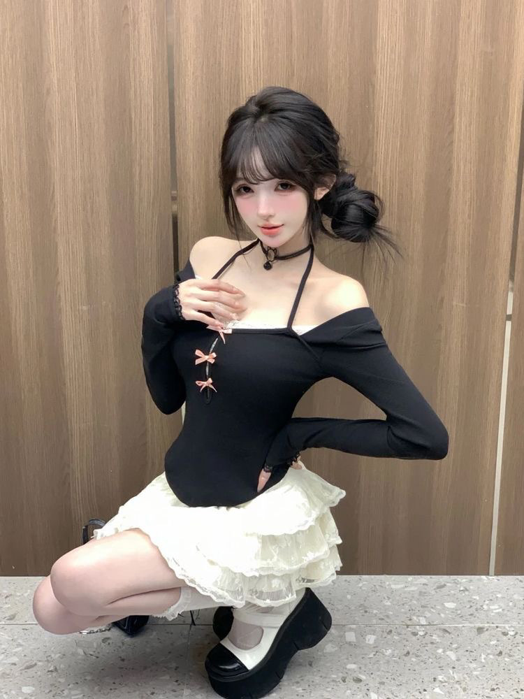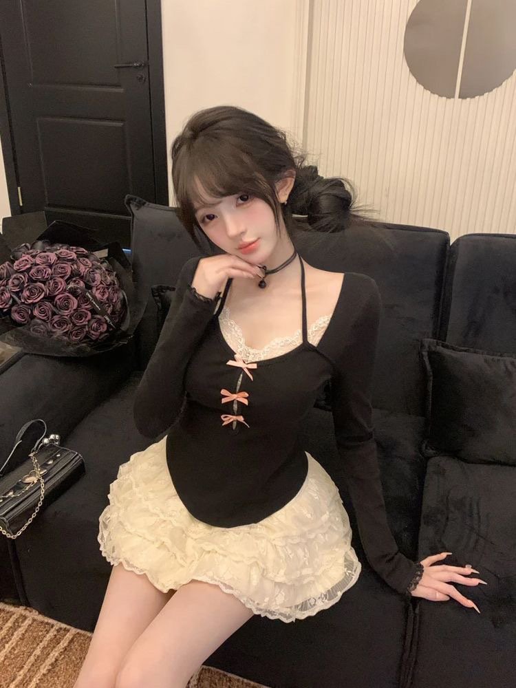 순수한 욕망 레이스 바느질 목 탑 여성의 봄과 여름 새로운 높은 허리 슬리밍 푹신한 케이크 스커트 세트 여성 투피스 세트스토어 가기