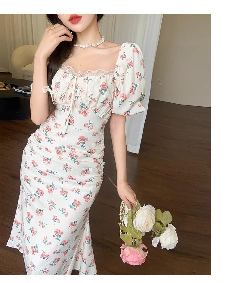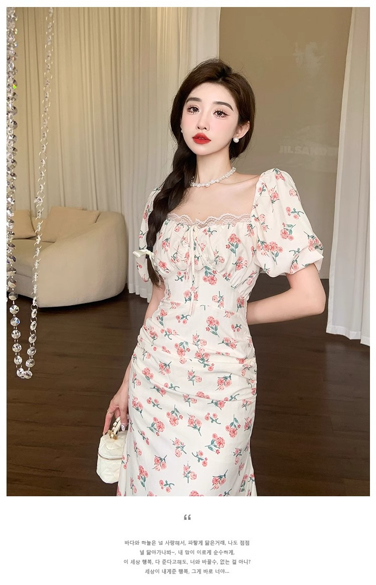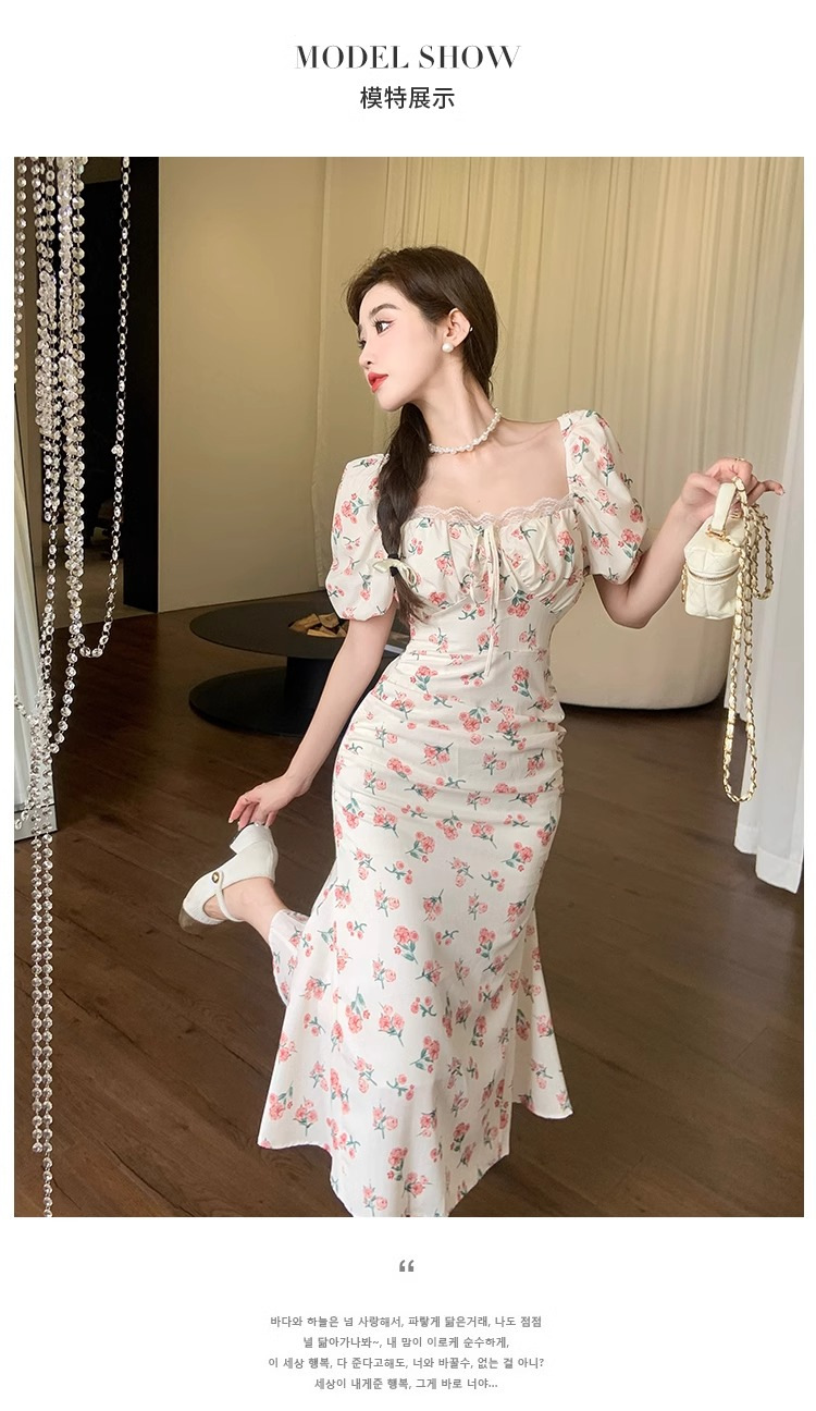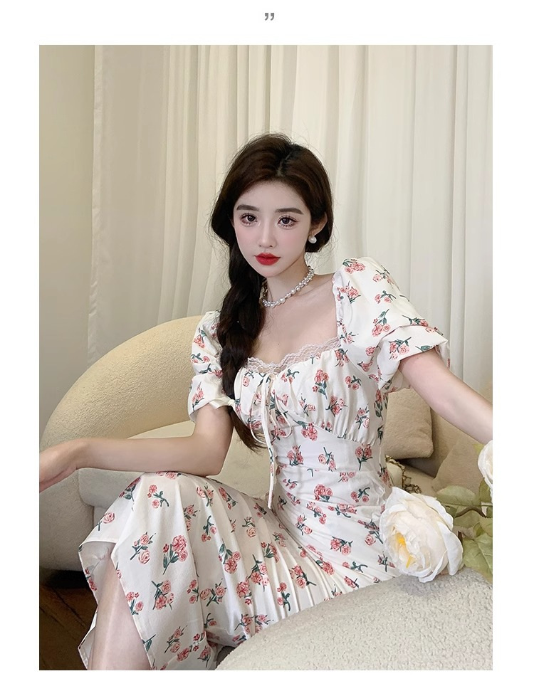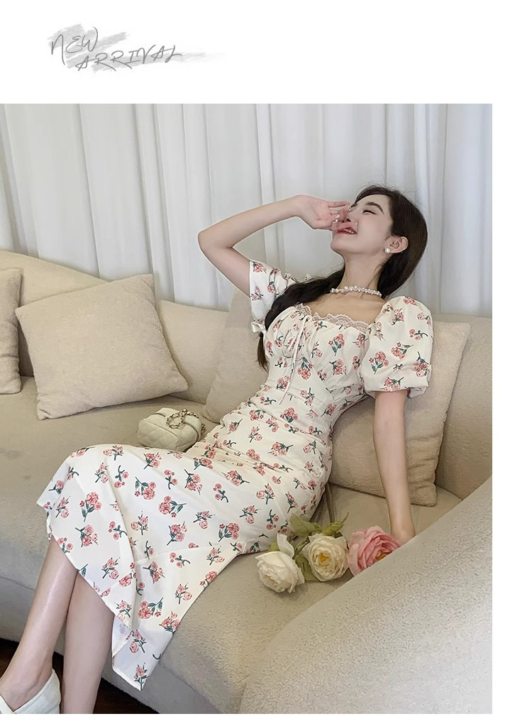 프랑스 스타일 부드러운 광장 칼라 꽃 거품 반팔 원피스 여성 여름 우아한 꽉 허리 슬리밍 요정 원피스 긴 치마스토어 가기