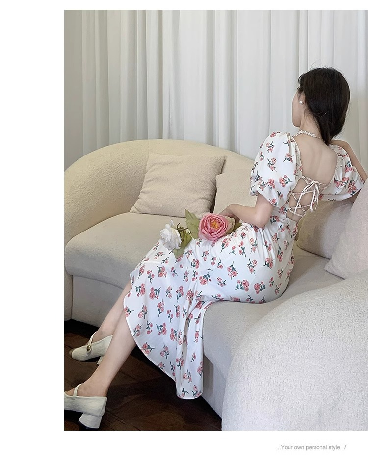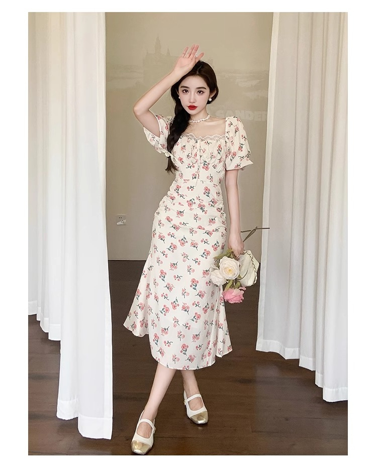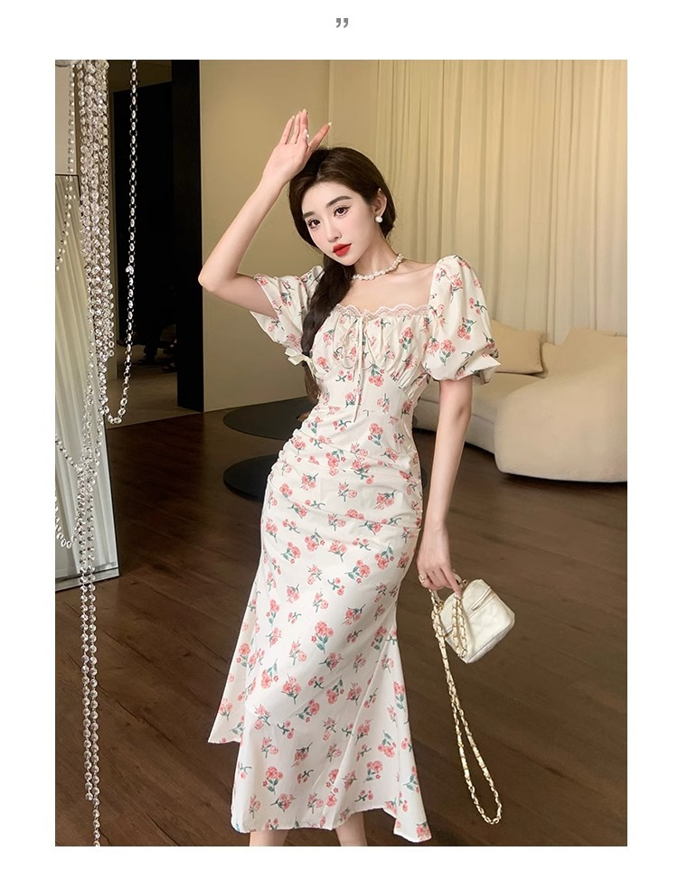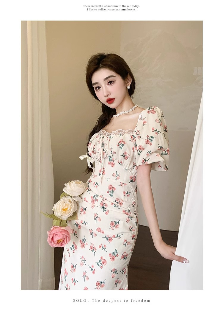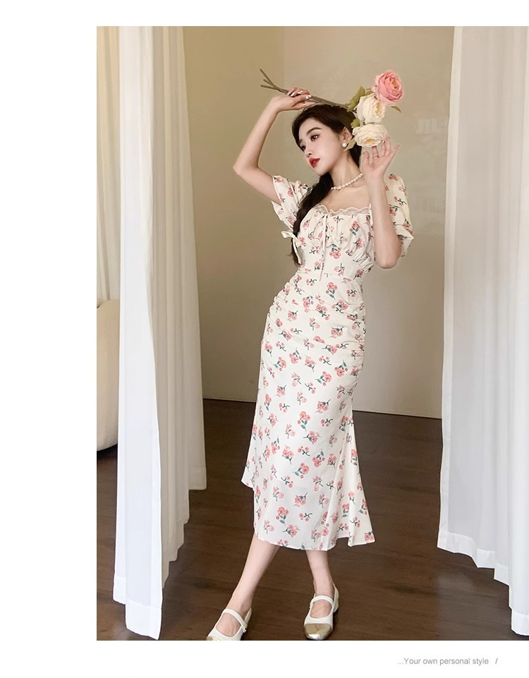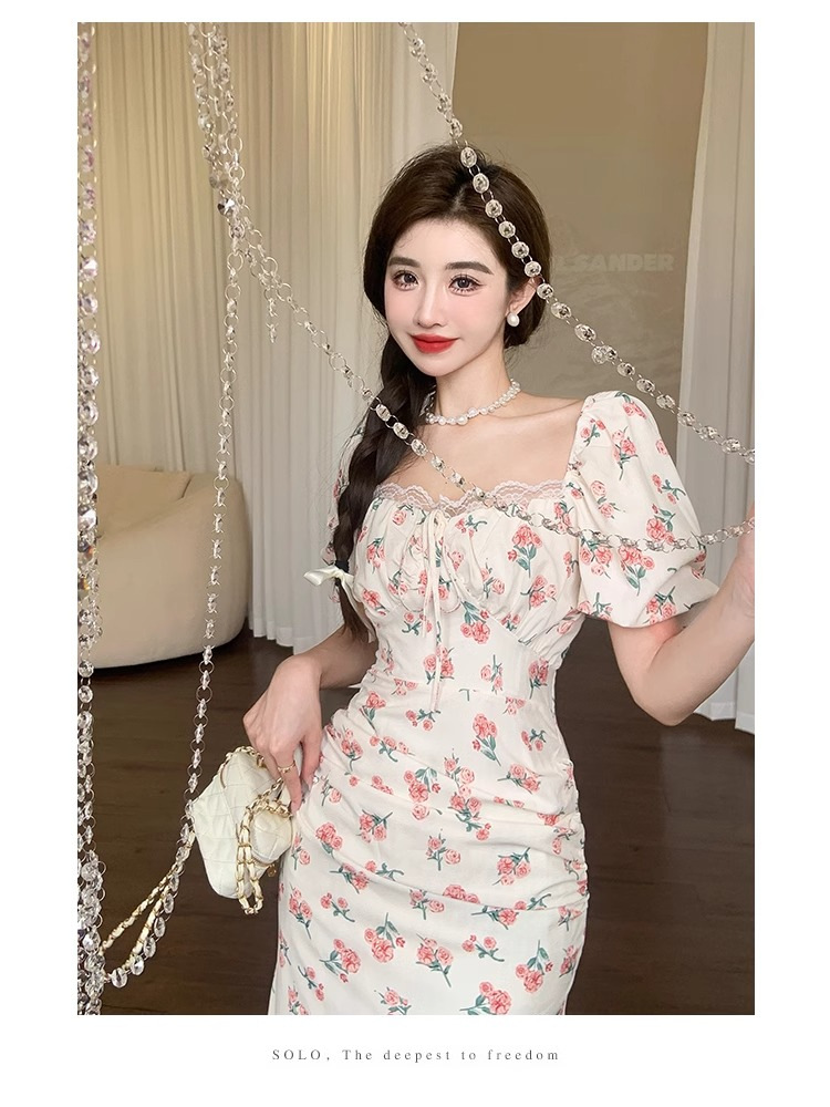 프랑스 스타일 부드러운 광장 칼라 꽃 거품 반팔 원피스 여성 여름 우아한 꽉 허리 슬리밍 요정 원피스 긴 치마스토어 가기
