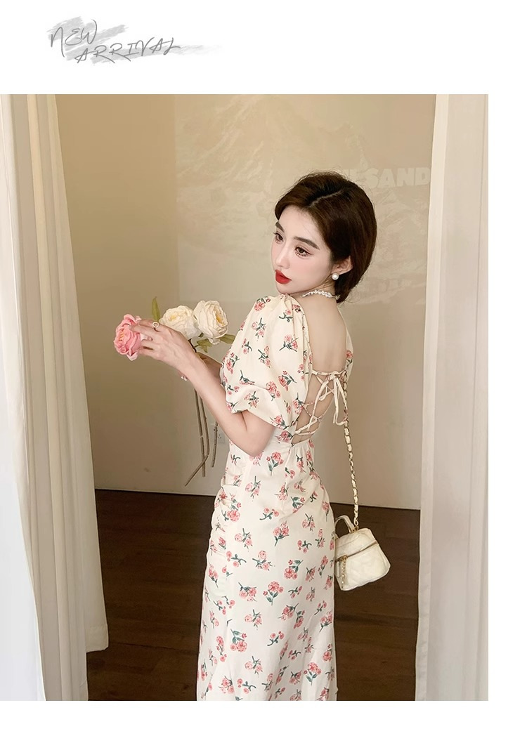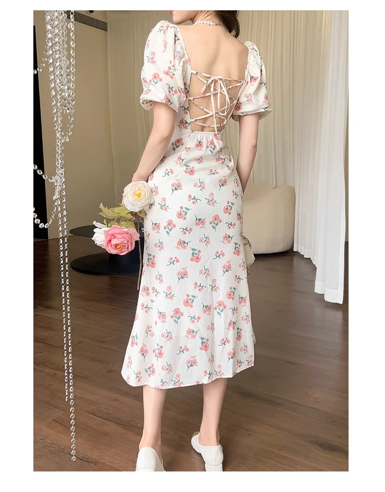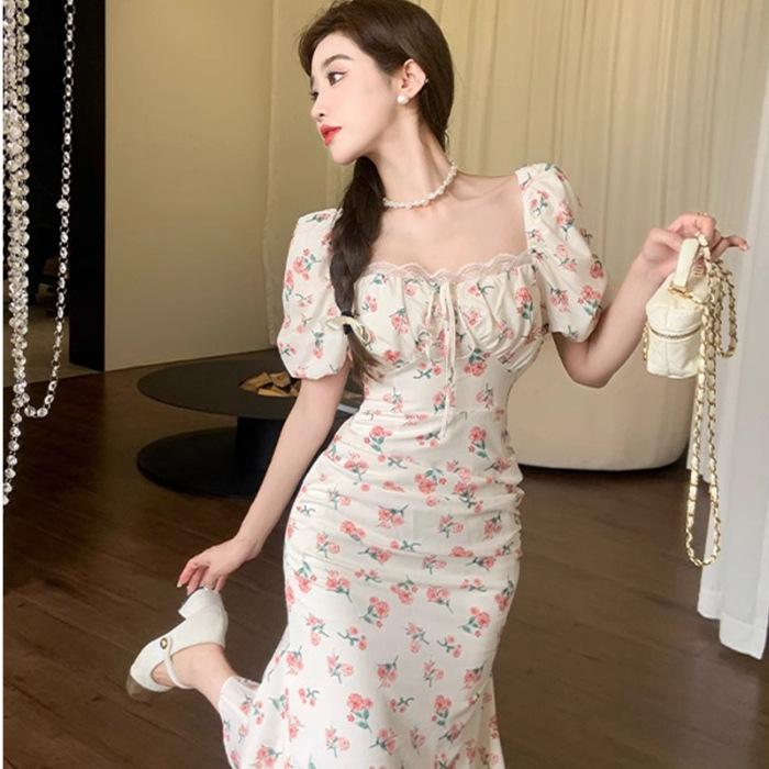프랑스 스타일 부드러운 광장 칼라 꽃 거품 반팔 원피스 여성 여름 우아한 꽉 허리 슬리밍 요정 원피스 긴 치마