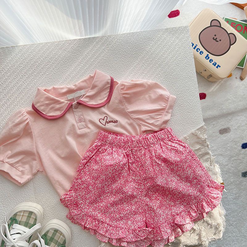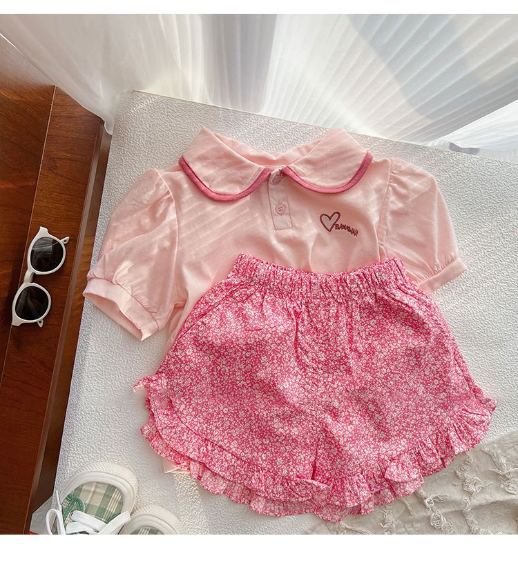 여름 여자 세트 아기 세련된 어린이 맞춤형 트렌디 브랜드 한국 인형 칼라 러브 티셔츠 깨진 레이스 반바지스토어 가기