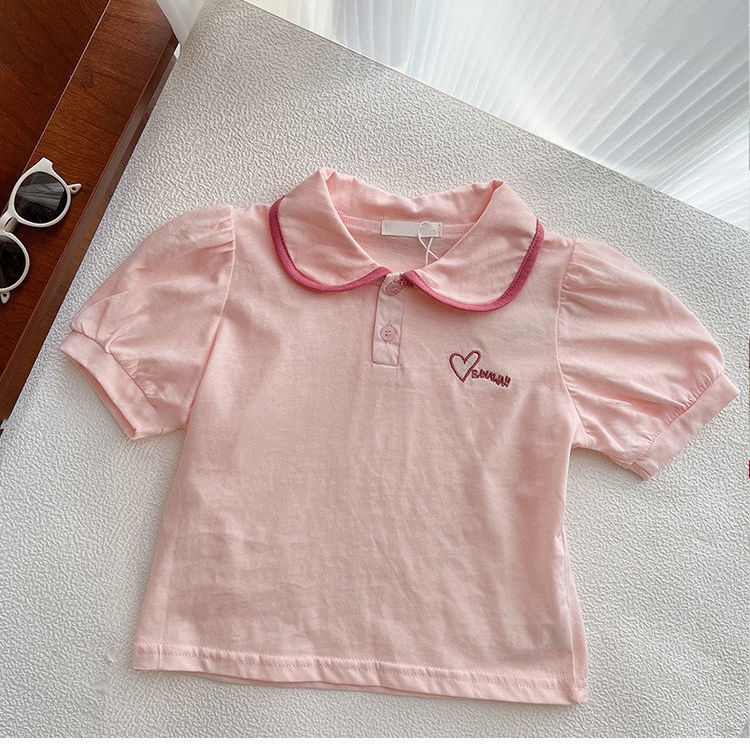 여름 여자 세트 아기 세련된 어린이 맞춤형 트렌디 브랜드 한국 인형 칼라 러브 티셔츠 깨진 레이스 반바지
