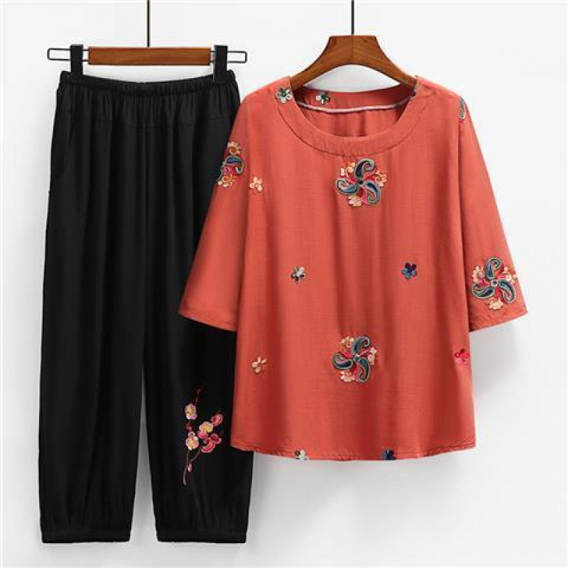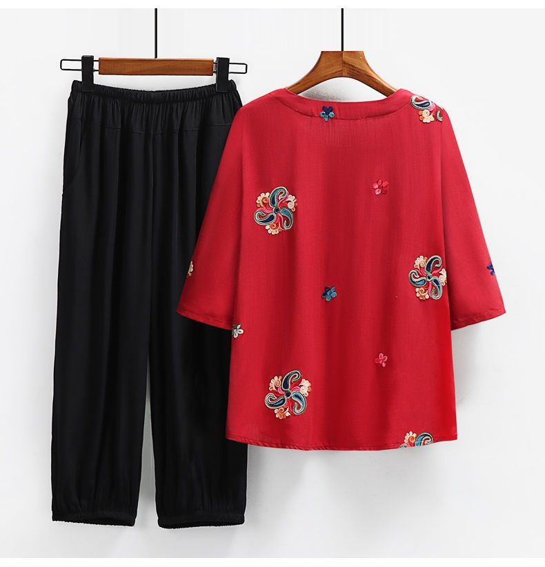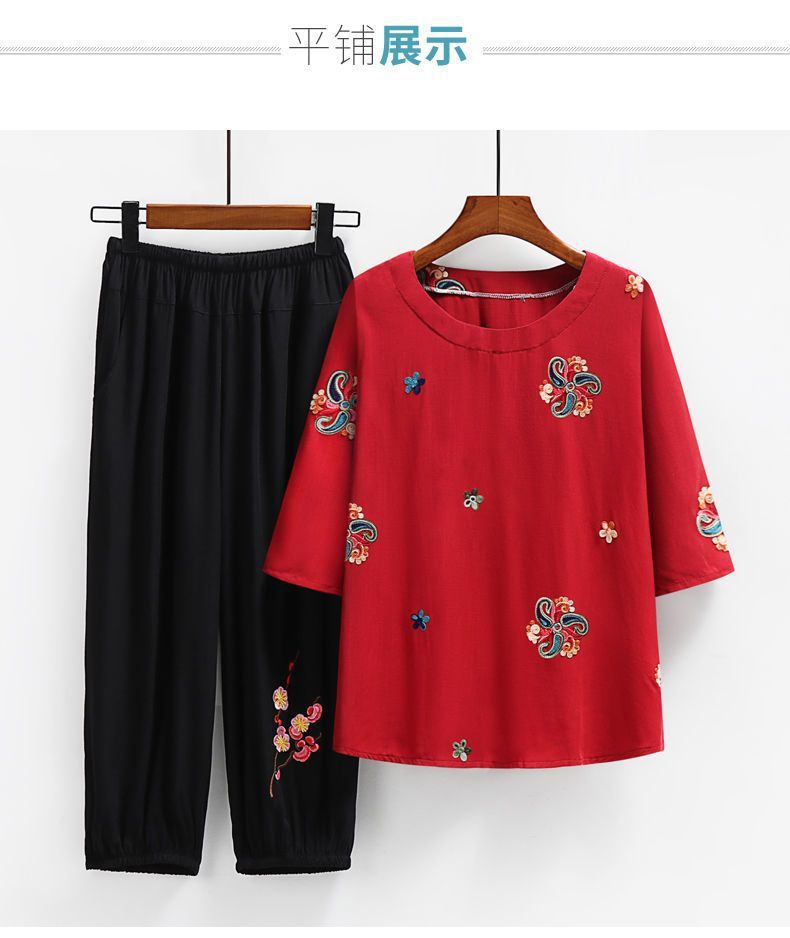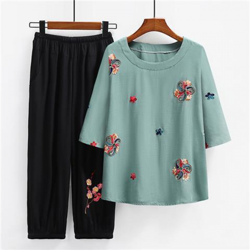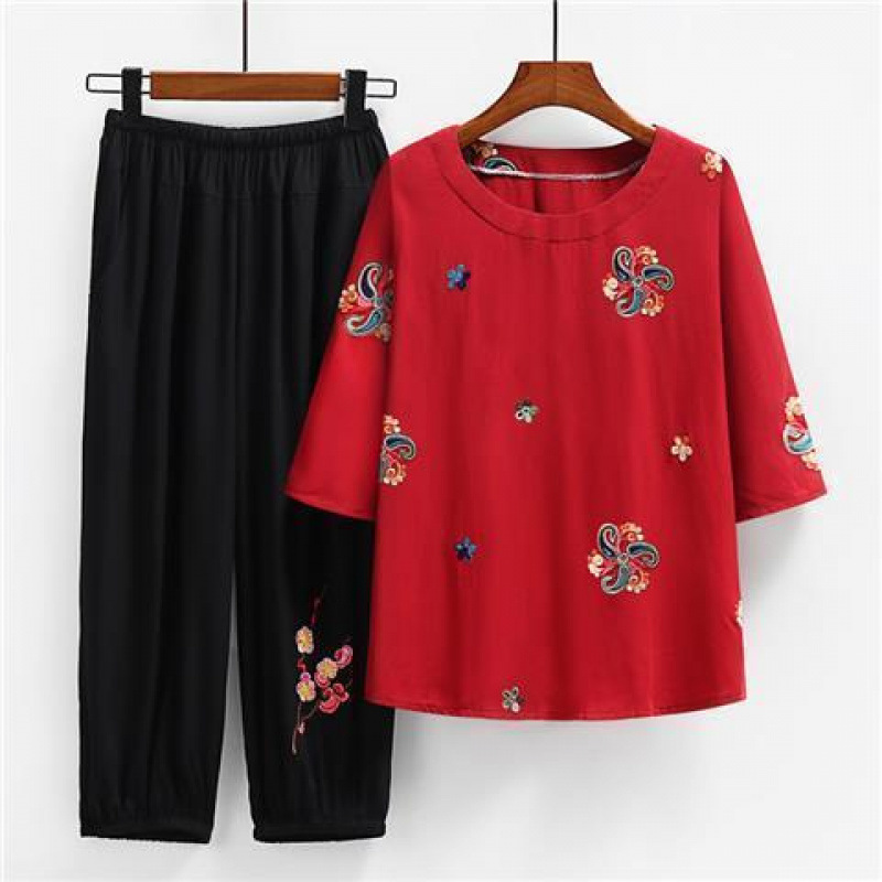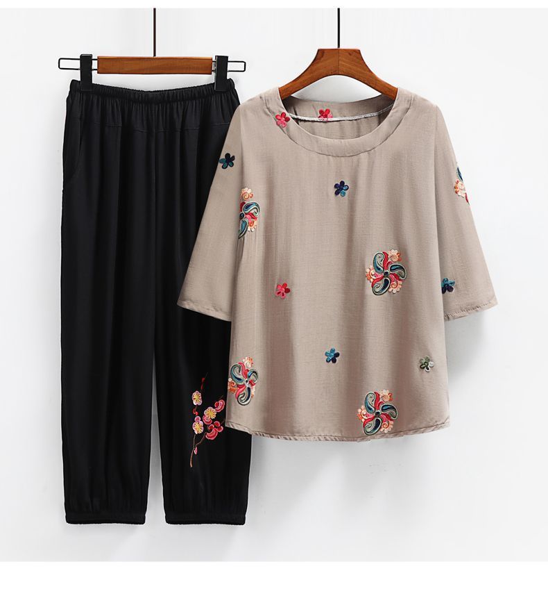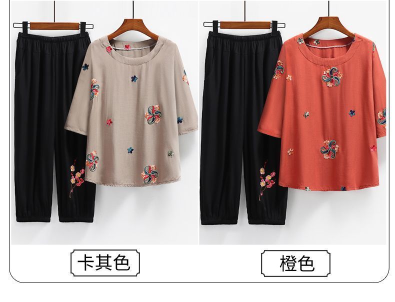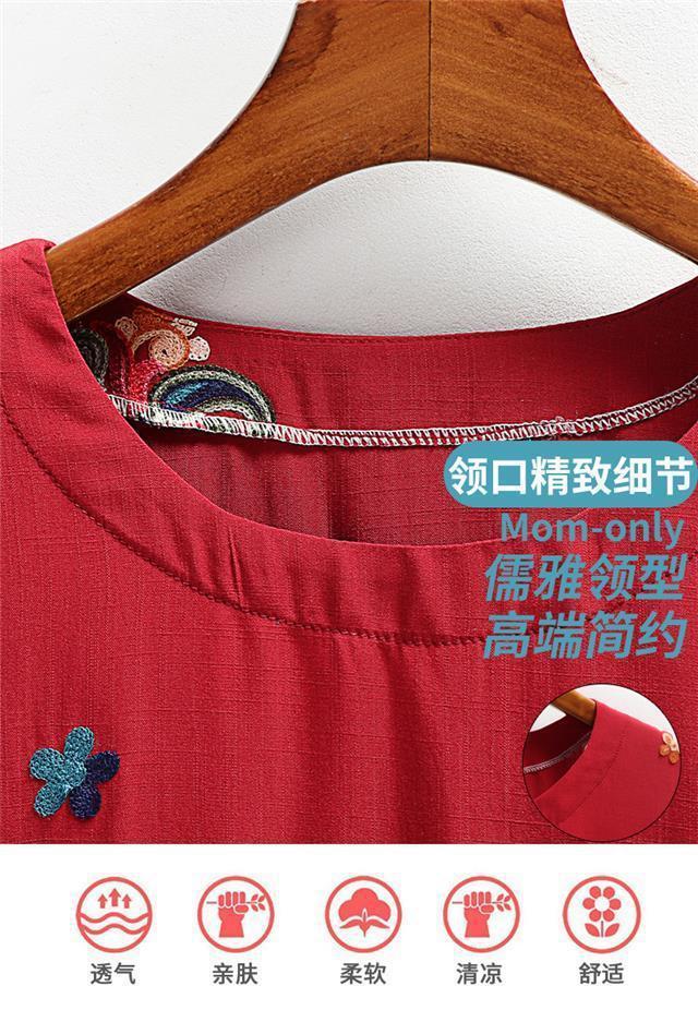 여름 코튼 리넨 중년 및 노인 플러스 사이즈 여성 의류 민족 스타일 자수 세븐 슬리브 티셔츠 세트 어머니 웨스턴 스타일 탑