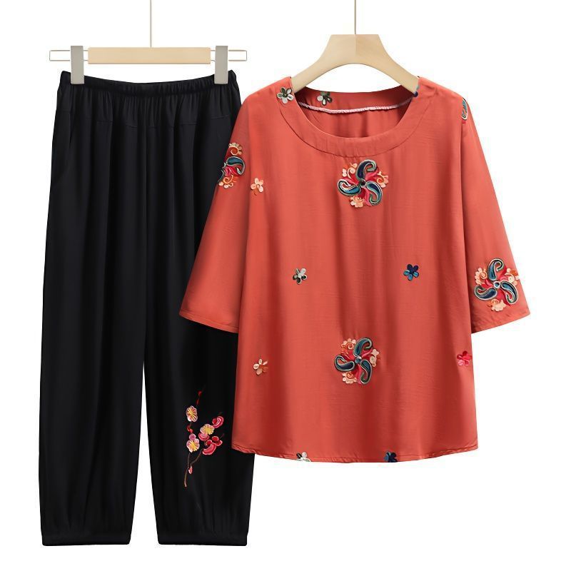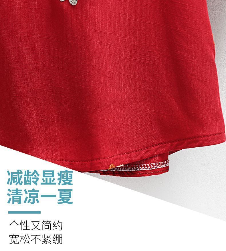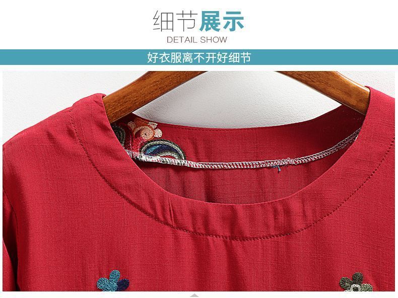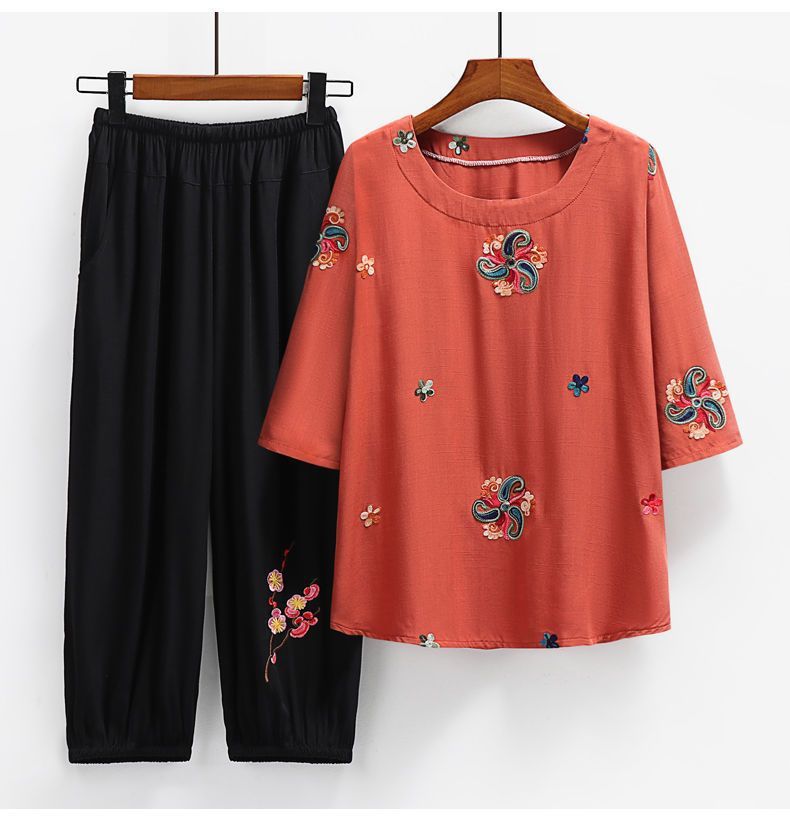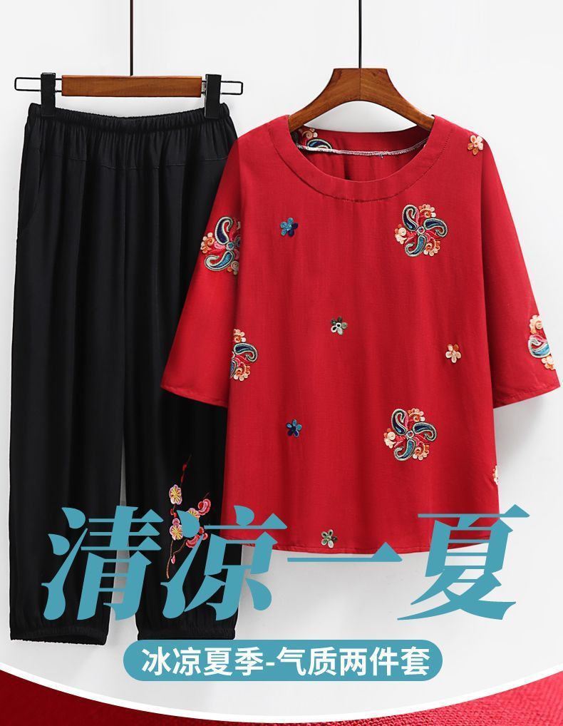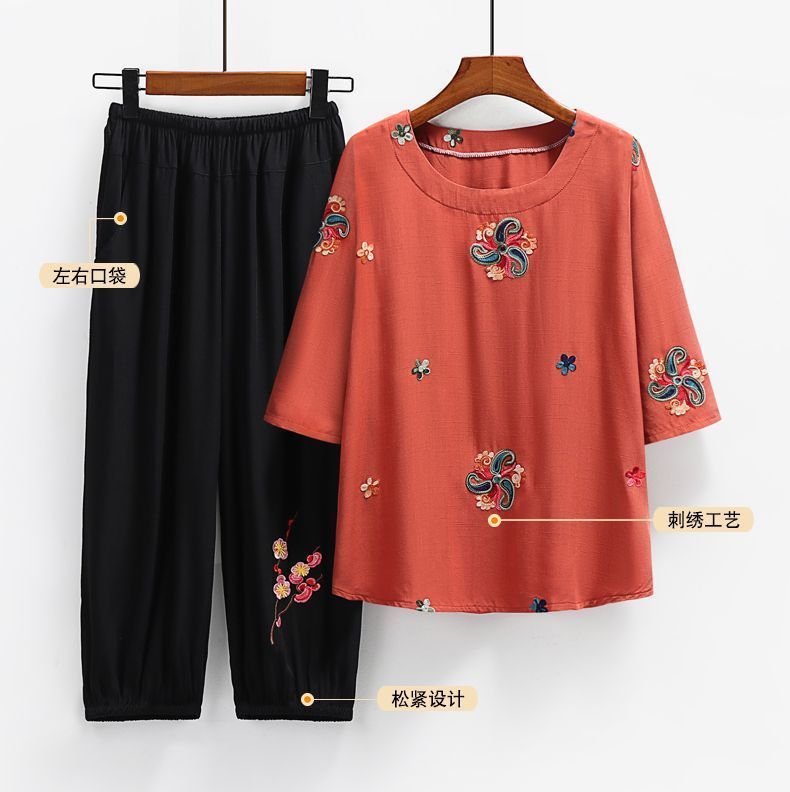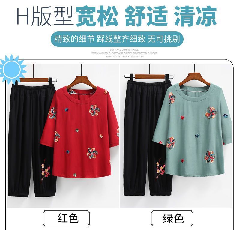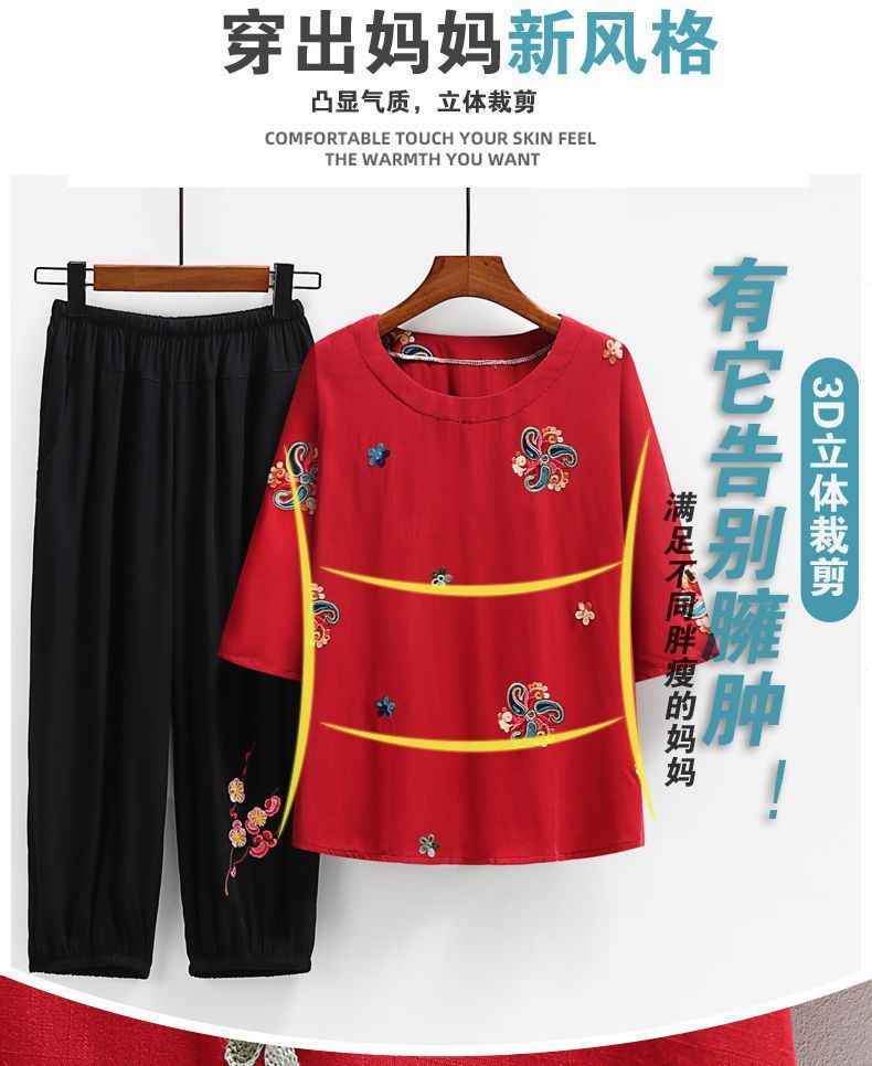 여름 코튼 리넨 중년 및 노인 플러스 사이즈 여성 의류 민족 스타일 자수 세븐 슬리브 티셔츠 세트 어머니 웨스턴 스타일 탑