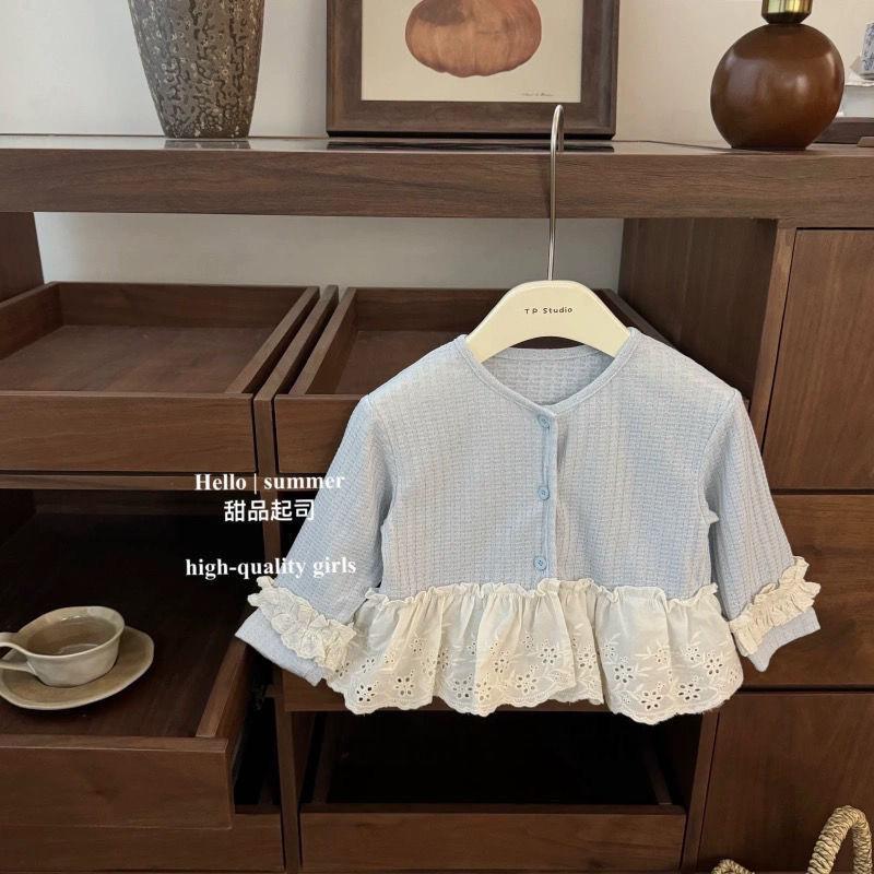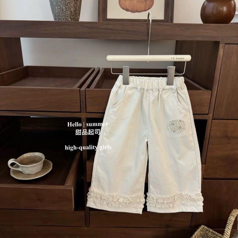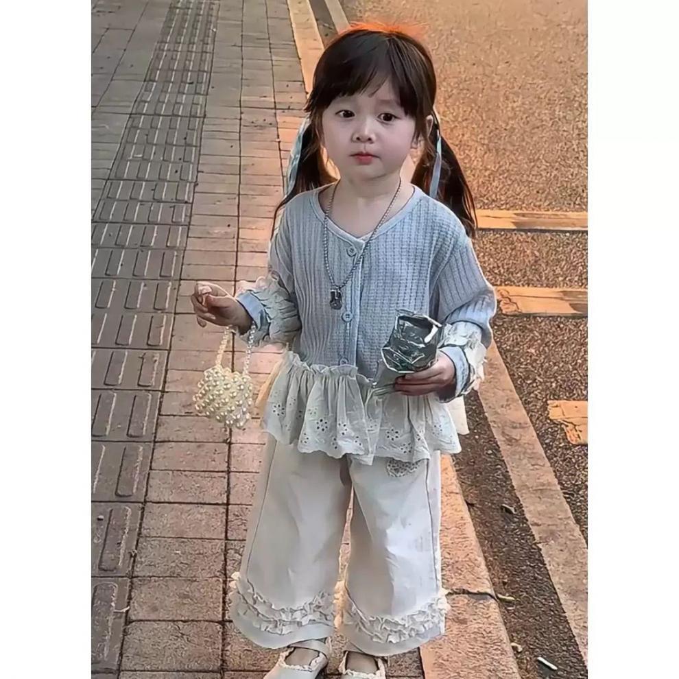 여자 세트 2025 봄 새로운 어린이 서양식 모리 스타일 스티칭 레이스 카디건 케이크 와이드 레그 바지 투피스 세트스토어 가기
