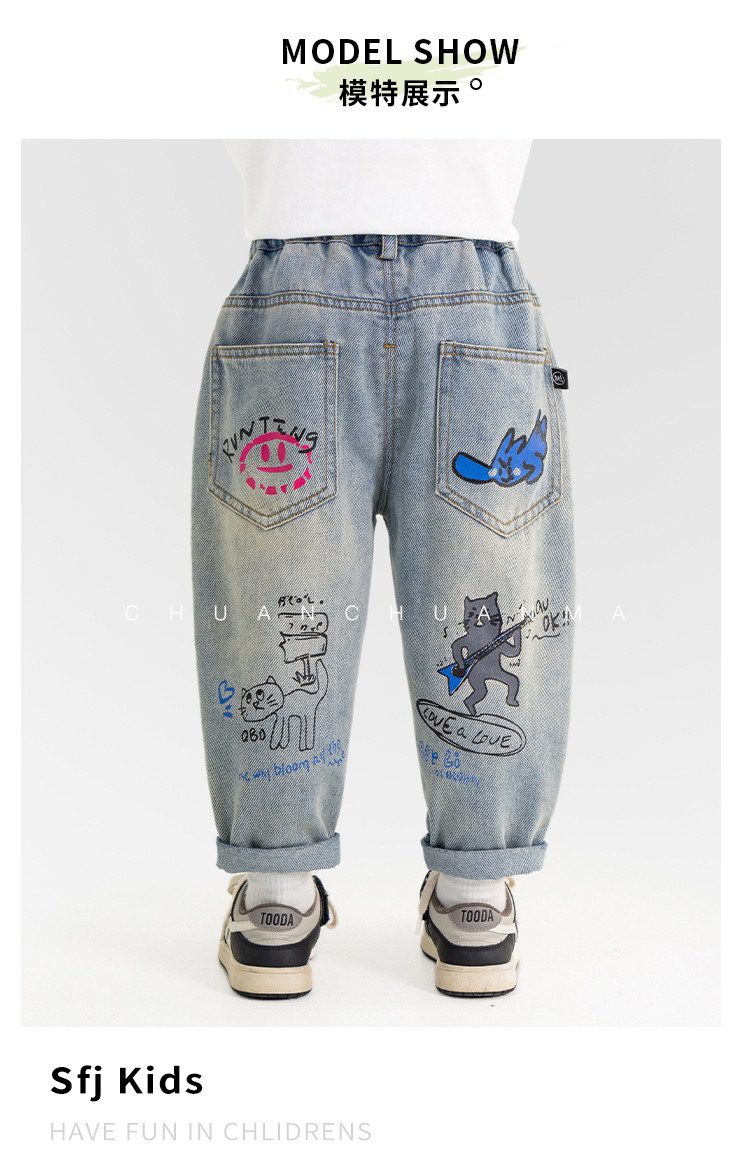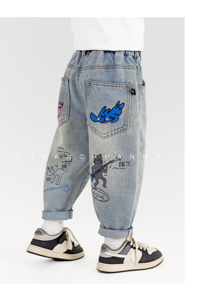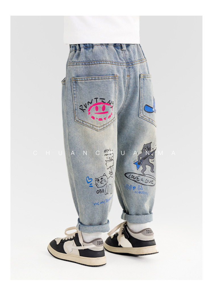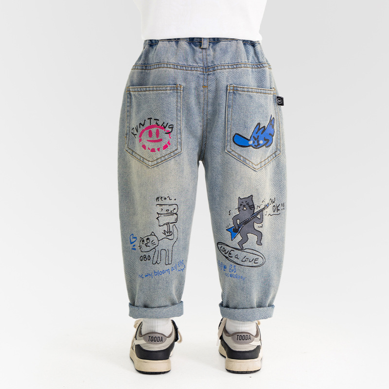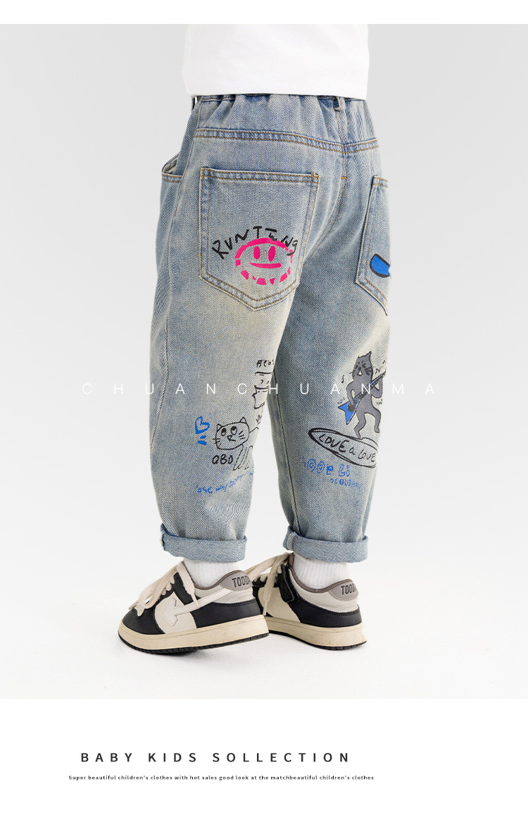 윈드 밸리 2025 봄 새 어린이 바지 한국식 포켓 낙서 청바지 소년 소녀를위한 올매치 트렌디 바지스토어 가기