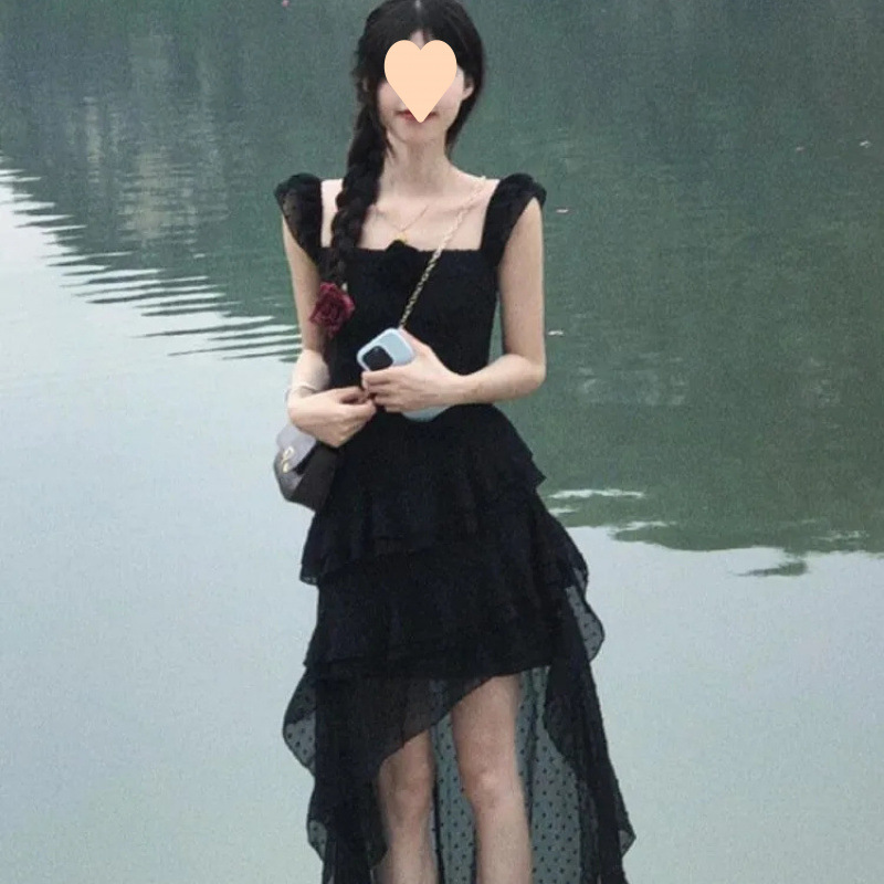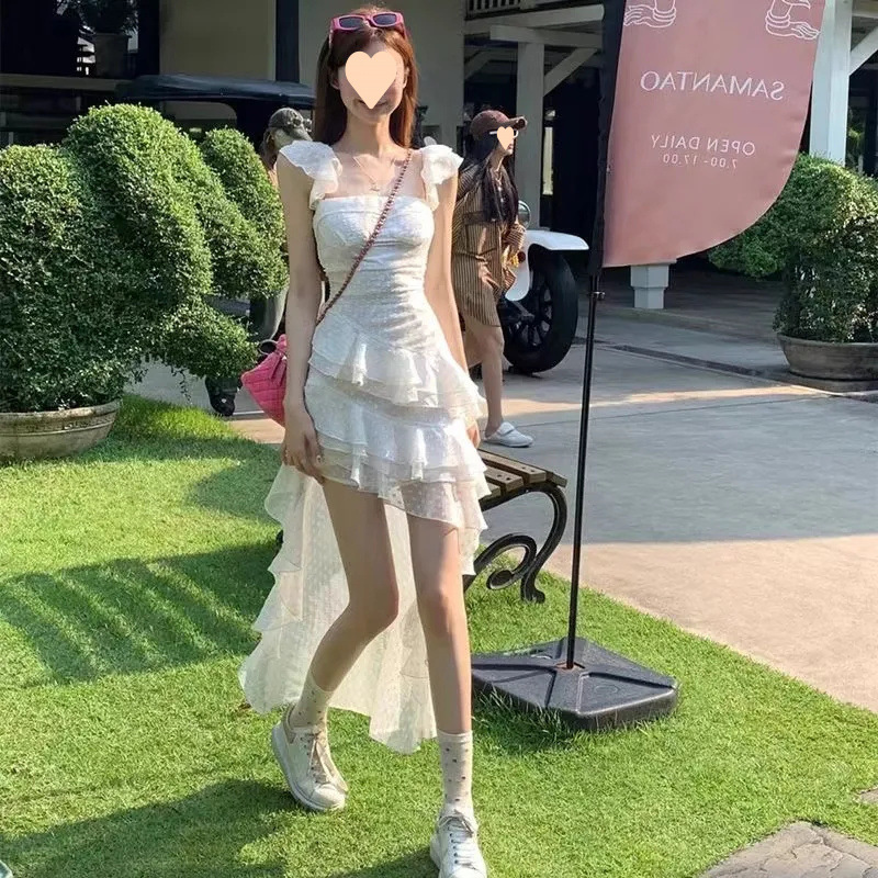 프랑스 스타일 우아한 타이트 허리 원피스 여성 여름 새로운 도착 디자인 불규칙한 러플 슬링 긴 트레일 스커트 트렌디
