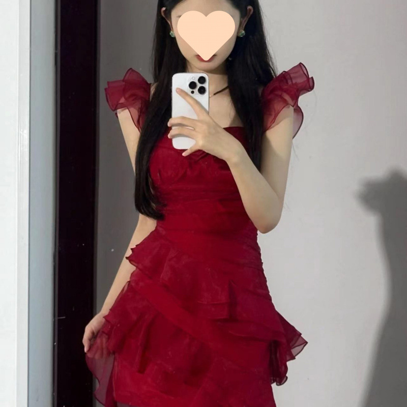 프랑스 스타일 우아한 타이트 허리 원피스 여성 여름 새로운 도착 디자인 불규칙한 러플 슬링 긴 트레일 스커트 트렌디스토어 가기