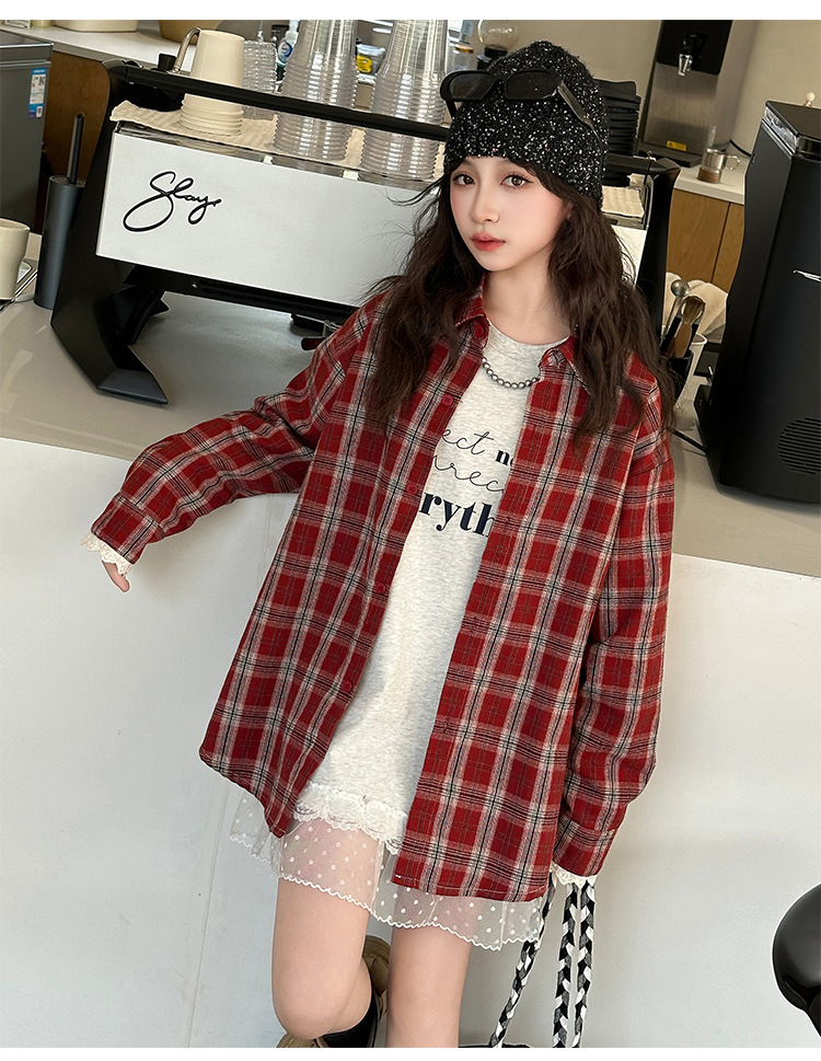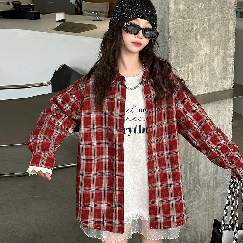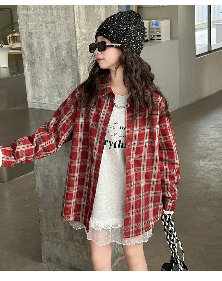 소녀 셔츠 봄과 가을 2025 새로운 어린이 서양 스타일 유행 체크 탑 중 큰 어린이 캐주얼 긴 소매 셔츠