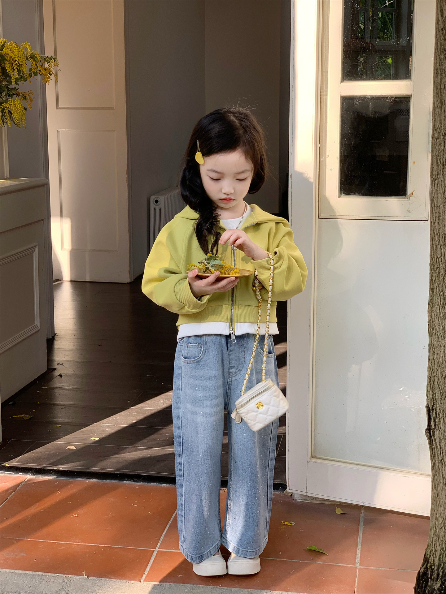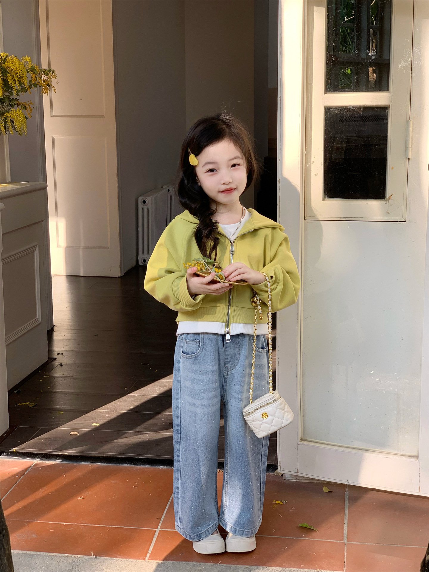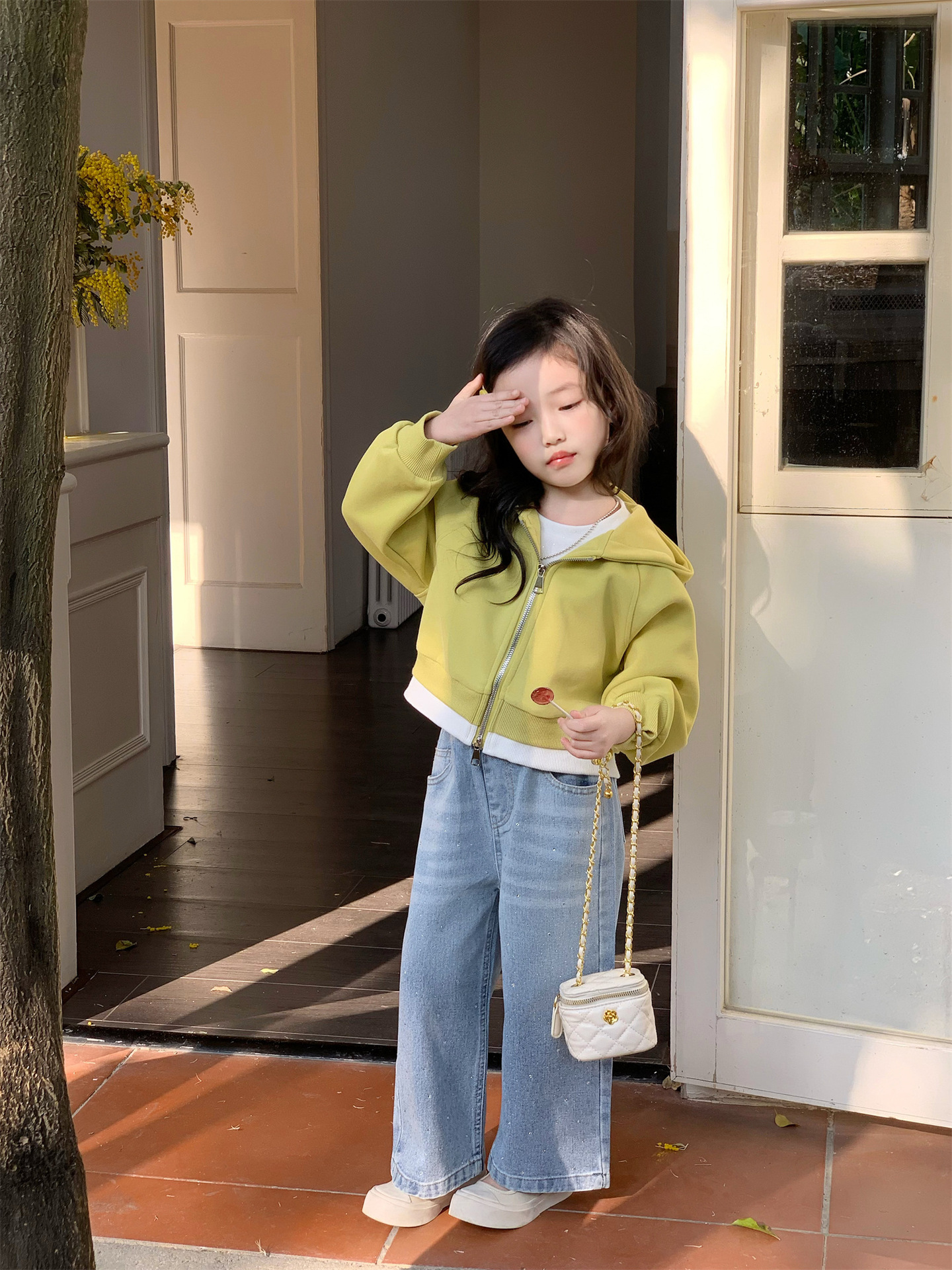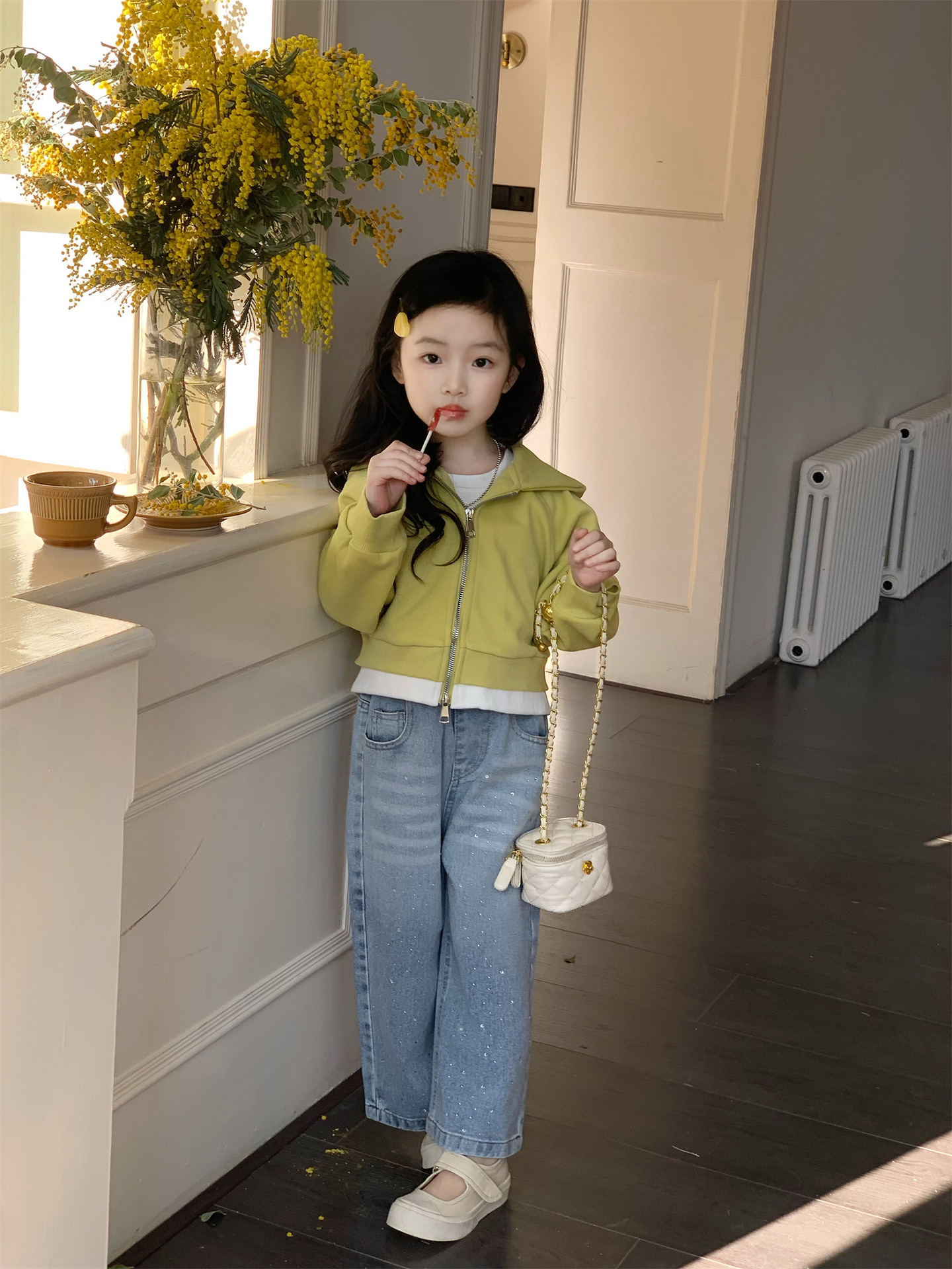 2025 봄 새로운 소녀 외국 스타일 세트 어린이 후드 카디건 코트 핫 드릴링 청바지 투피스 세트스토어 가기