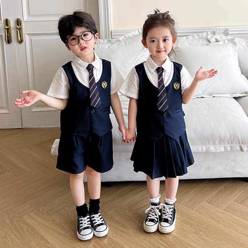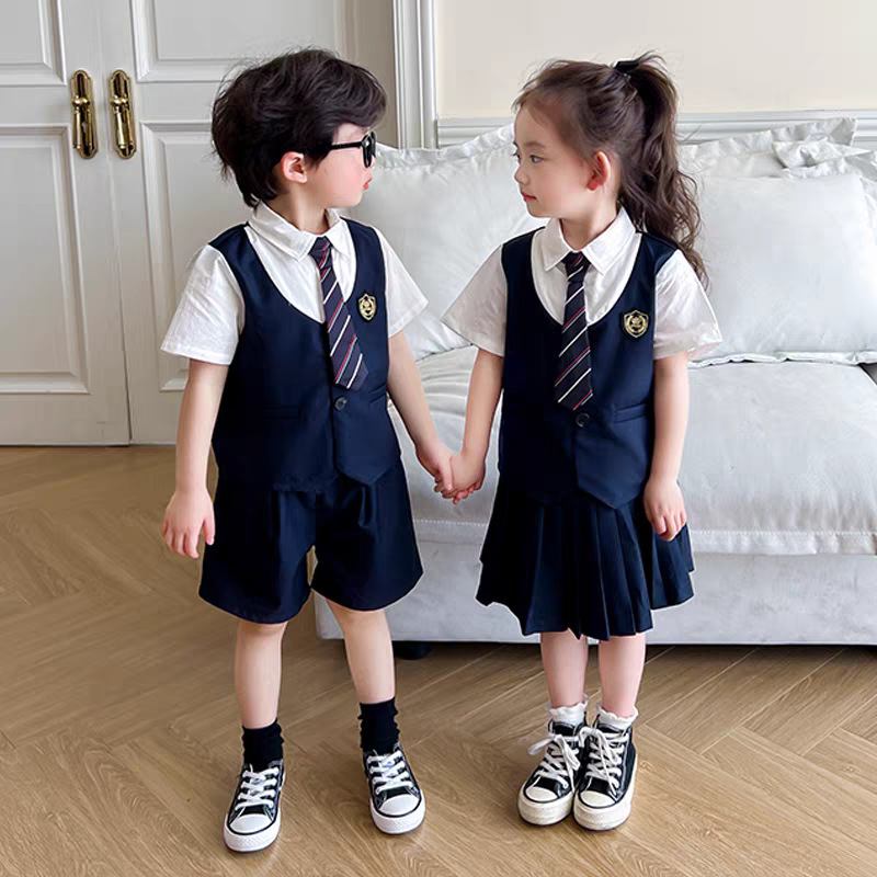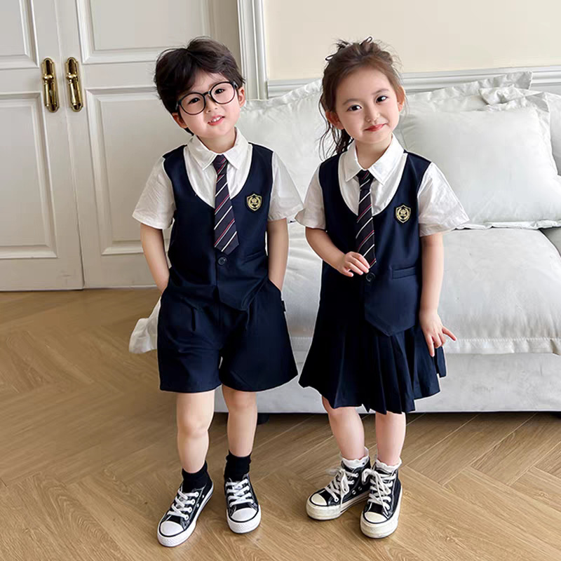 아동복 아카데미 스타일 2025 페이크 투피스 세트 한국식 어린이 원피스 반팔 셔츠 바지 반바지 트렌디