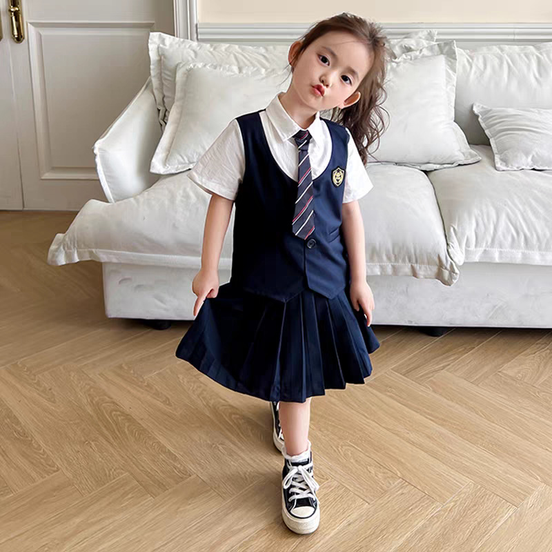 • 배지 여아 페이크 투피스 반팔 슈트(넥타이 포함)
