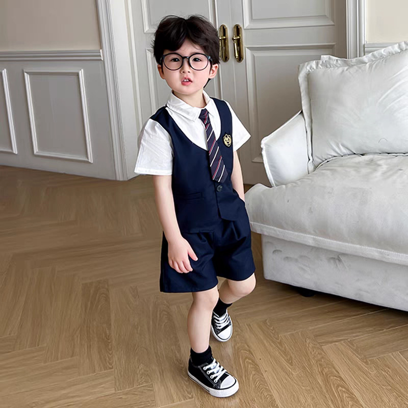 • 배지 남아용 페이크 투피스 반팔 슈트(넥타이 포함)