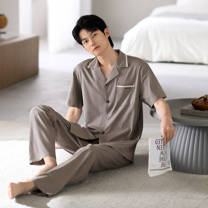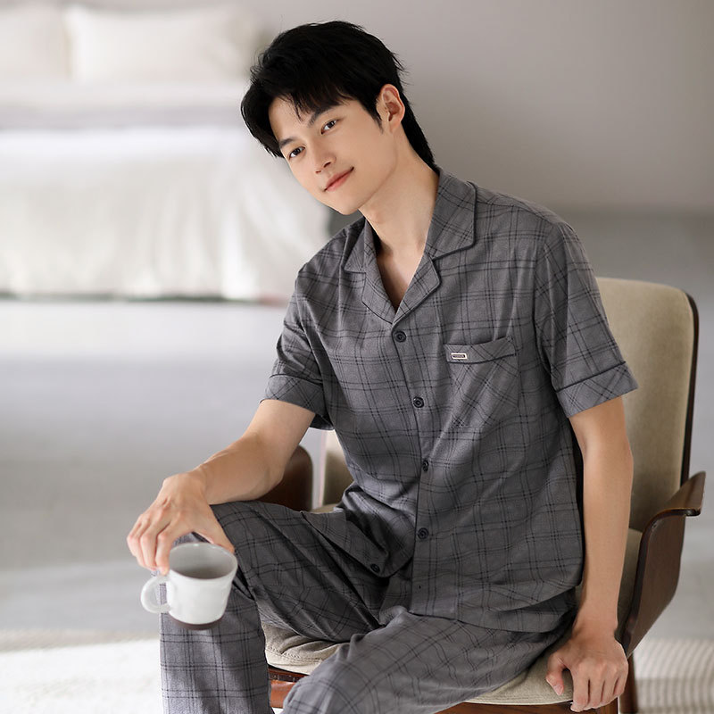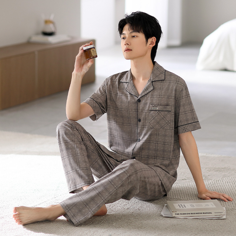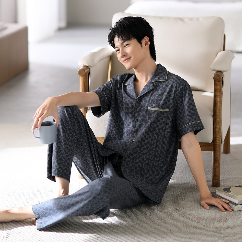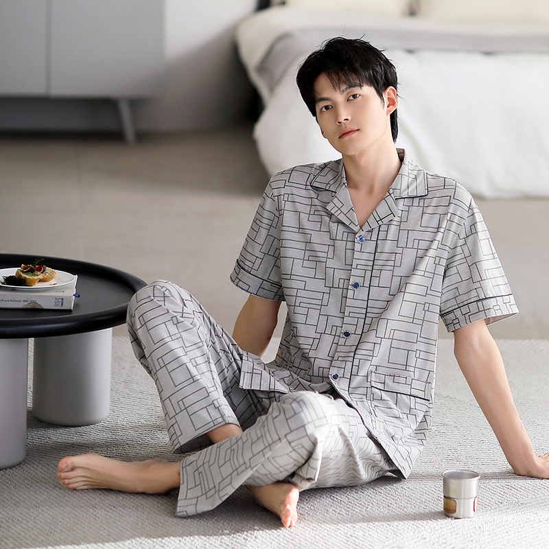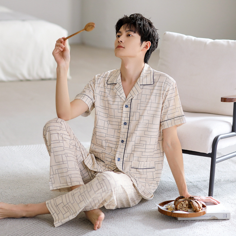 남자 잠옷 봄과 여름 순면 반팔 카디건 세트 플러스 사이즈 캐주얼 루즈 남성용 소프트 코튼 홈 의류스토어 가기