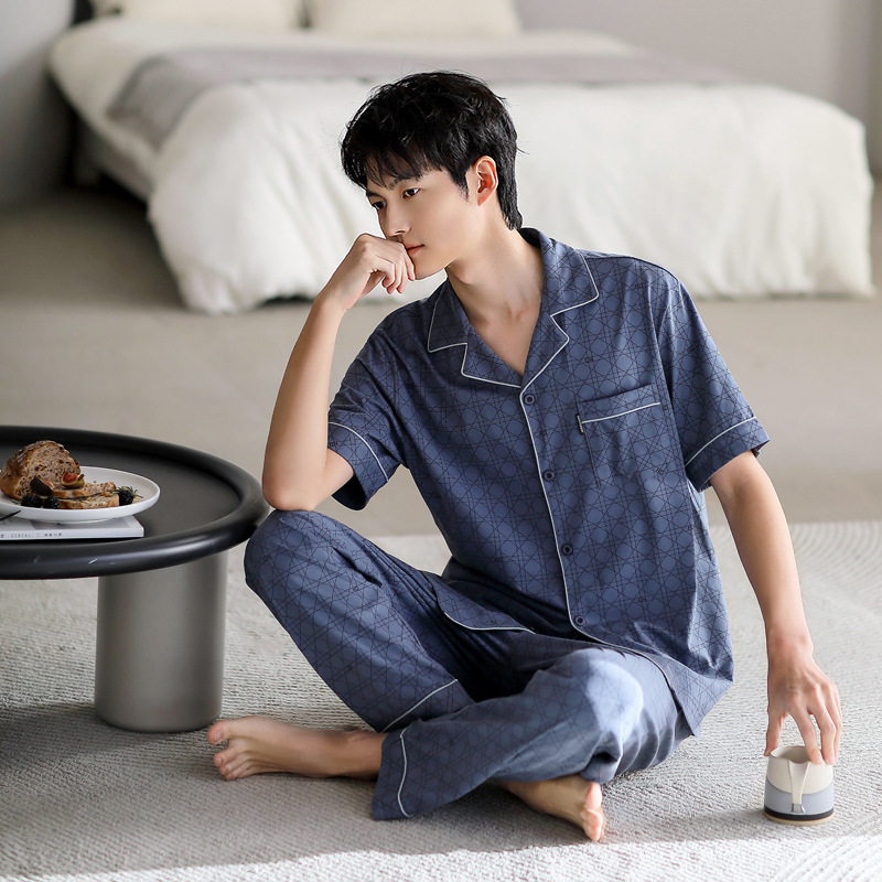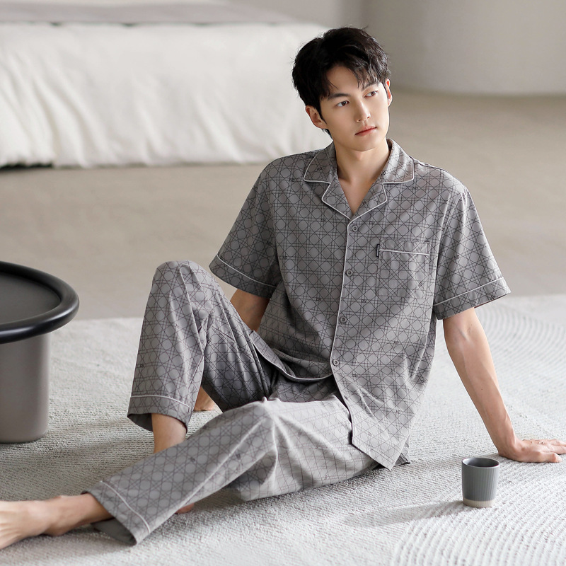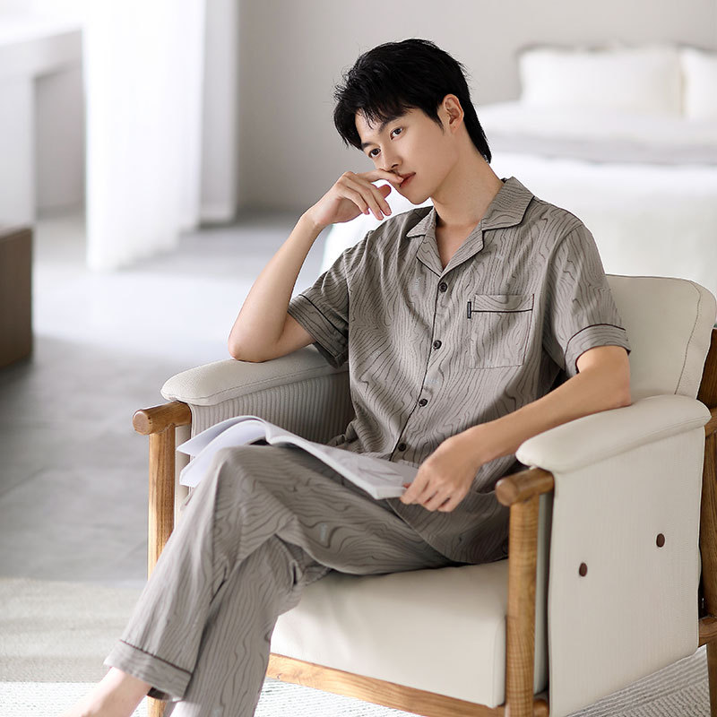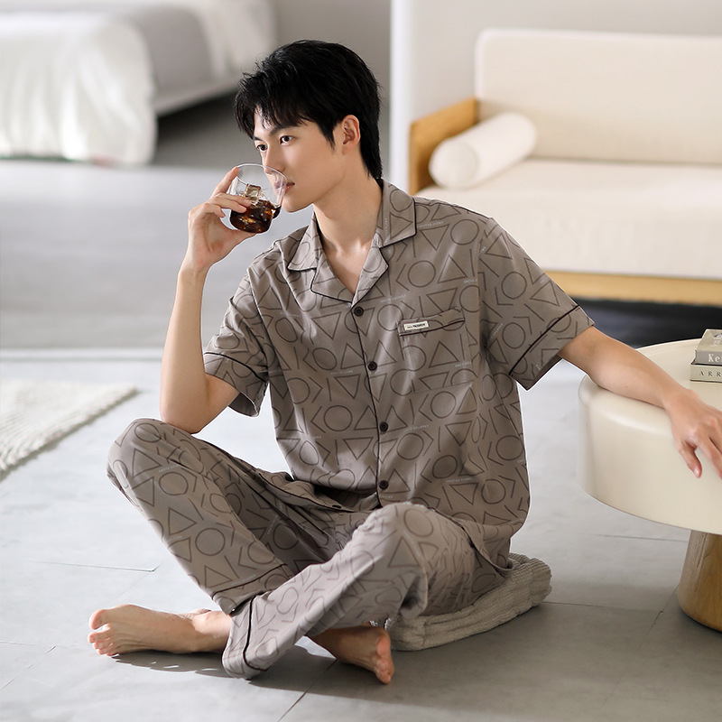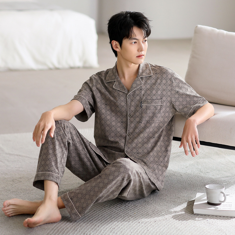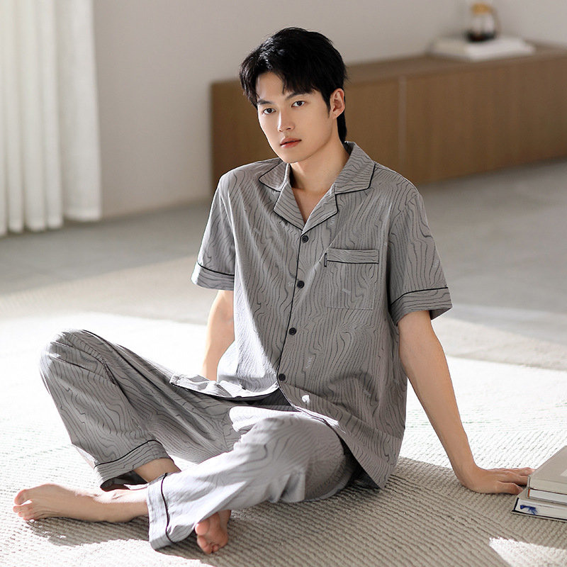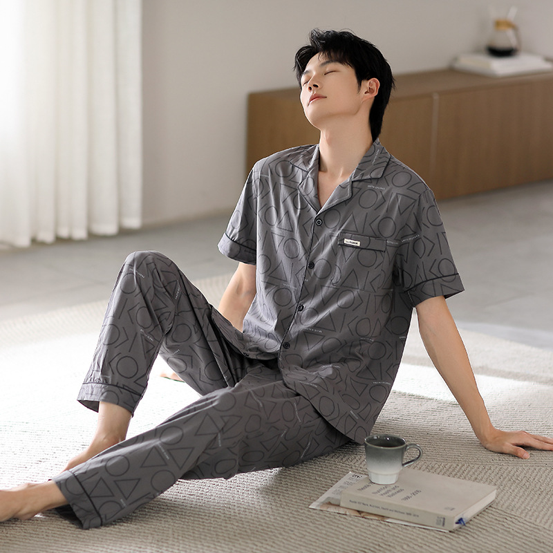 남자 잠옷 봄과 여름 순면 반팔 카디건 세트 플러스 사이즈 캐주얼 루즈 남성용 소프트 코튼 홈 의류스토어 가기