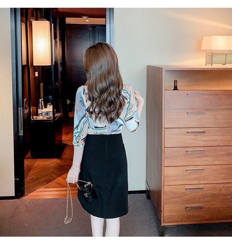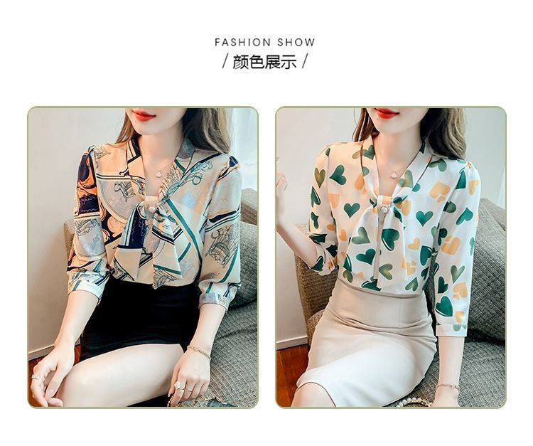 2025 봄과 여름 세븐 포인트 슬리브 프린트 쉬폰 셔츠 여성 디자인 센스 보우 올매치 우아한 반팔 탑 트렌디스토어 가기