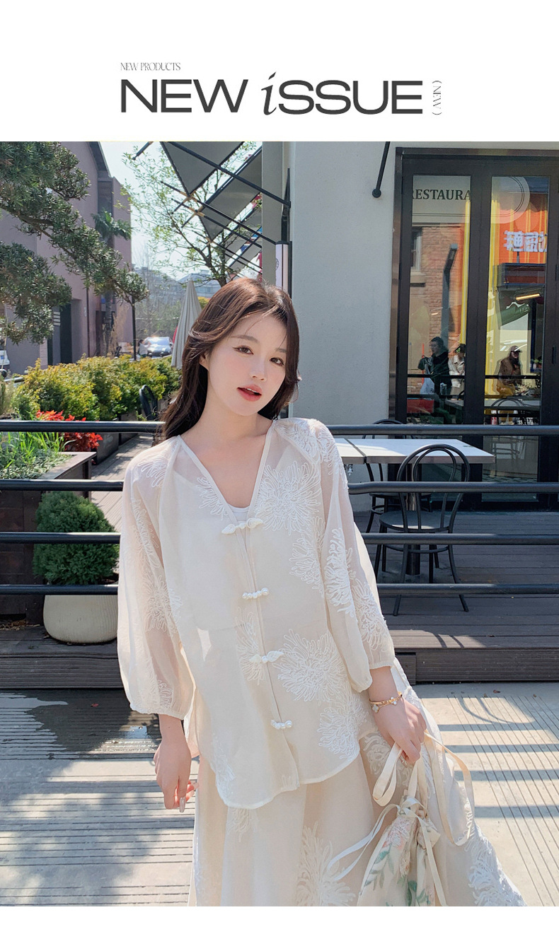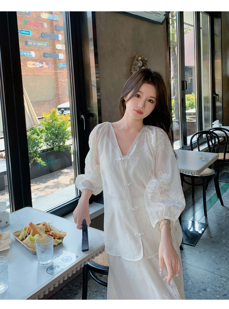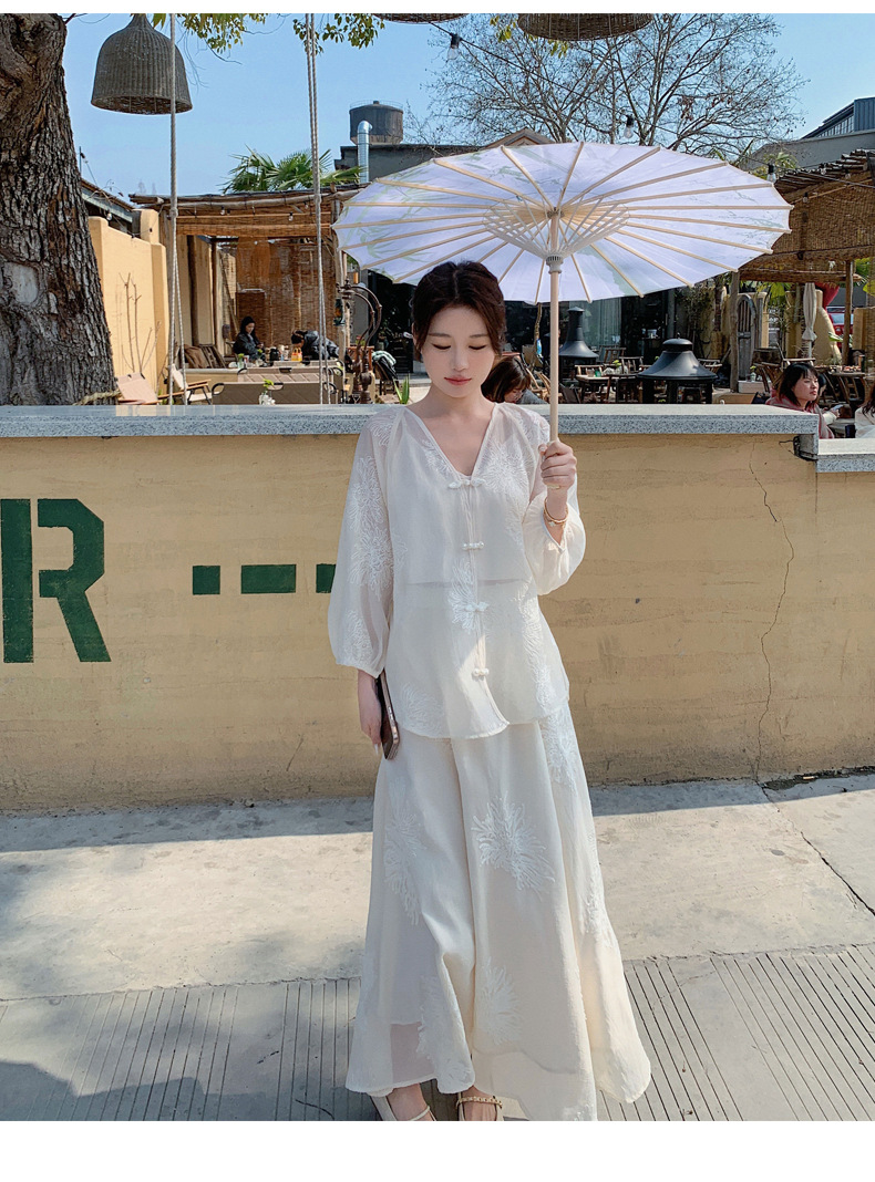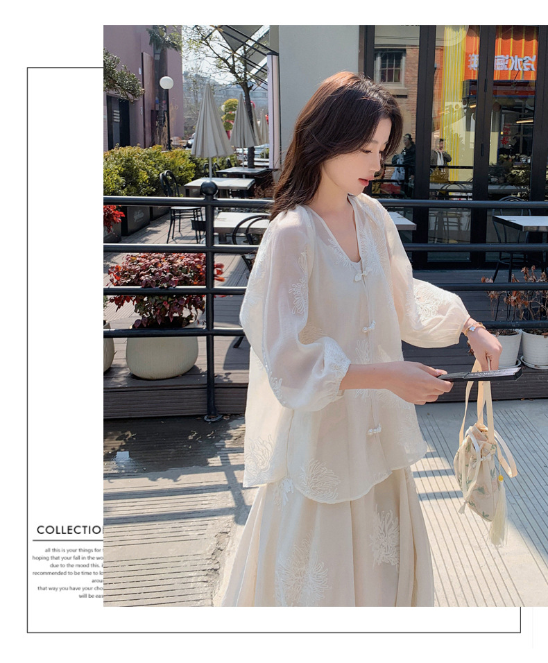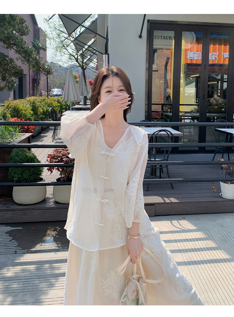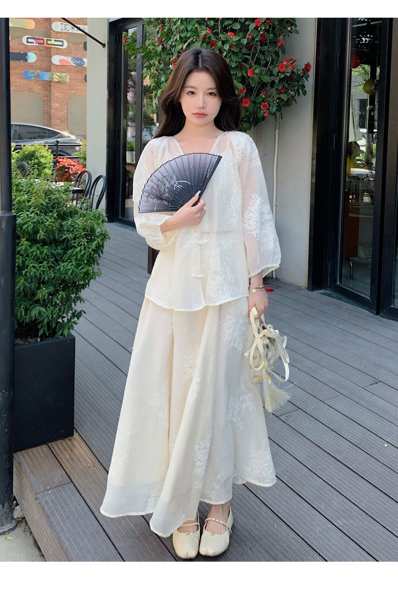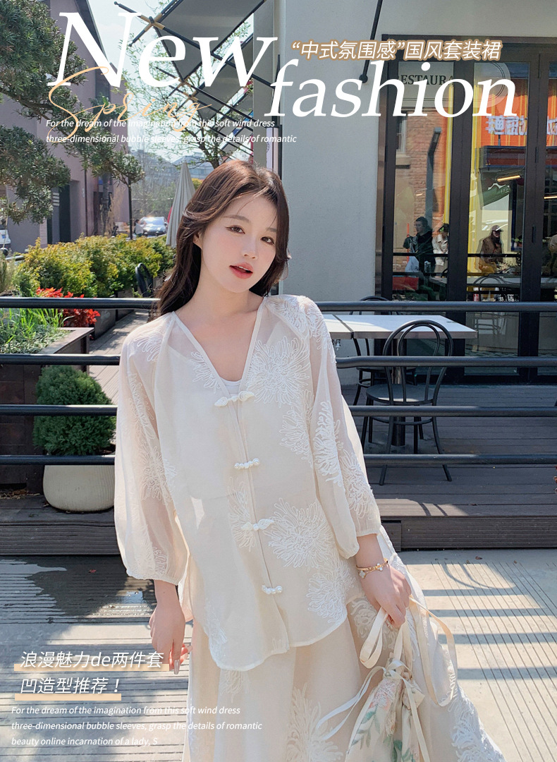 [멩메이] 25 봄 스타일 새로운 중국 선 스크린 셔츠 자수 화이트 셔츠 국가 스타일 세트 스커트 투피스 세트스토어 가기