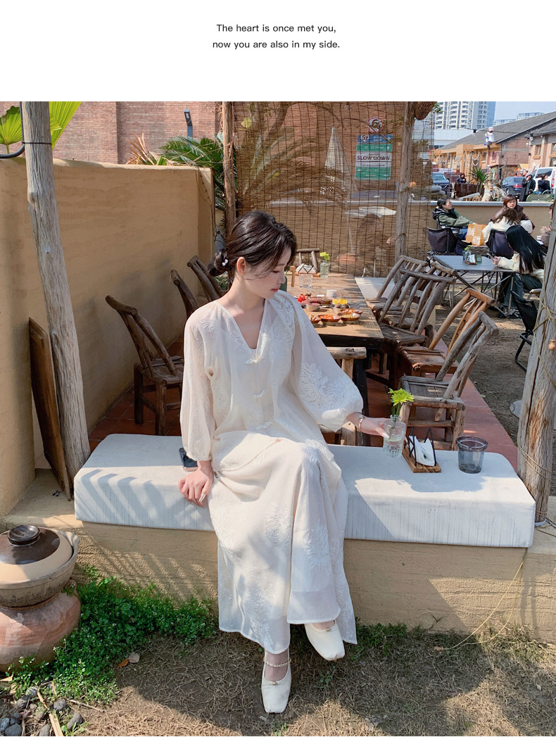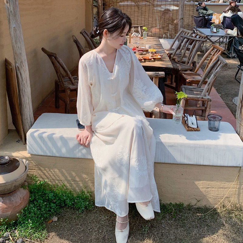 [멩메이] 25 봄 스타일 새로운 중국 선 스크린 셔츠 자수 화이트 셔츠 국가 스타일 세트 스커트 투피스 세트