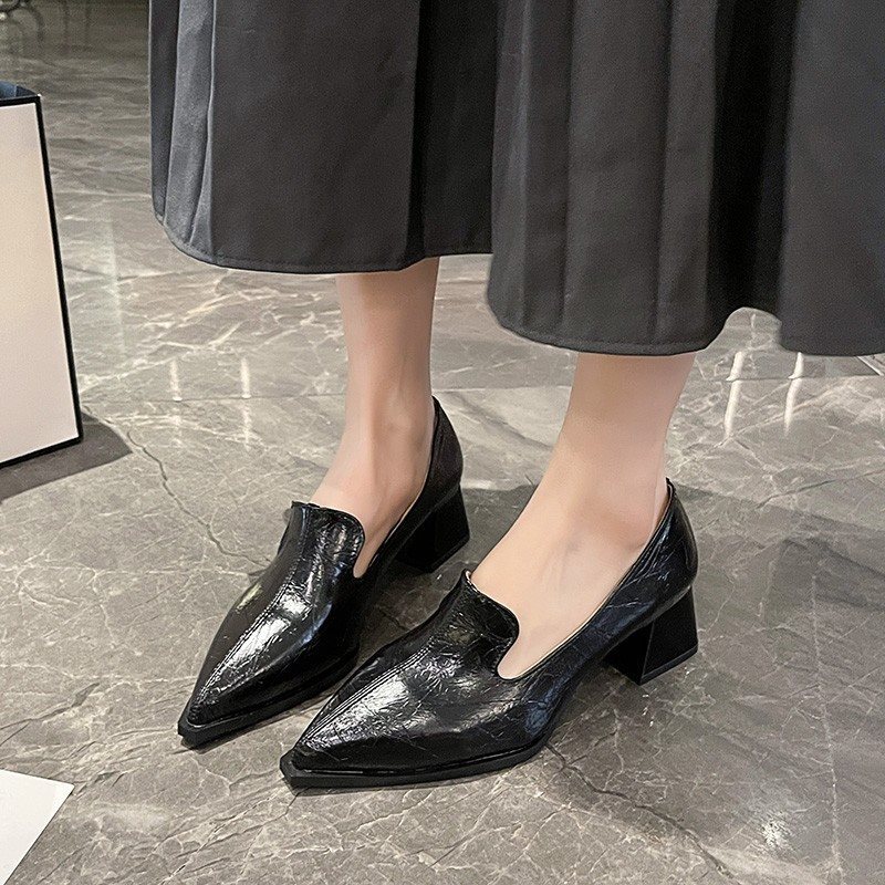 패션 청키 발 뒤꿈치 작은 가죽 신발 뾰족한 발가락 낮은 입 단일 신발 하이힐 여성 pu 가죽 2025 균열 영국 스타일 봄 새로운스토어 가기