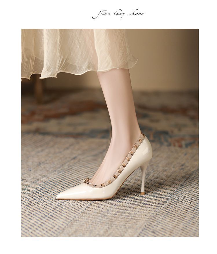 얕은 리벳 하이힐 2024 새로운 올 매치 폭발 플랫 페이턴트 가죽 사이드 빈 섹시한 프렌치 뾰족한 싱글 슈즈