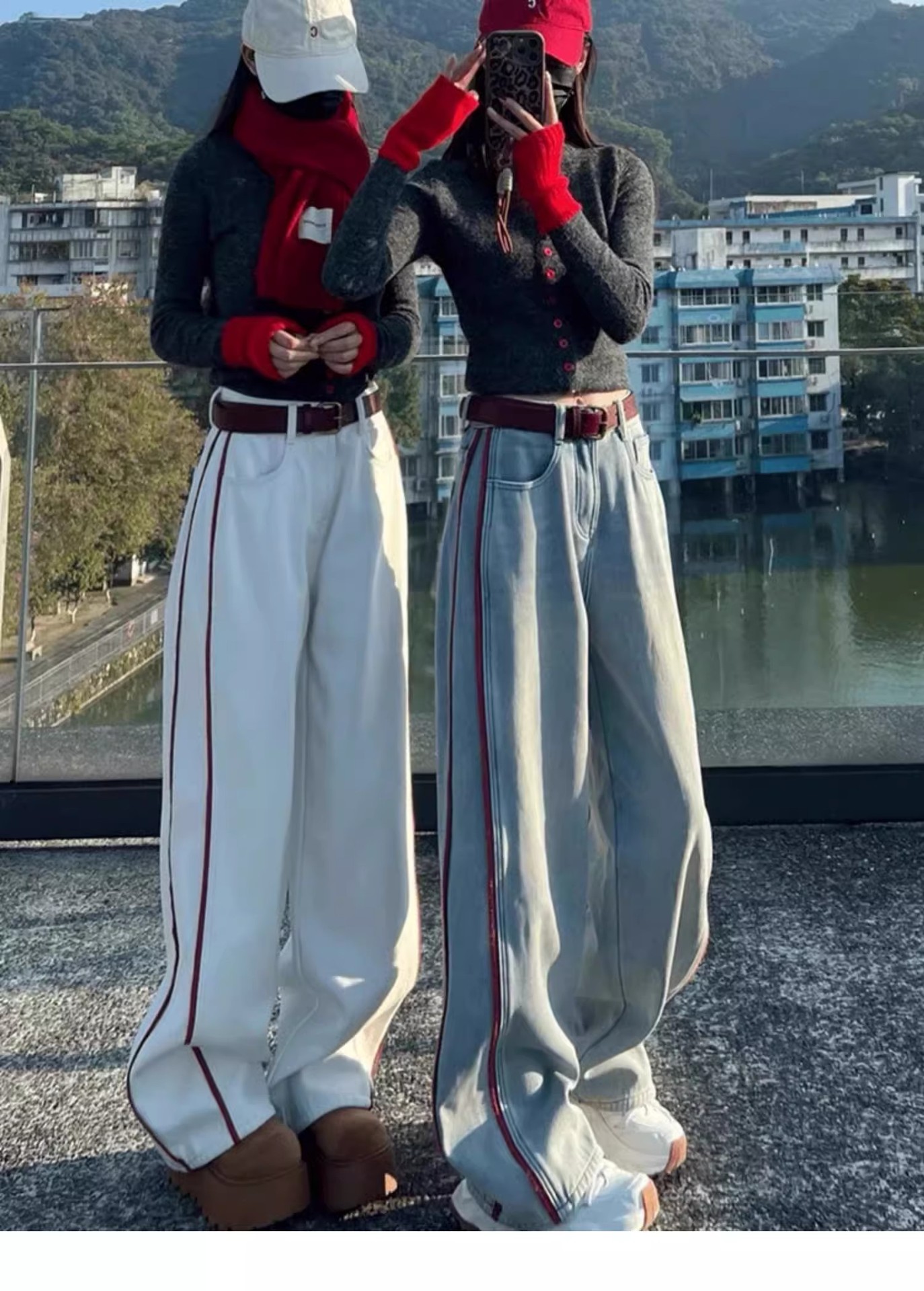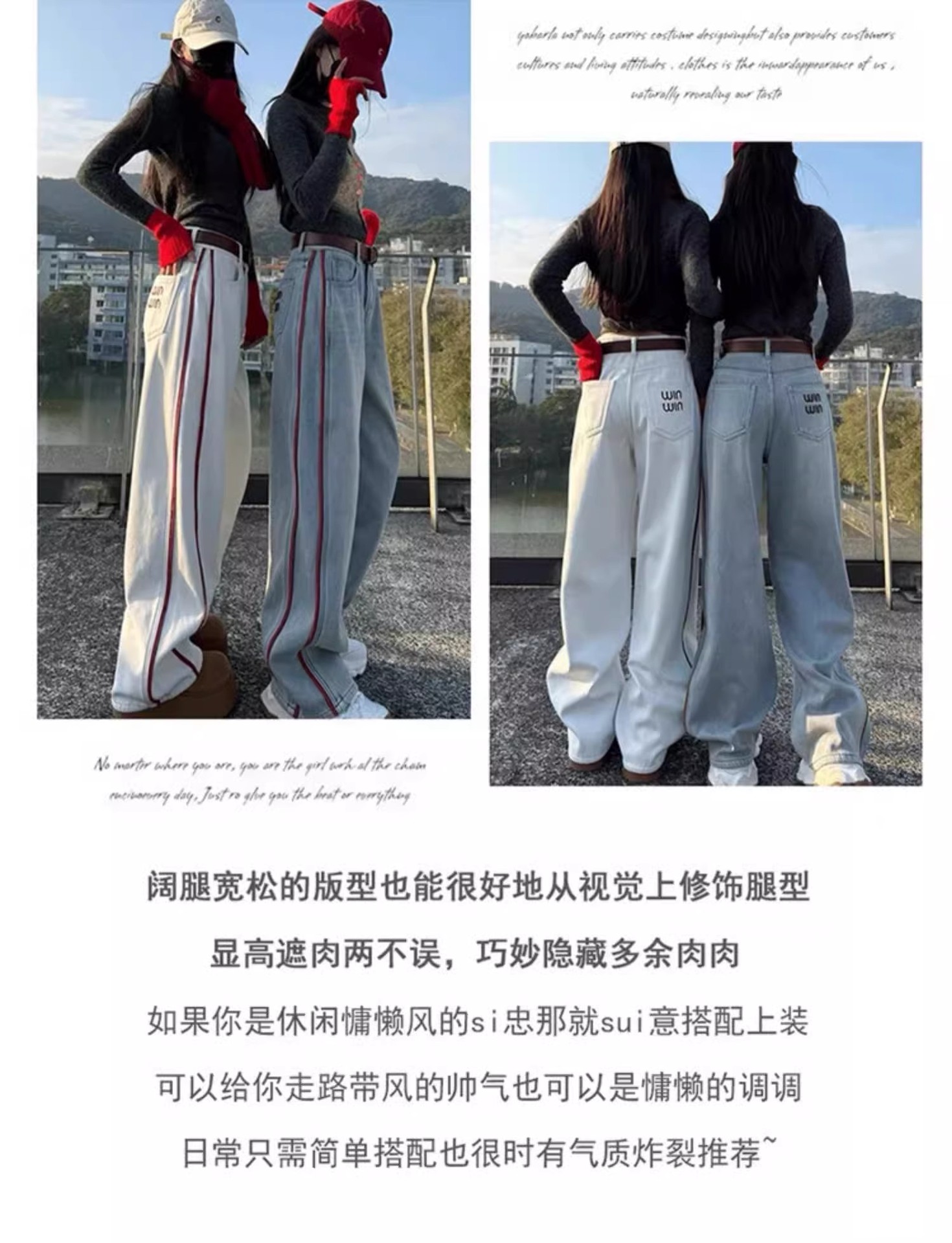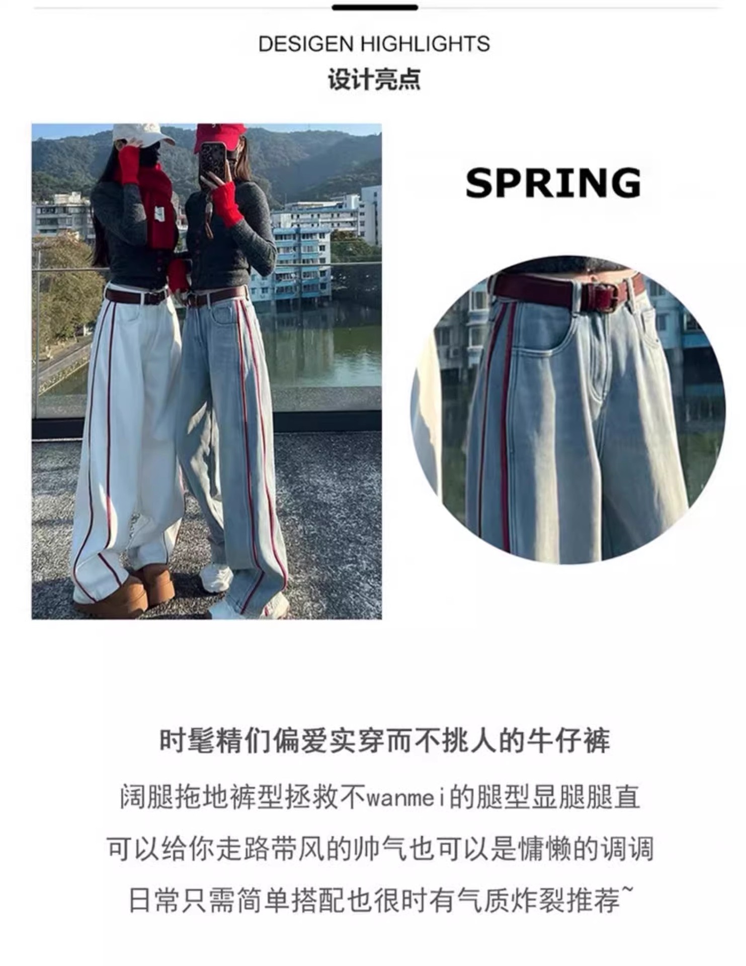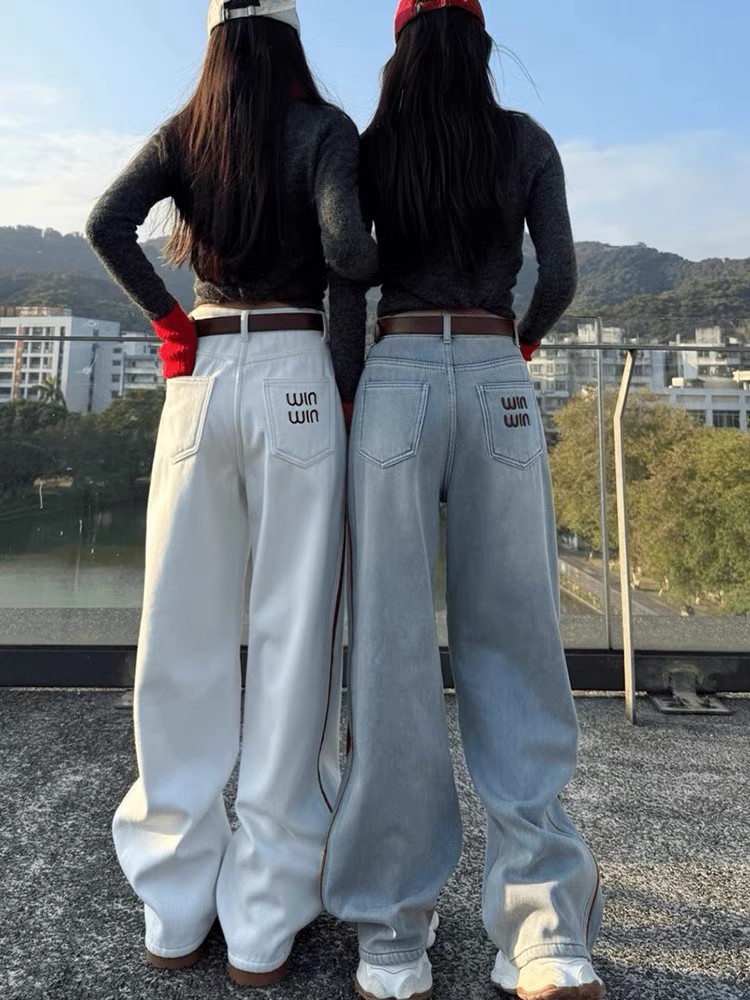 미국 밝은 색상의 하이 웨이스트 투 바 와이드 레그 청바지 여성의 봄과 가을 디자인 감각 느슨한 슬림 핏 행 아웃 바지스토어 가기