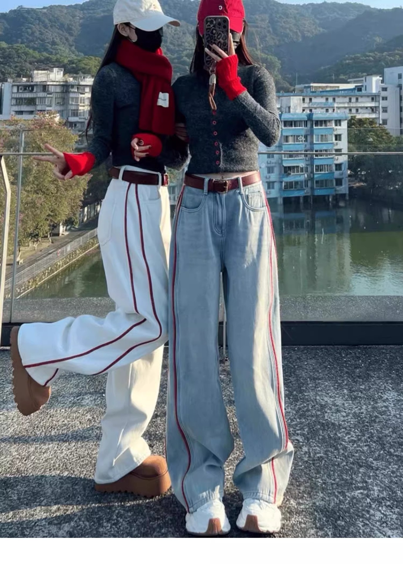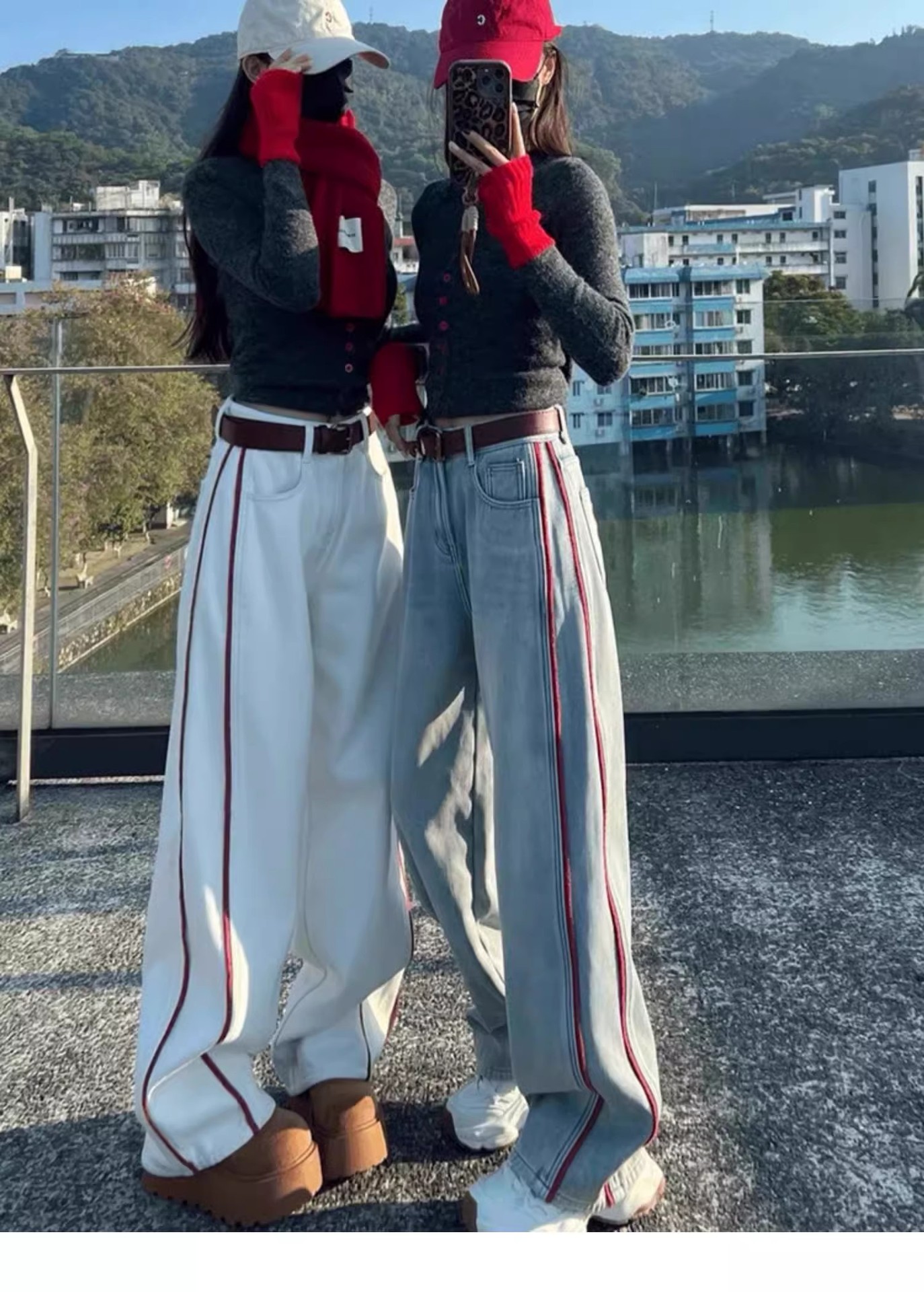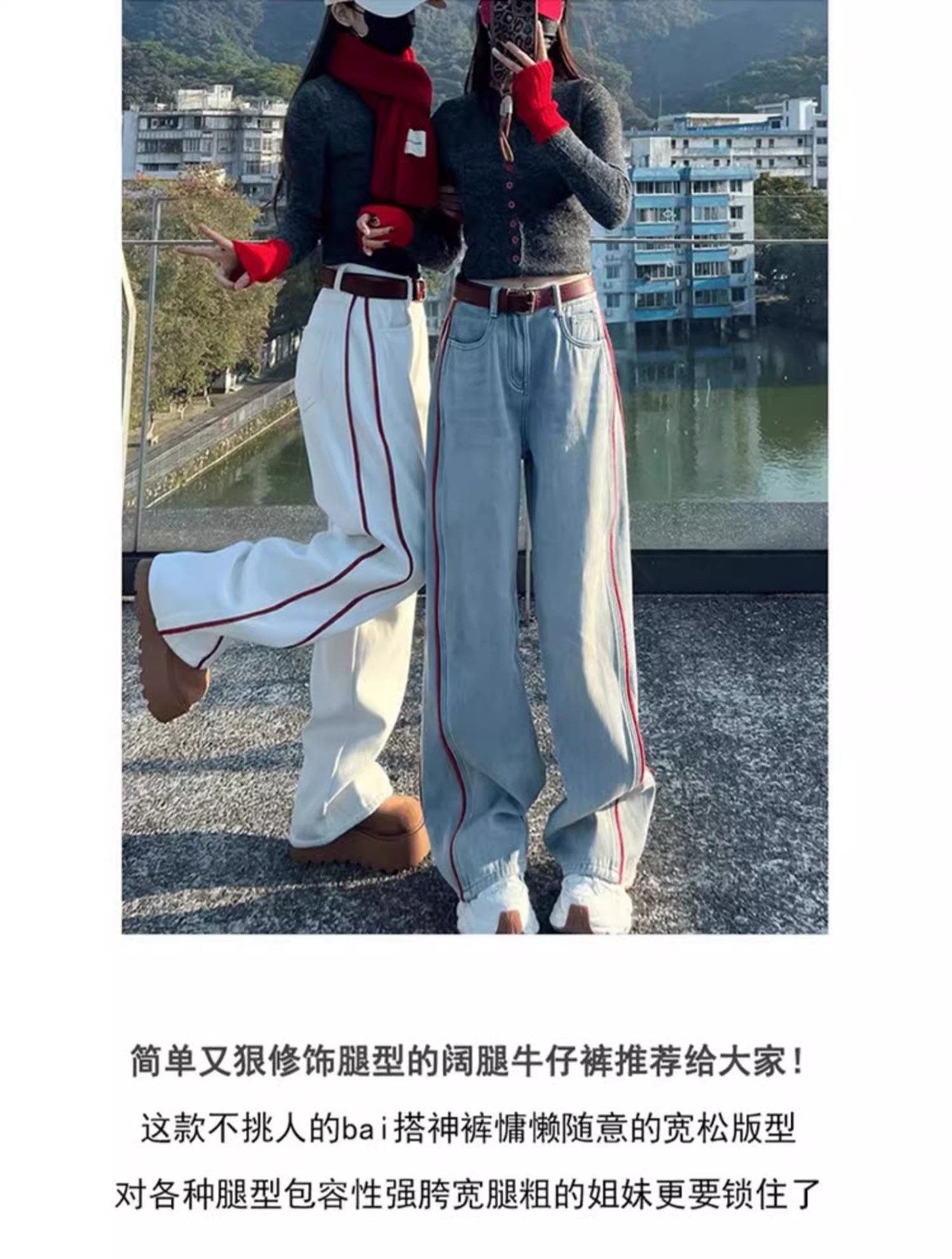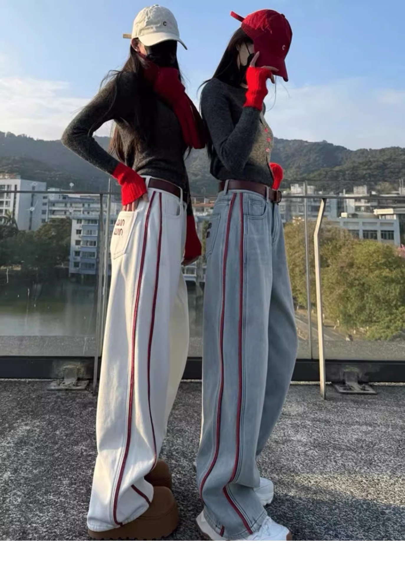 미국 밝은 색상의 하이 웨이스트 투 바 와이드 레그 청바지 여성의 봄과 가을 디자인 감각 느슨한 슬림 핏 행 아웃 바지스토어 가기