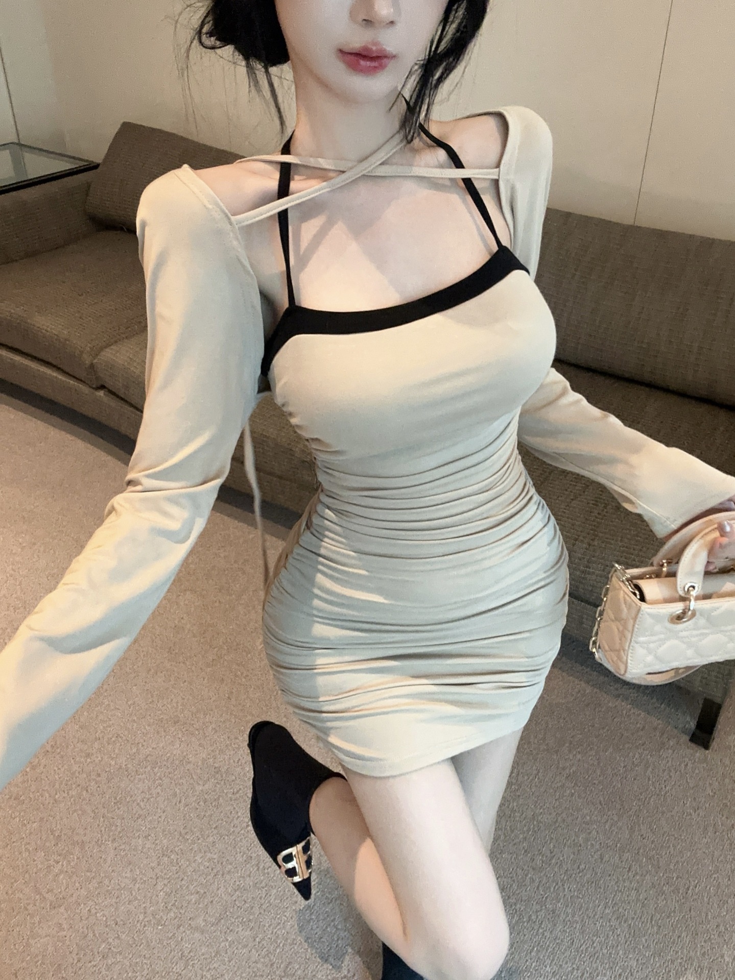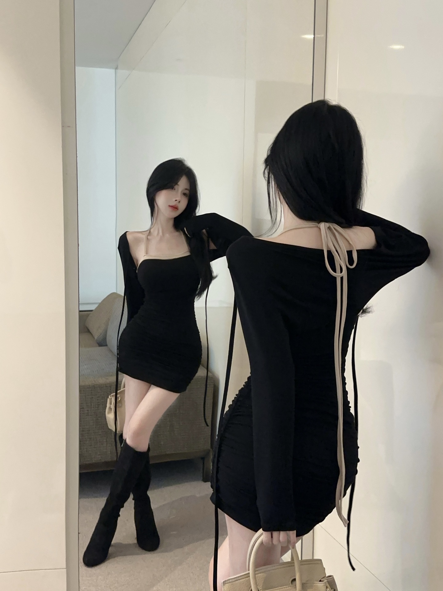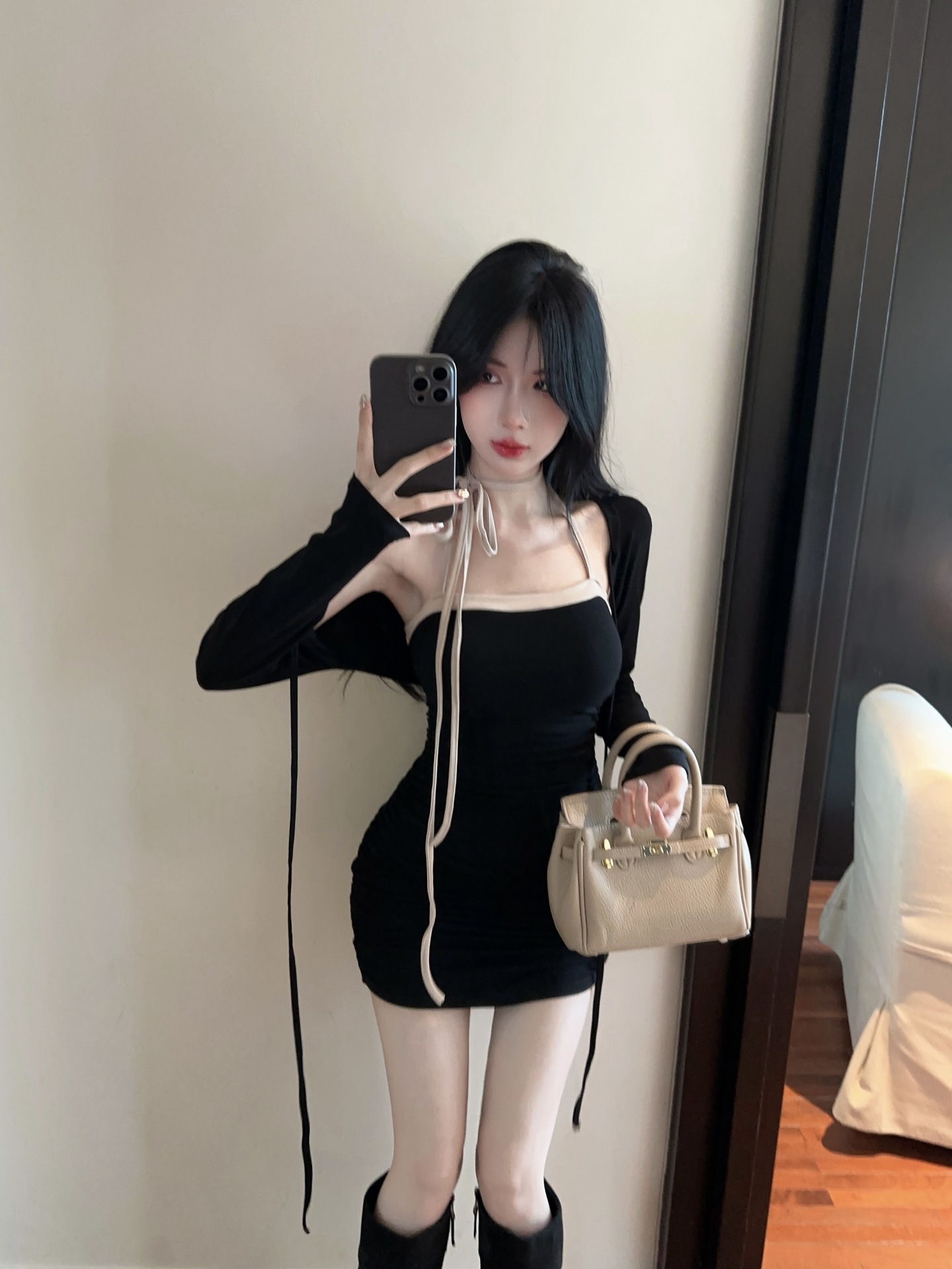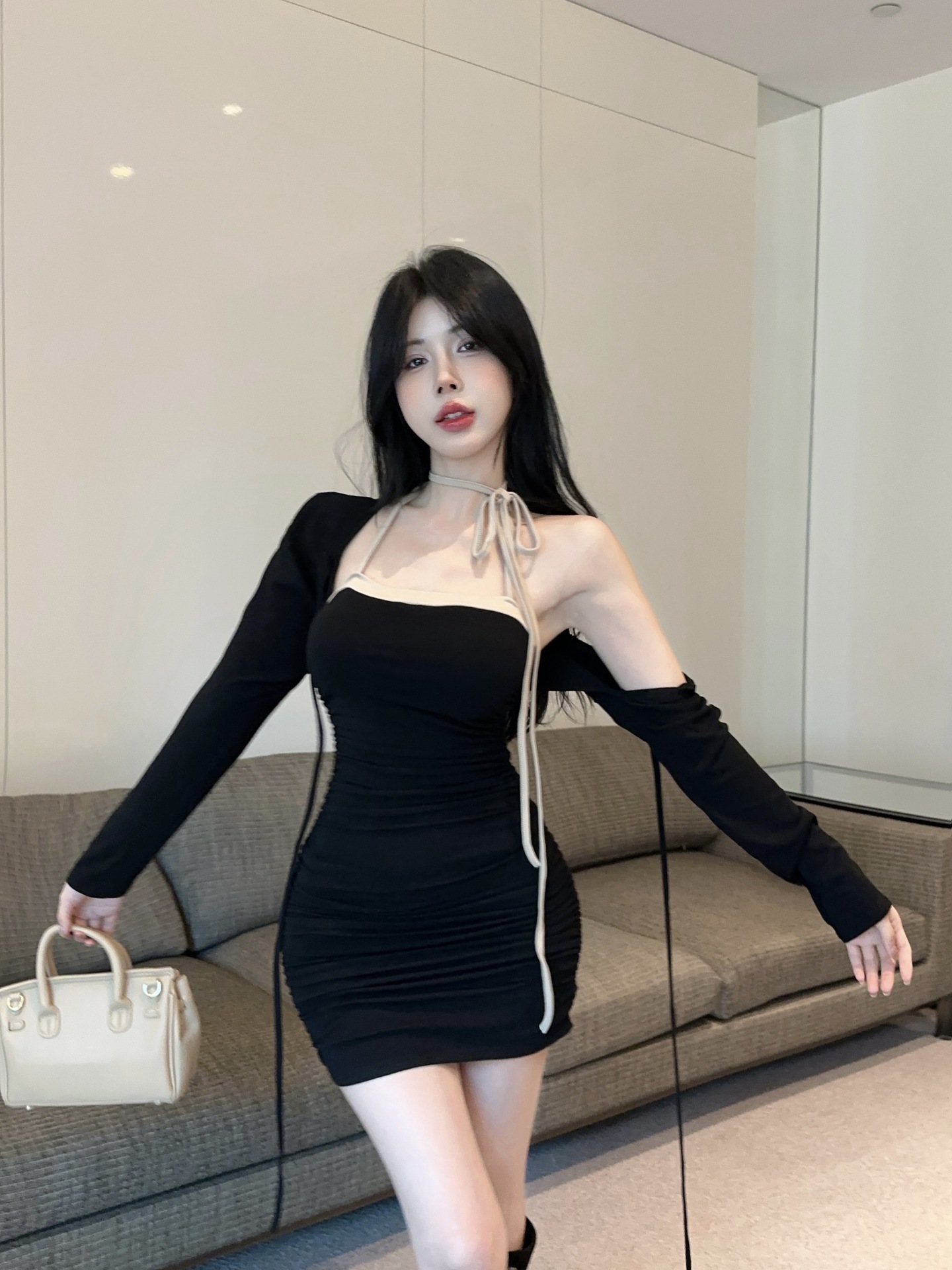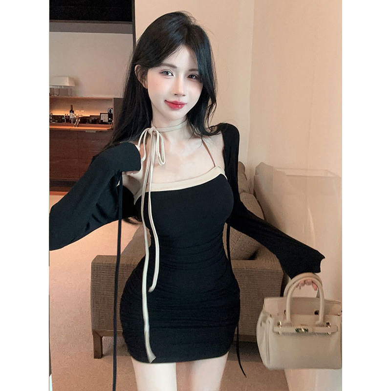 리얼 샷 디자인 센스 컬러 매칭 테더 멀티 웨어 방법 백 힙 서스펜더 원피스 긴 소매 짧은 탑 투피스 세트스토어 가기