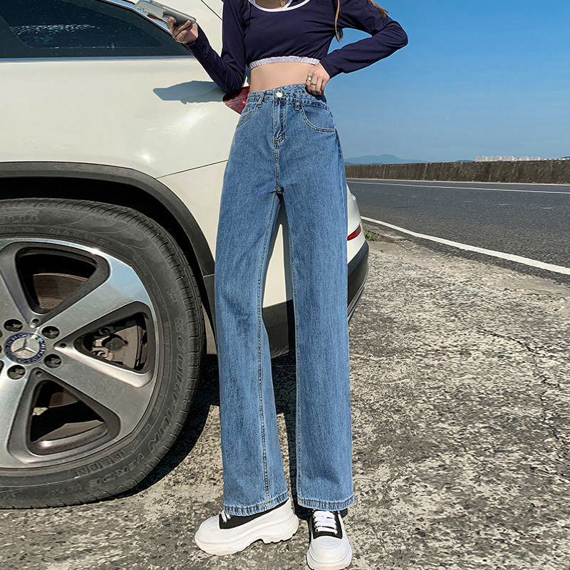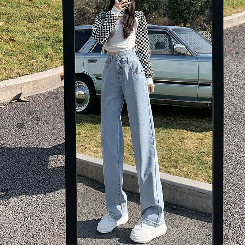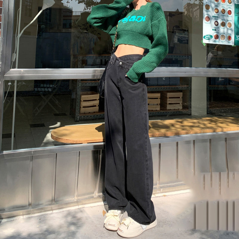 검은 회색 틈새 청바지 여성의 불규칙한 버클 디자인 작은 직선 높은 허리 배 모양의 넓은 다리 바지스토어 가기