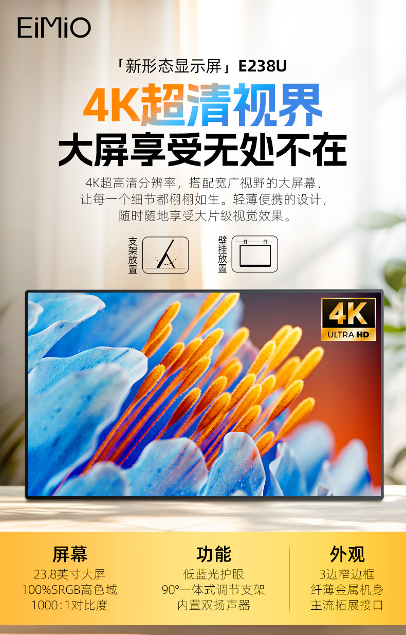 EIMIO 23.8 "4K 휴대용 디스플레이 사무실 IPS 대형 스크린 게임 컴퓨터 확장 보조 화면 IPS 화면스토어 가기