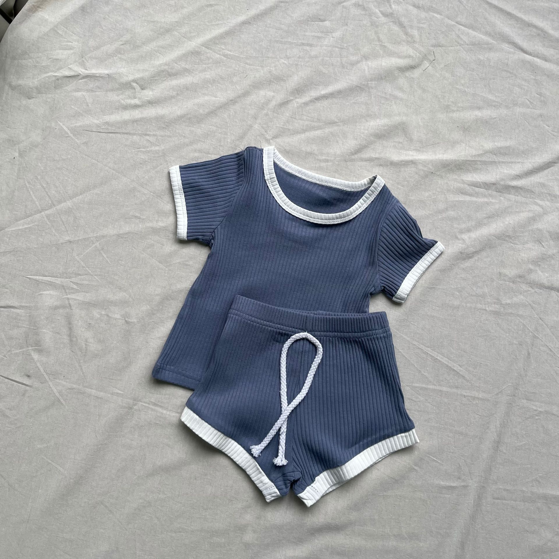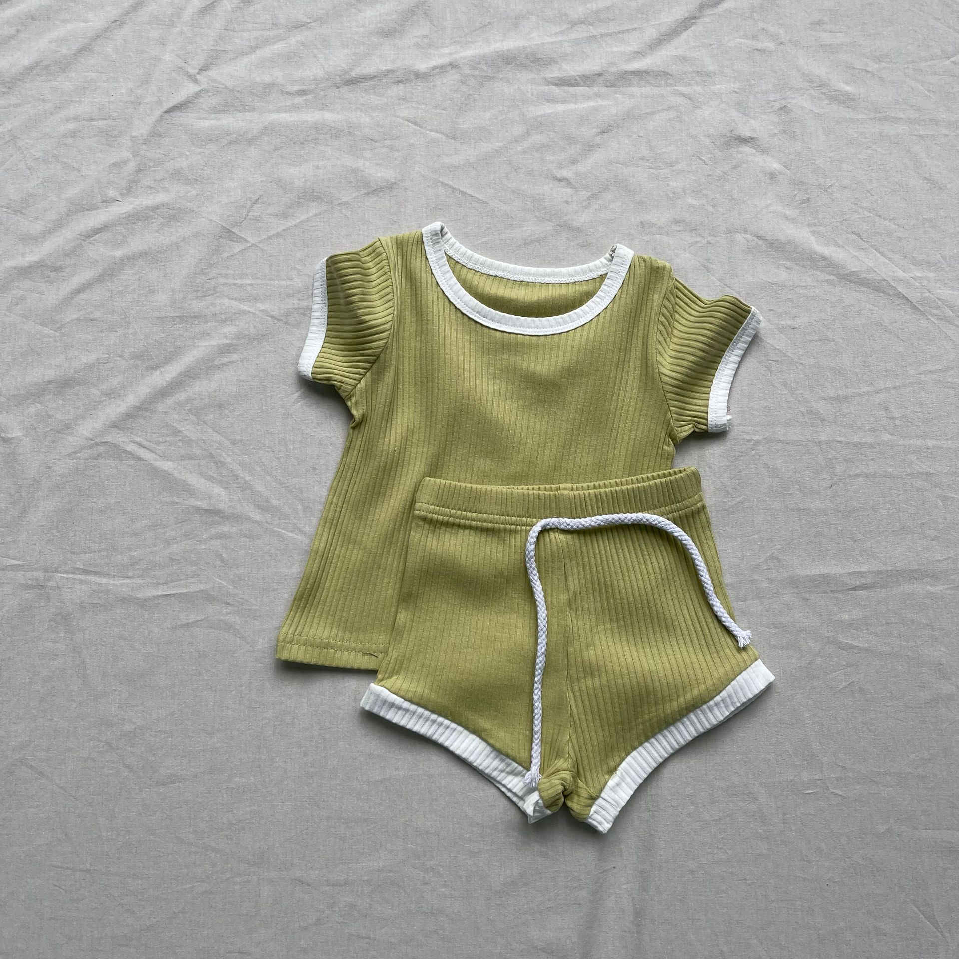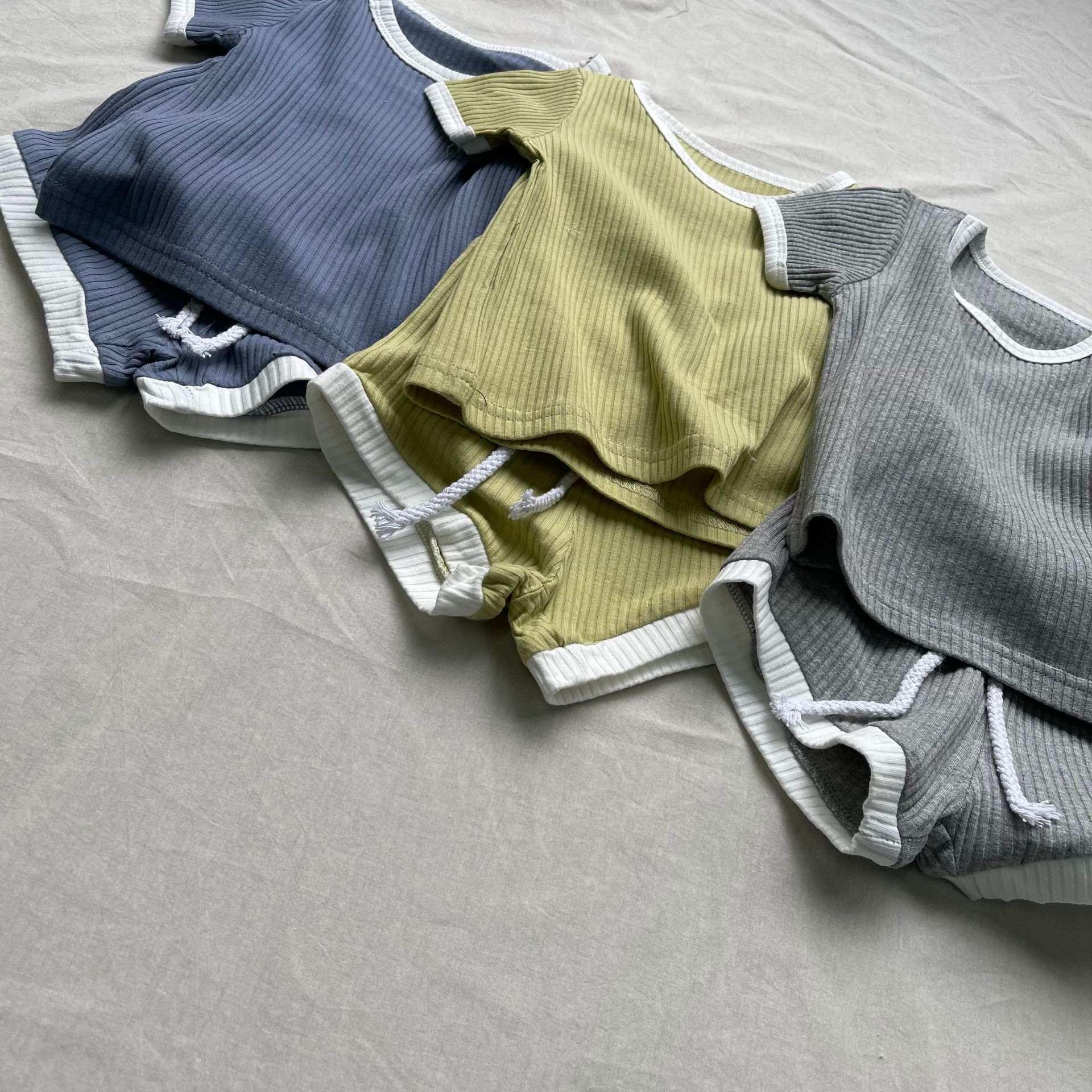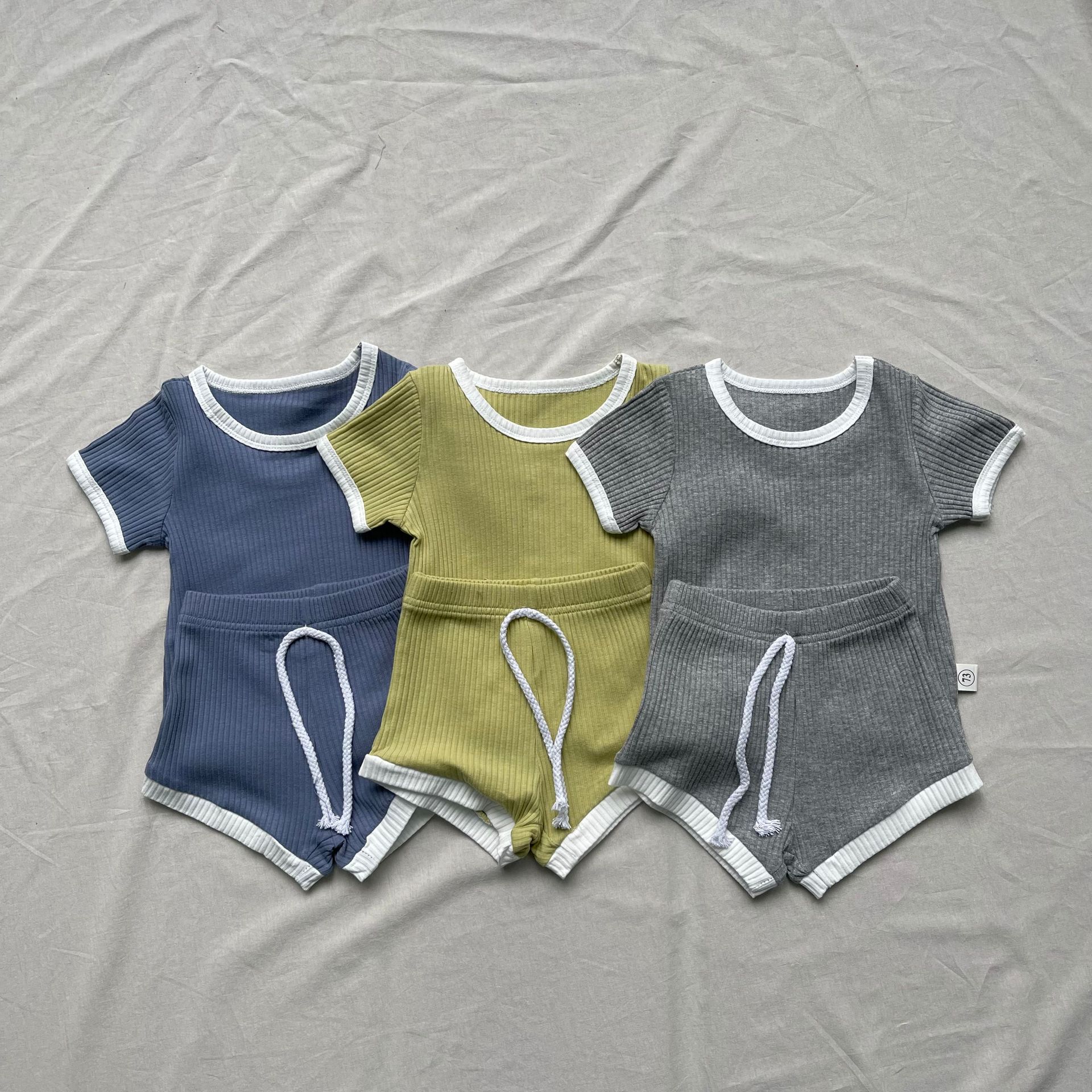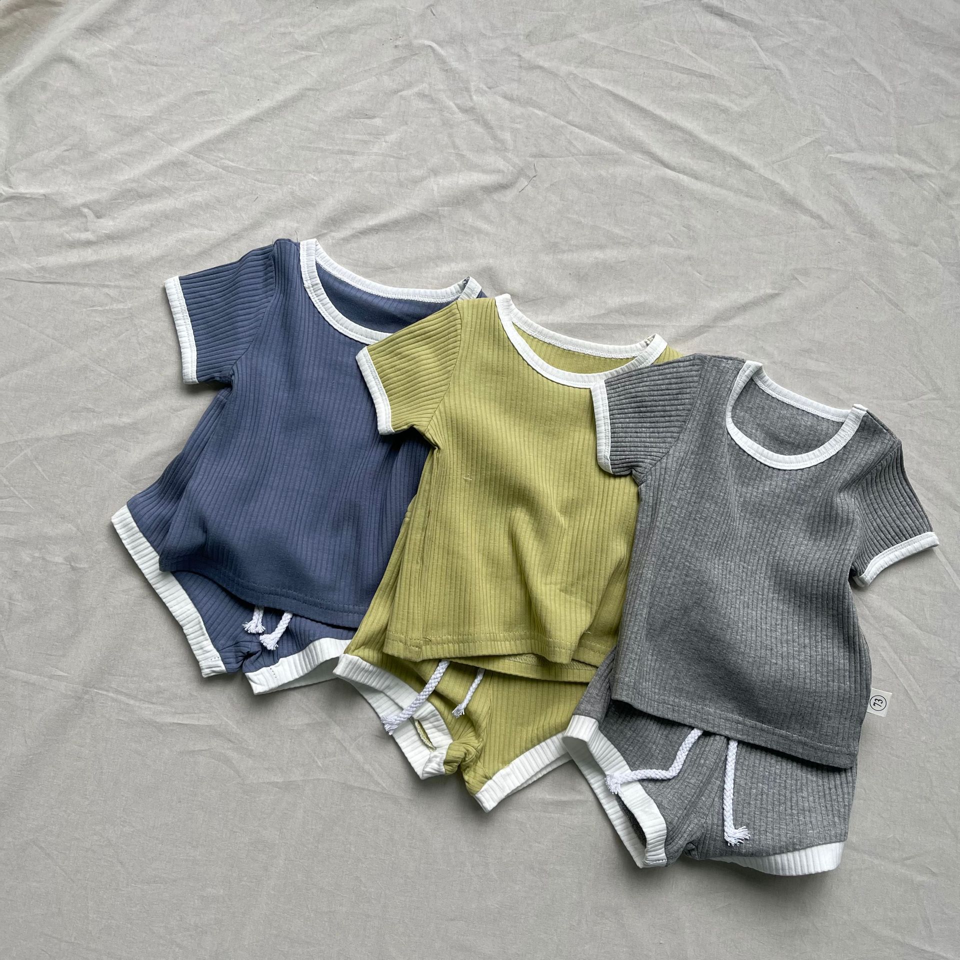 Ins 한국 스타일 라운드 넥 랩 반바지 짧은 소매 핏 스트립 코튼 세트 여름 아기 소년과 소녀를위한 상쾌한 짧은 바지 커버