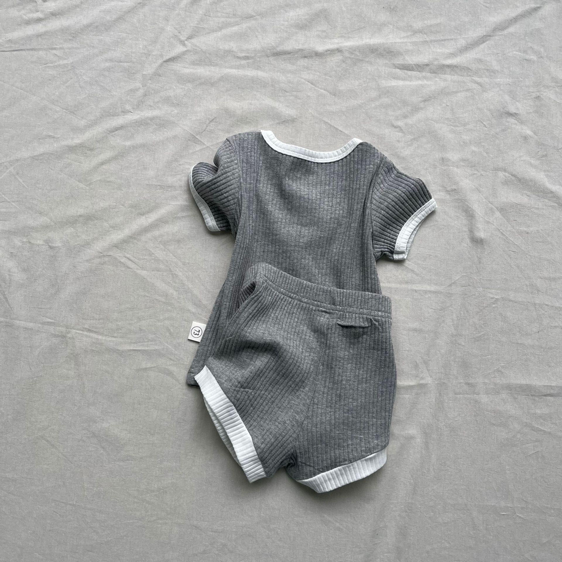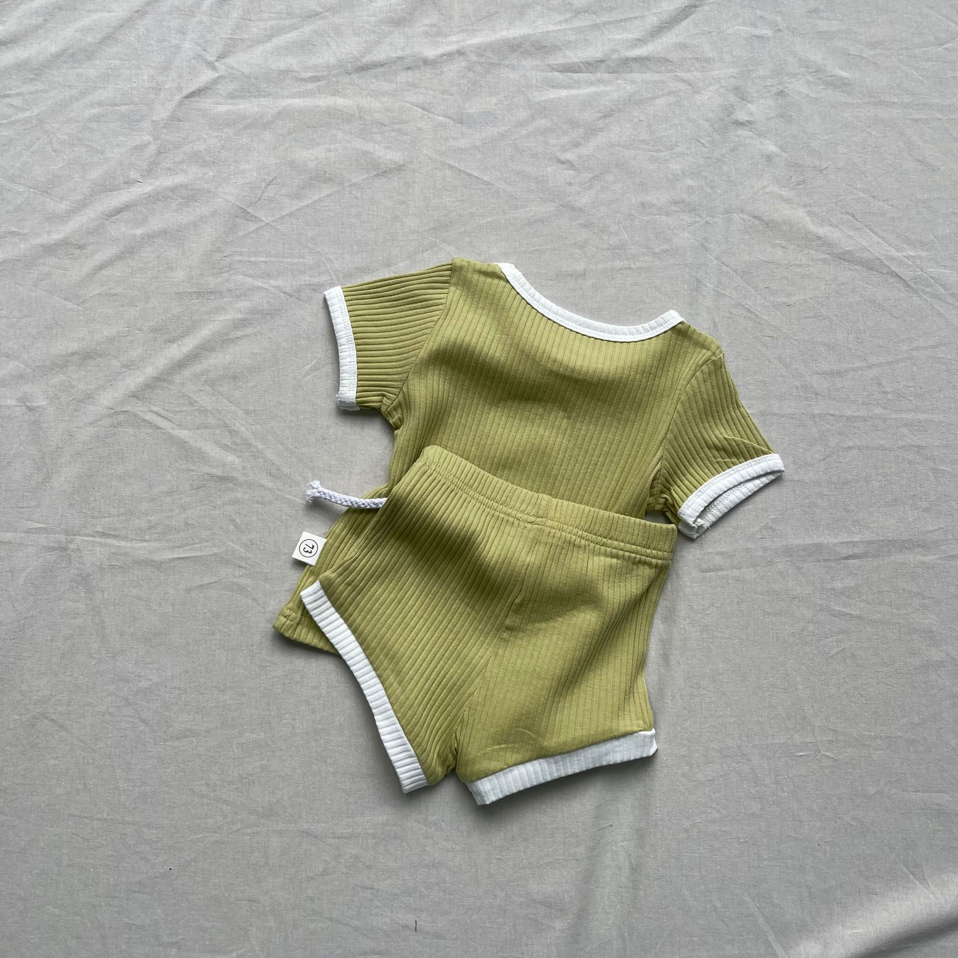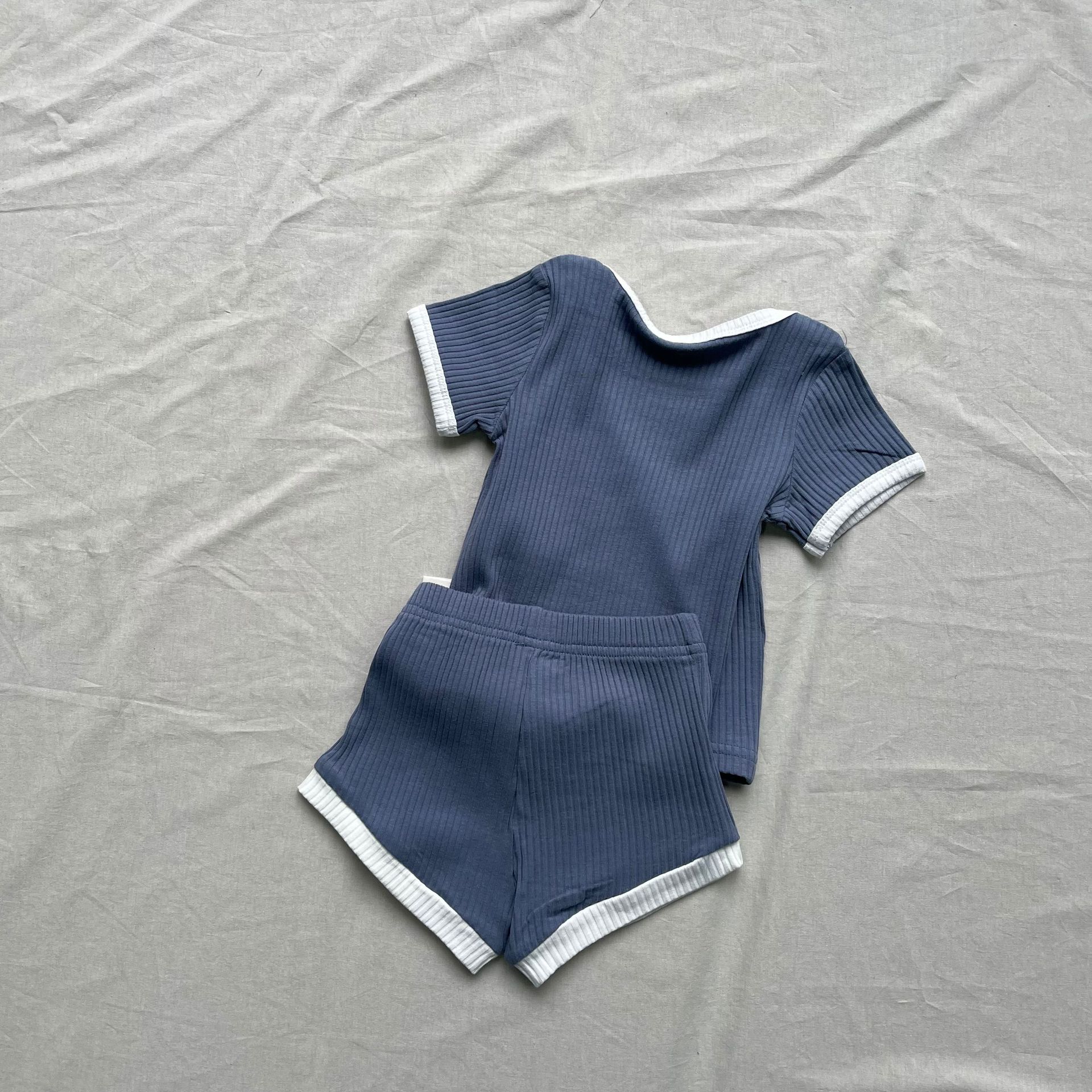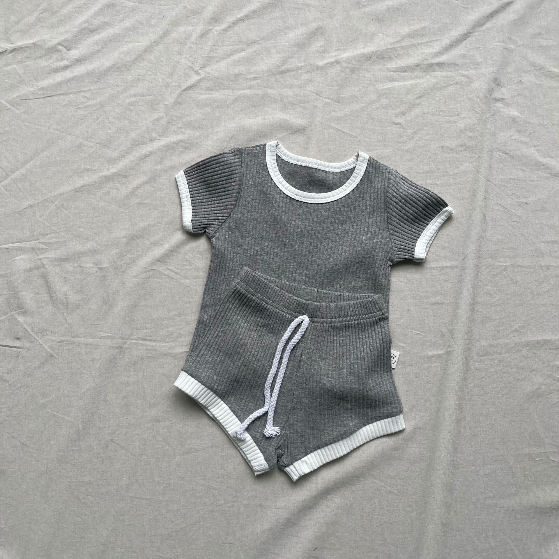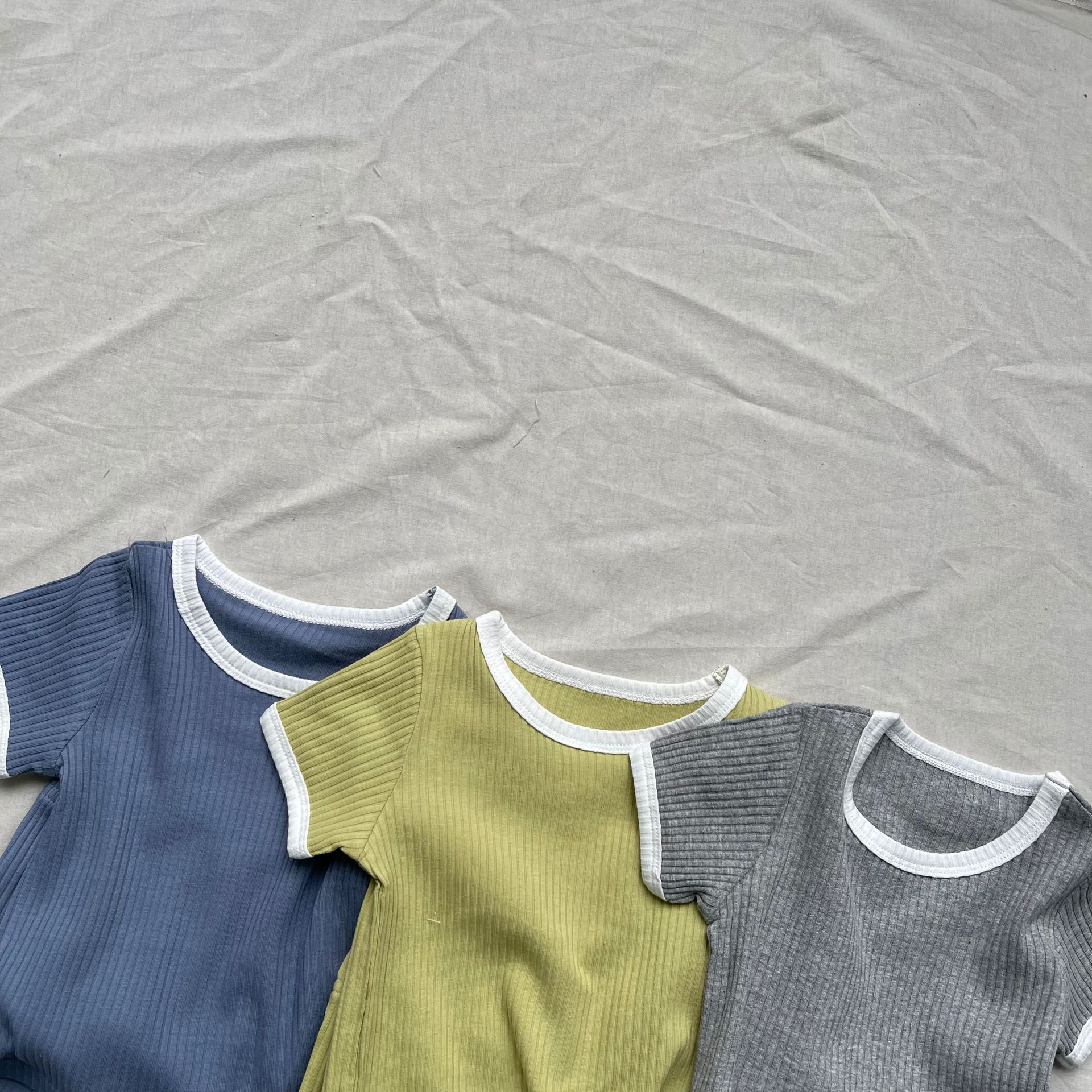 Ins 한국 스타일 라운드 넥 랩 반바지 짧은 소매 핏 스트립 코튼 세트 여름 아기 소년과 소녀를위한 상쾌한 짧은 바지 커버