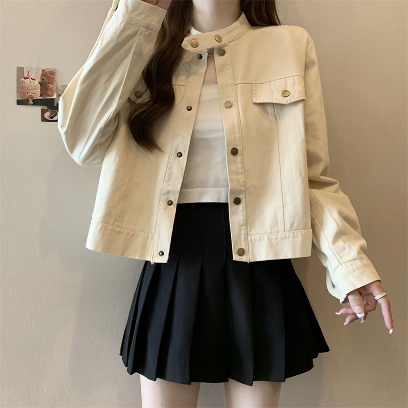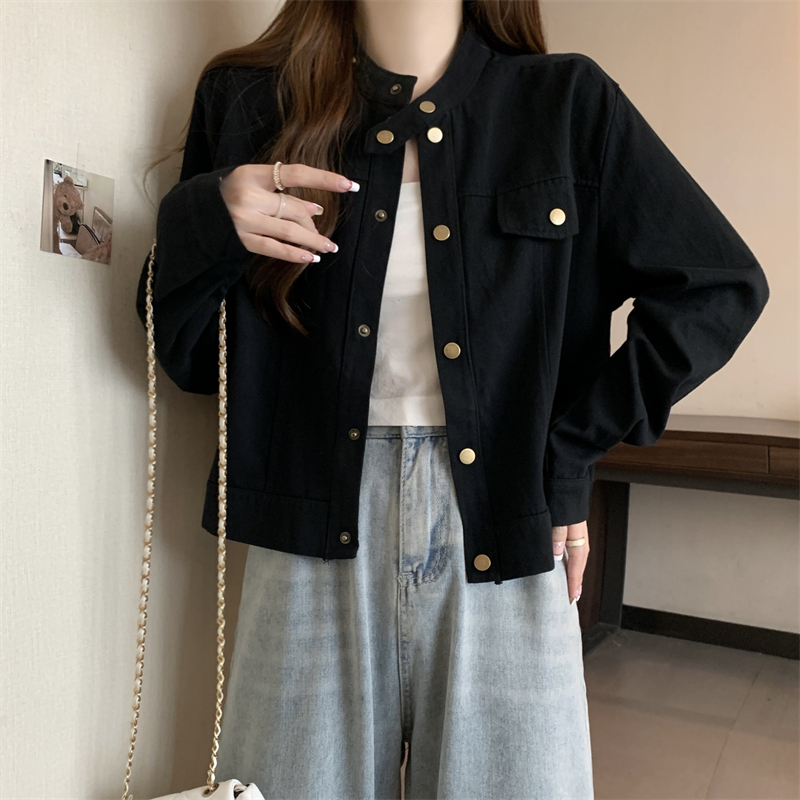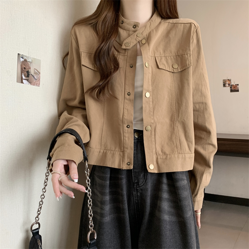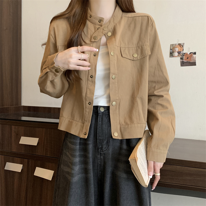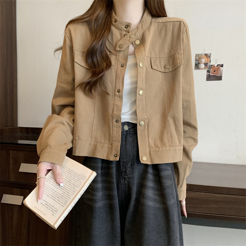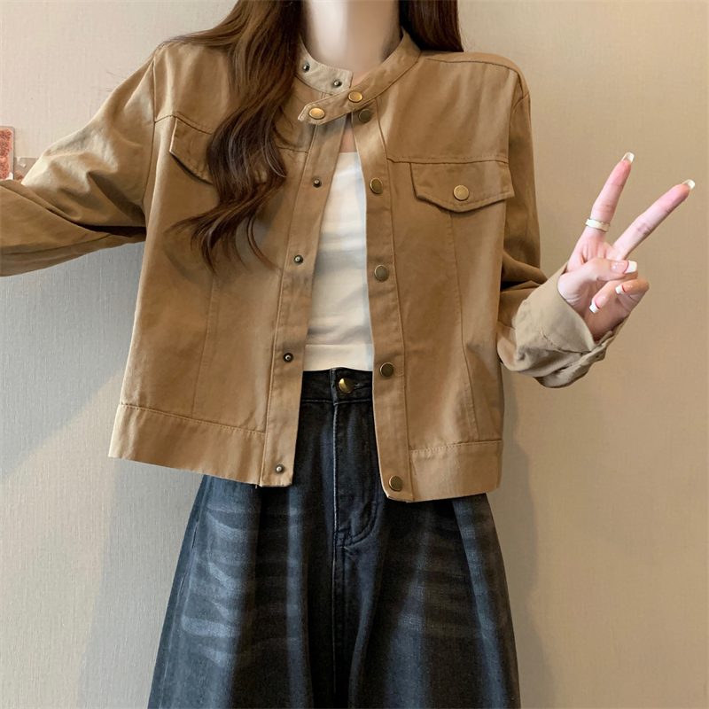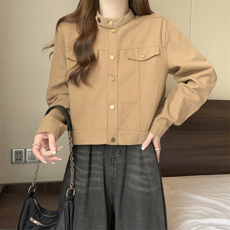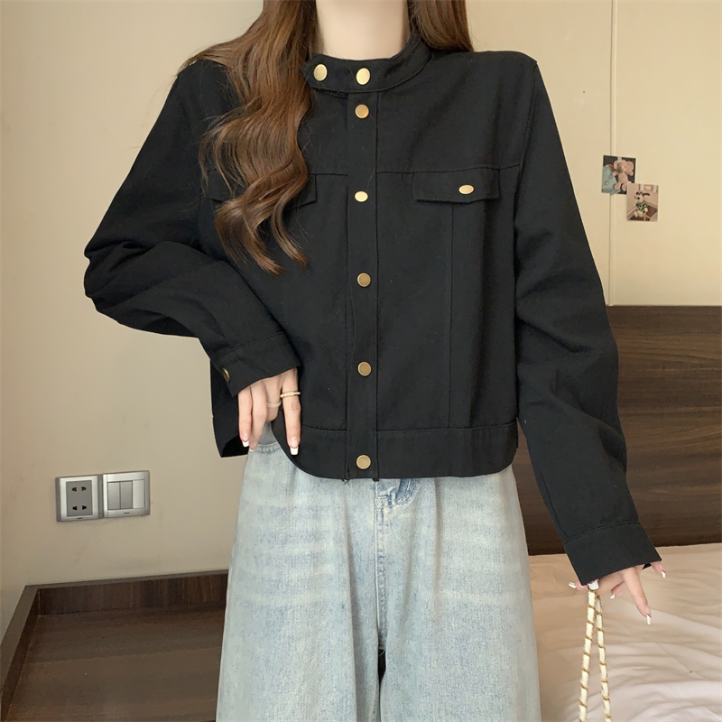 플러스 사이즈 통통녀 미국 스탠드 칼라 재킷 여성 2025 년 봄과 가을 새로운 프록 바람 어깨 쇼트 탑스토어 가기