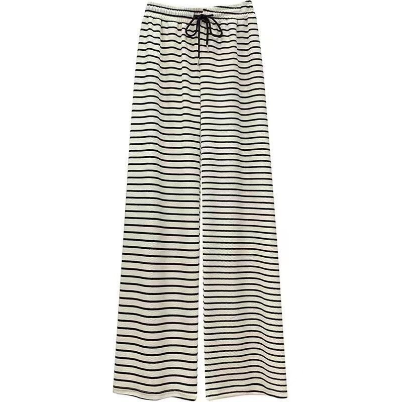 여름 아이스 실크 스트라이프 와이드 레그 팬츠 여성용 슬림 룩 스트레이트 하이 웨이스트 블랙 및 화이트 스트라이프 캐주얼 바지 여성용 드레이프 바지