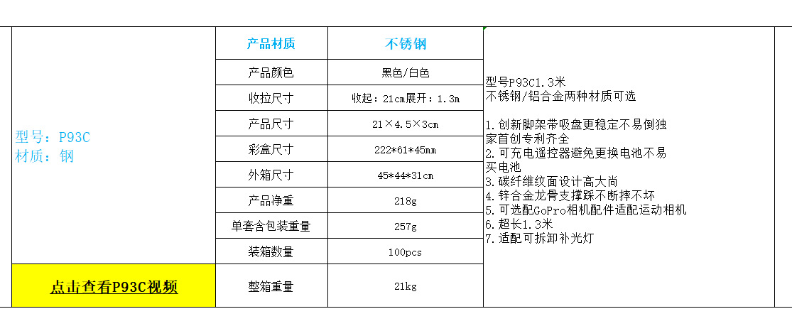 새로운 P93C 셀카 스틱 1.3 m 지속 뷰티 라이트 휴대 전화 브래킷 라이브 셀카 블루투스 셀카 스틱