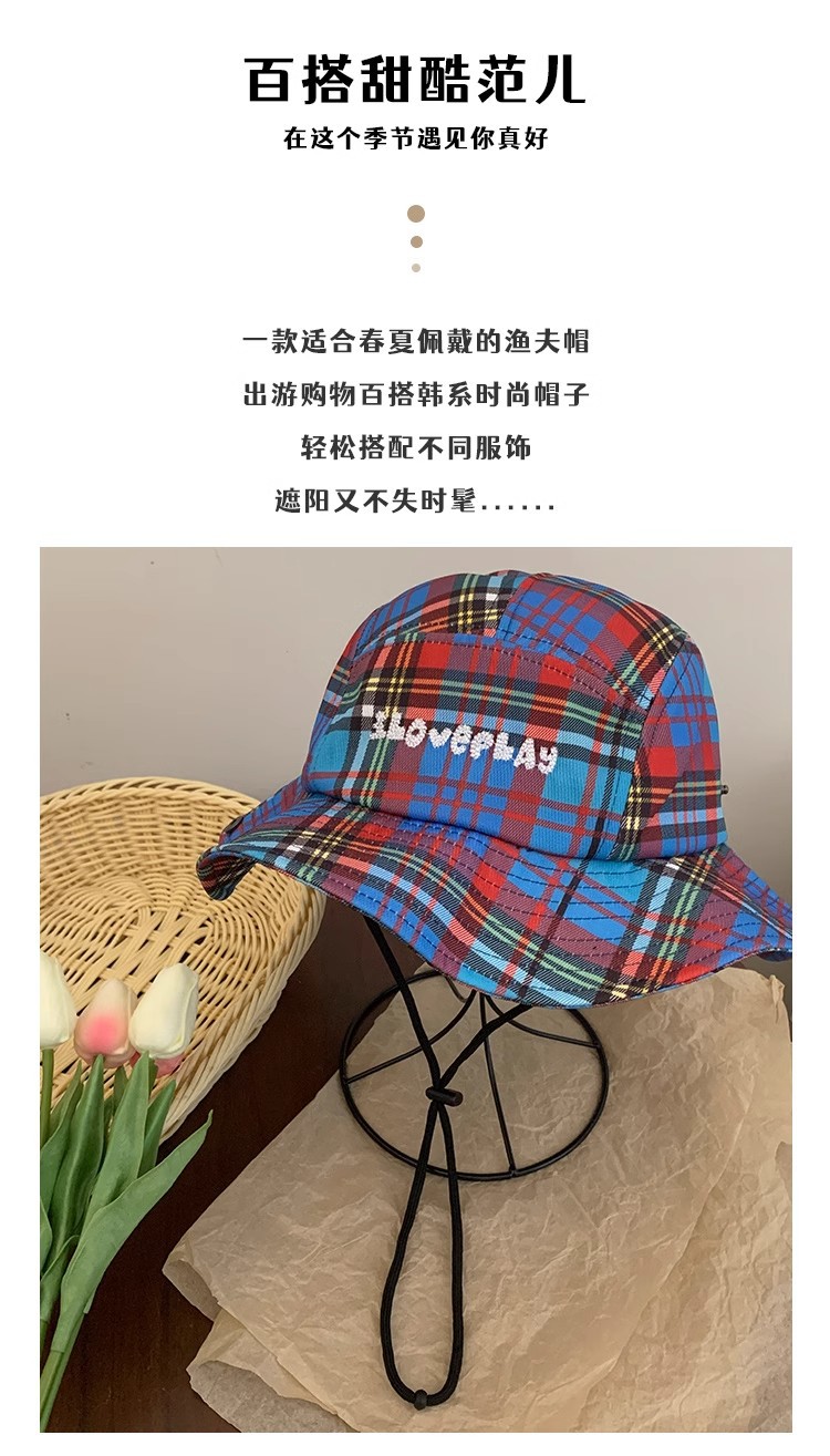 일본식 새로운 빈티지 격자 무늬 어부 모자 여성의 봄과 여름 유행 브랜드 편지 자수 대형 브림 햇빛 햇살 모자 등산 모자스토어 가기