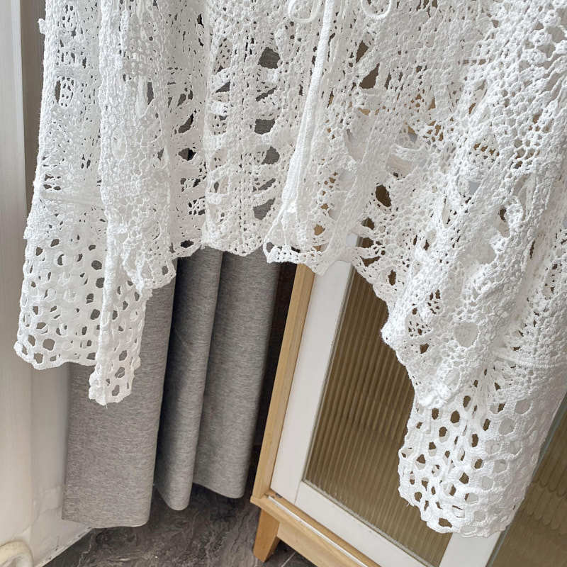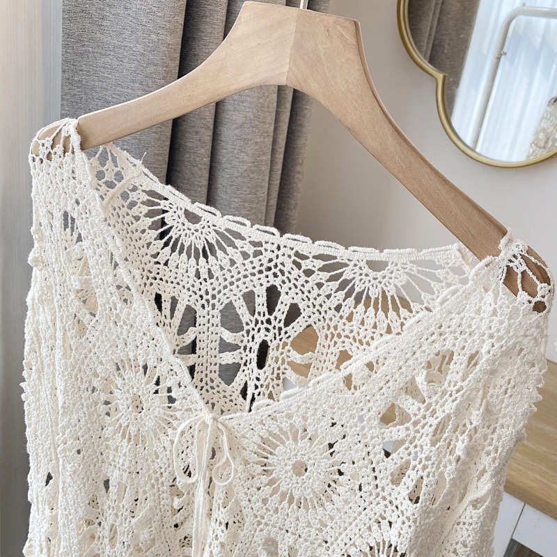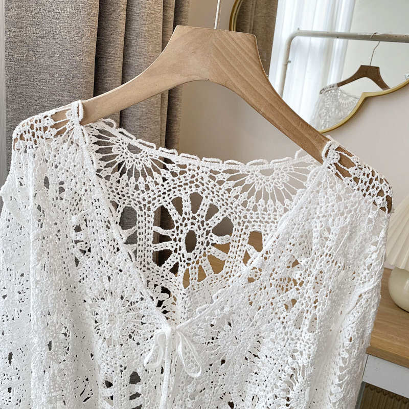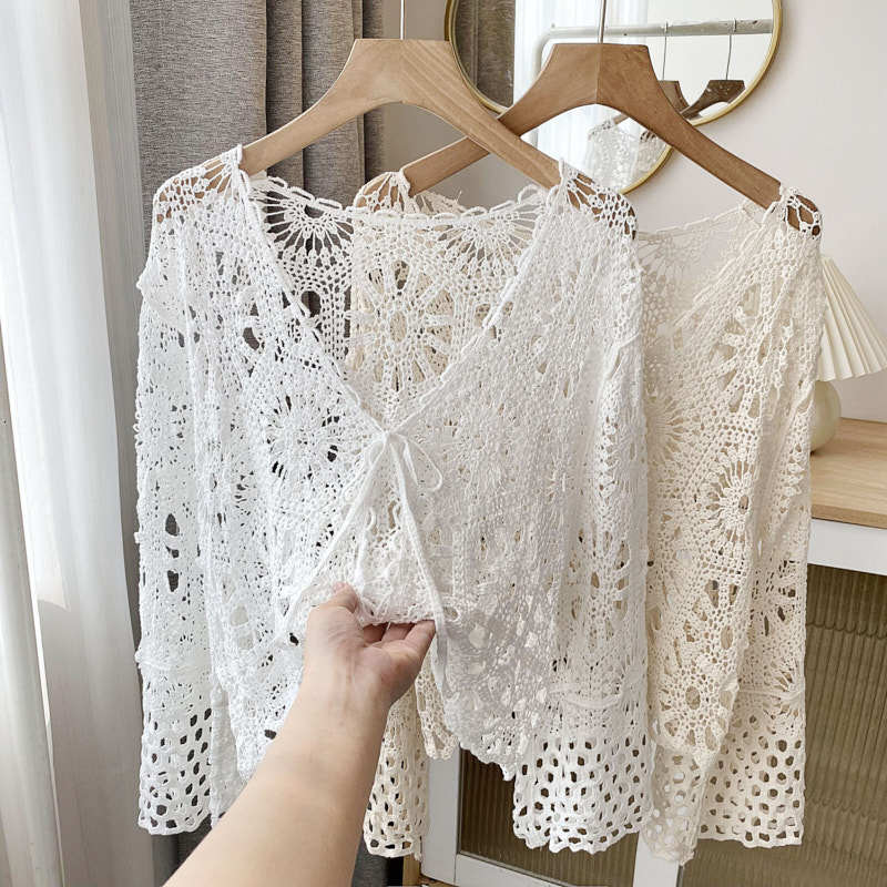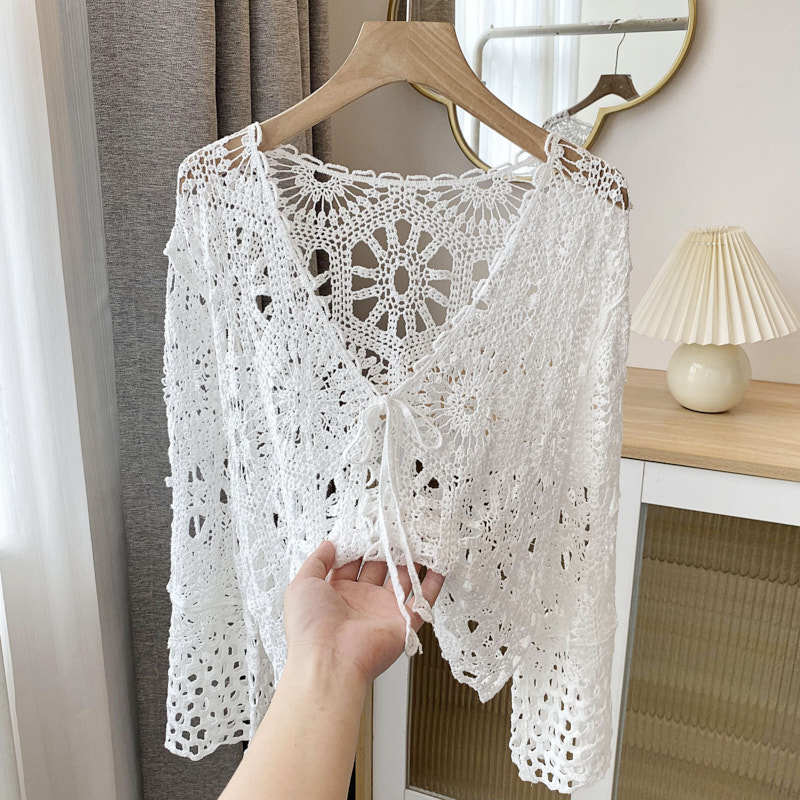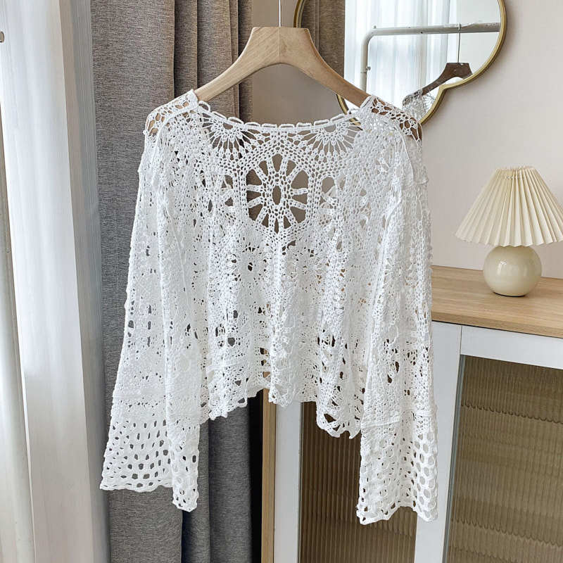 진짜 샷 할로우 니트 블라우스 여름 의상 보헤미안 해변 휴가 여성을위한 긴팔 탑 선 스크린 셔츠스토어 가기