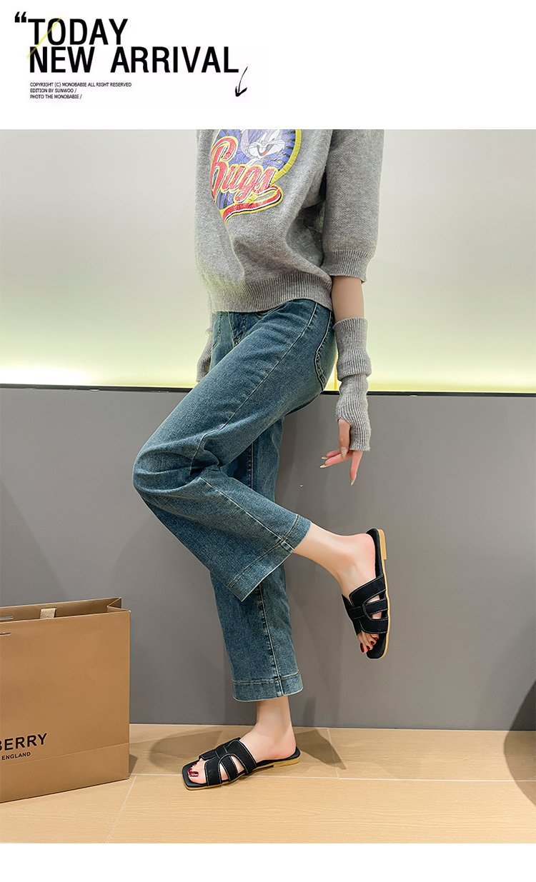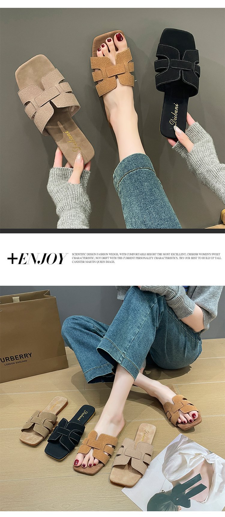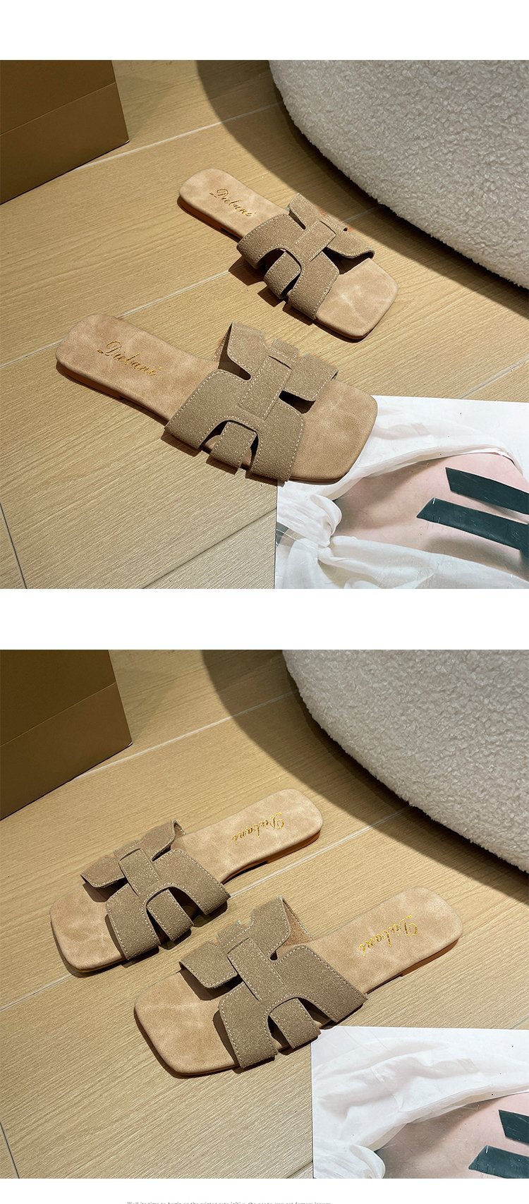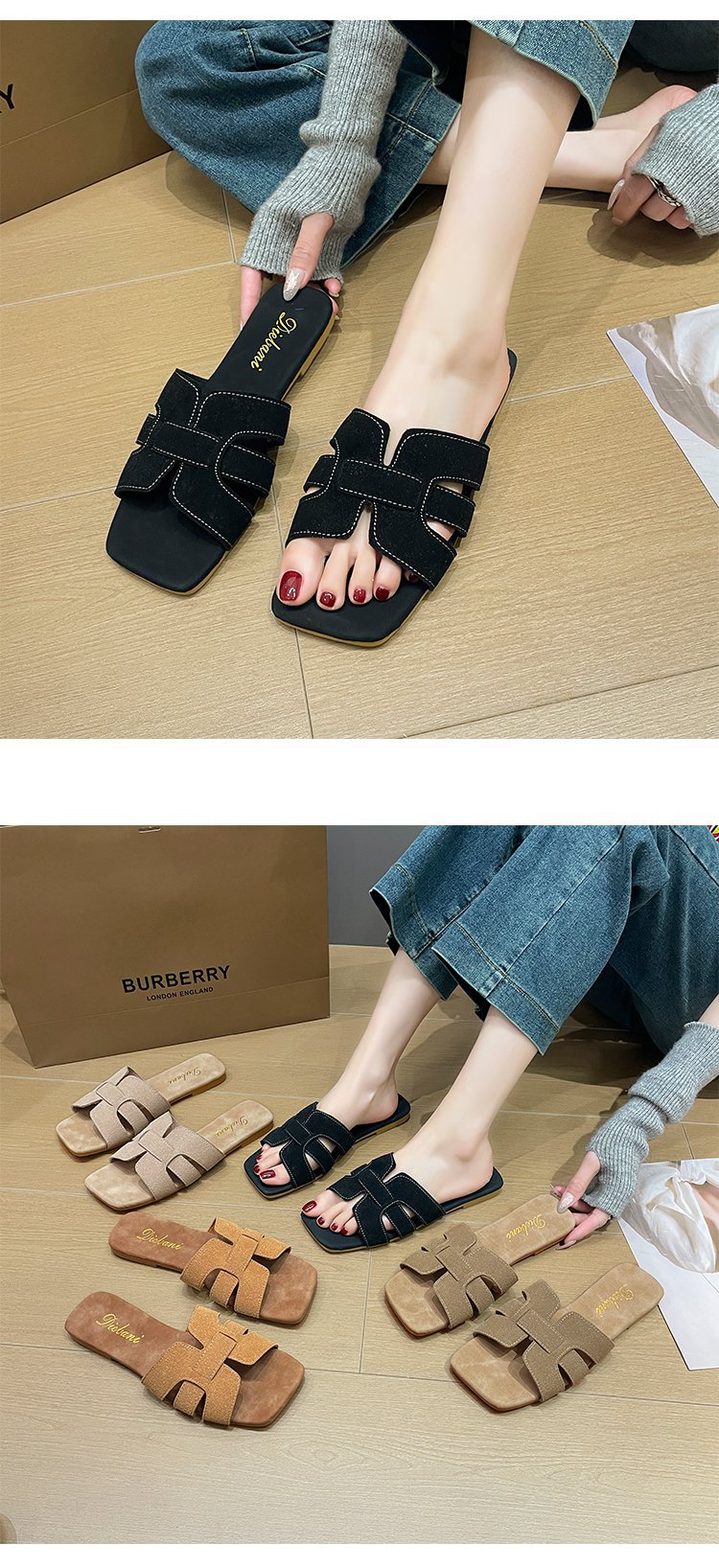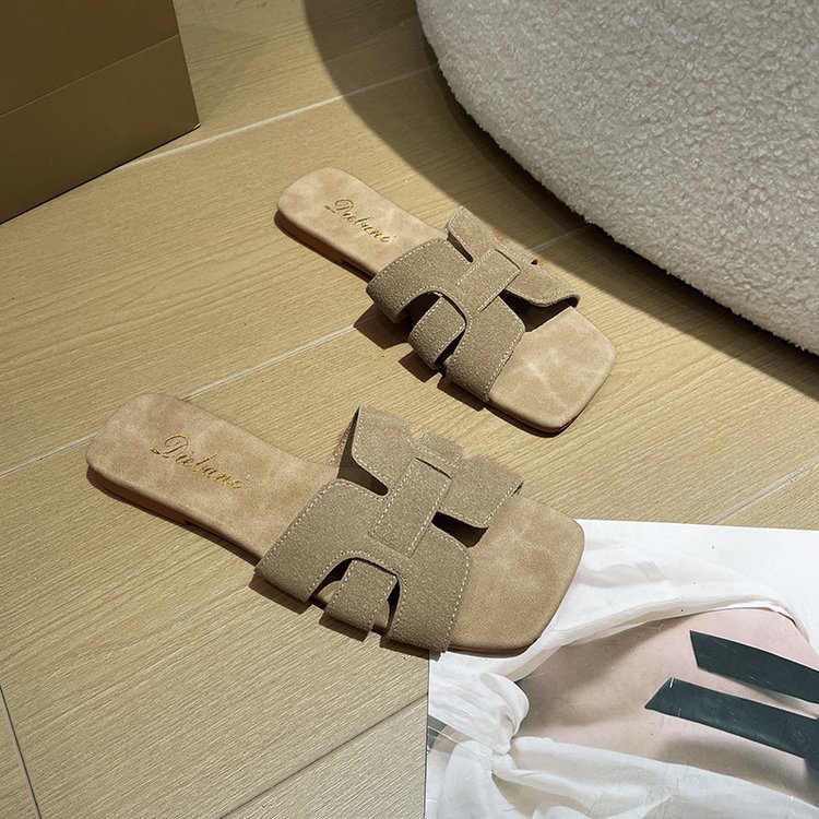 빈티지 향기로운 스타일 플랫 슬리퍼 여성 2025 년 여름 뉴 스웨이드 슬립 온 샌들 오픈 발가락 비치 슬리퍼스토어 가기