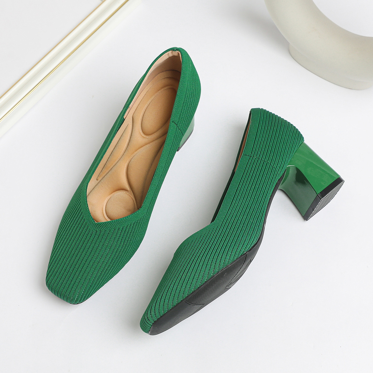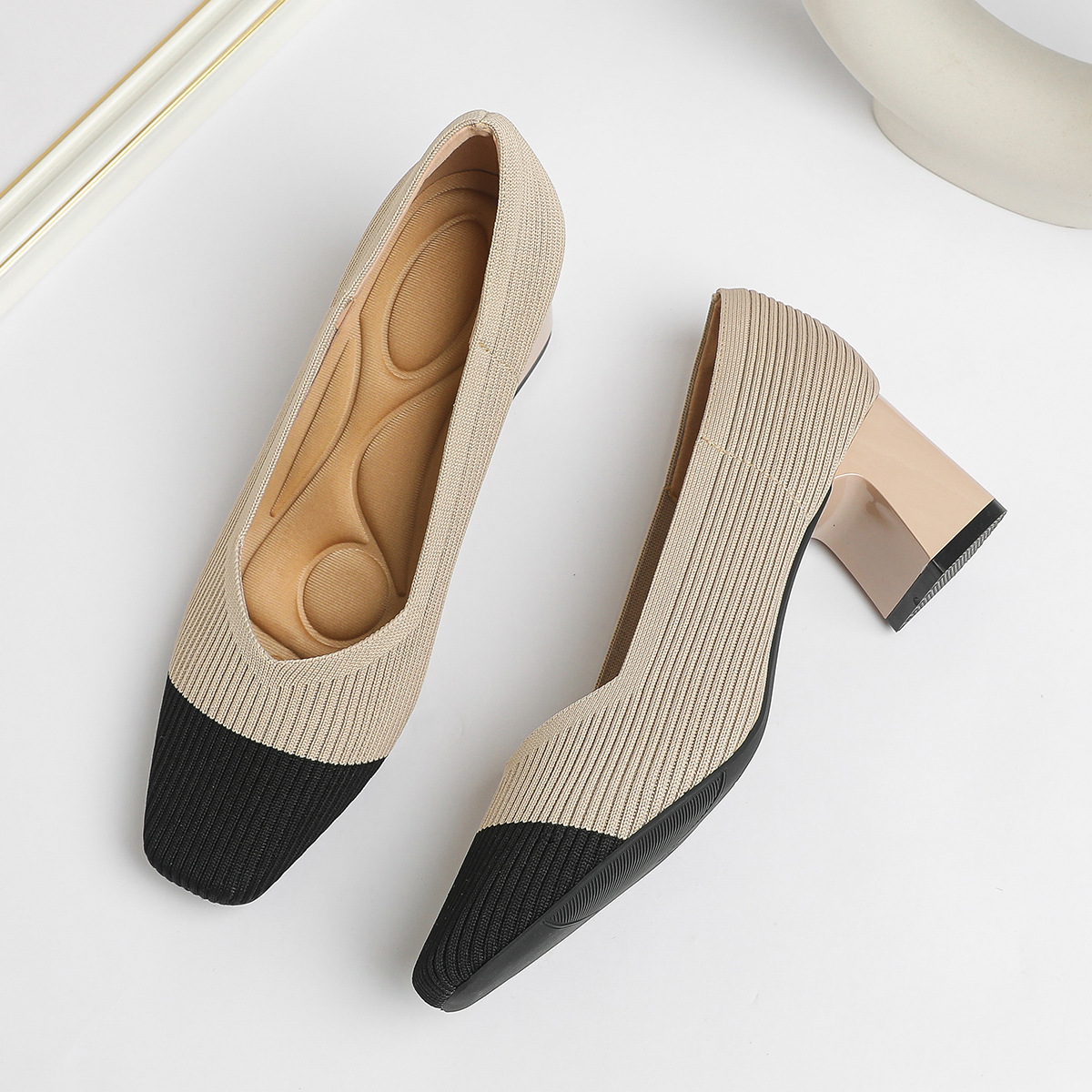 일본 공주 신발 사각 발가락 미드 힐 니트 신발 여성용 두꺼운 뒤꿈치 얕은 상단 니트 신발 편안한 통기성 스튜어디스 신발 여성 신발
