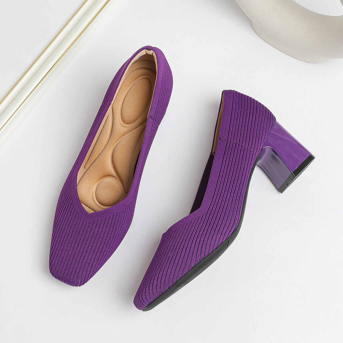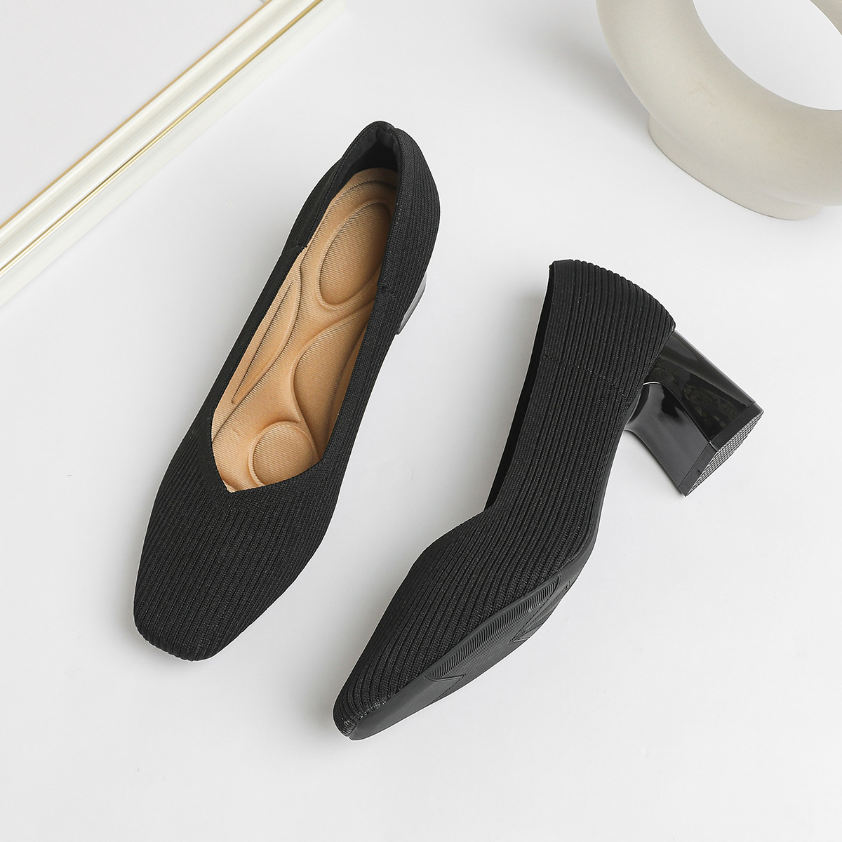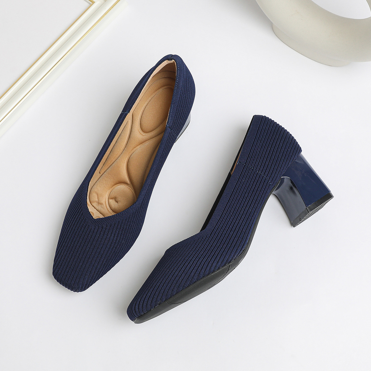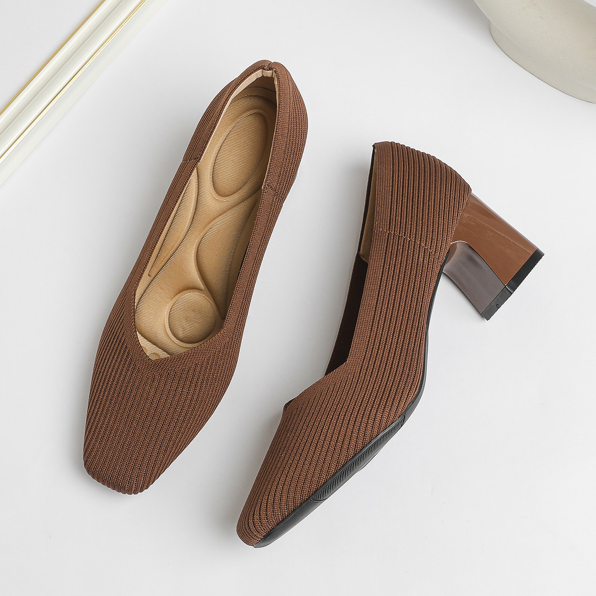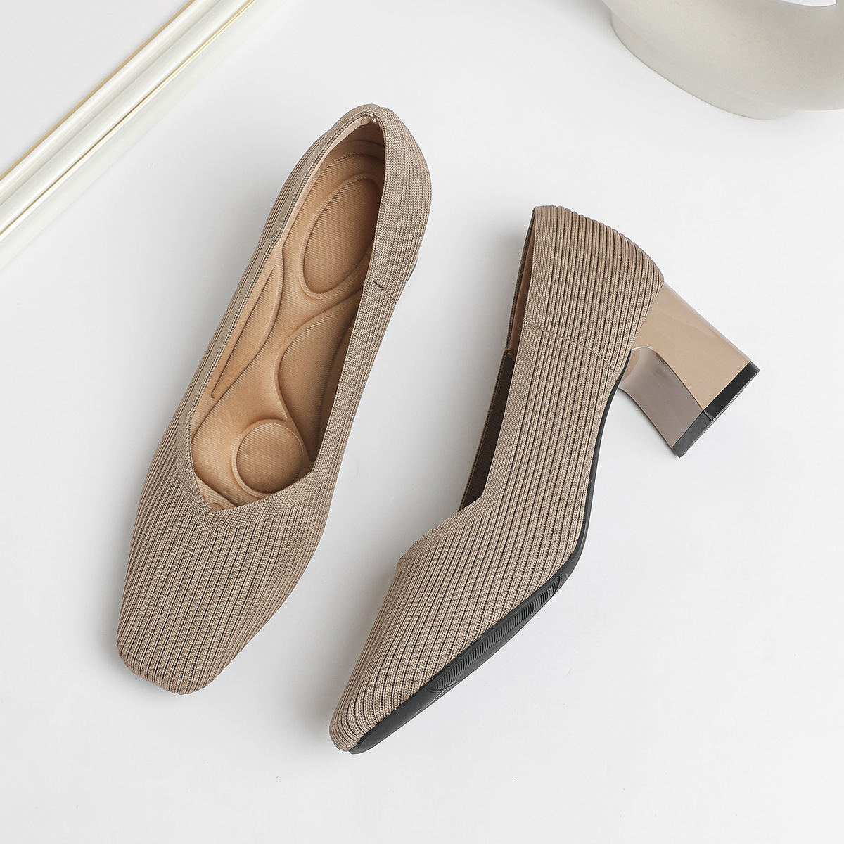 일본 공주 신발 사각 발가락 미드 힐 니트 신발 여성용 두꺼운 뒤꿈치 얕은 상단 니트 신발 편안한 통기성 스튜어디스 신발 여성 신발스토어 가기
