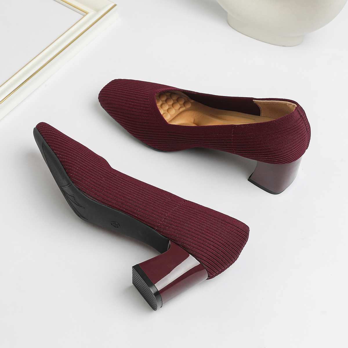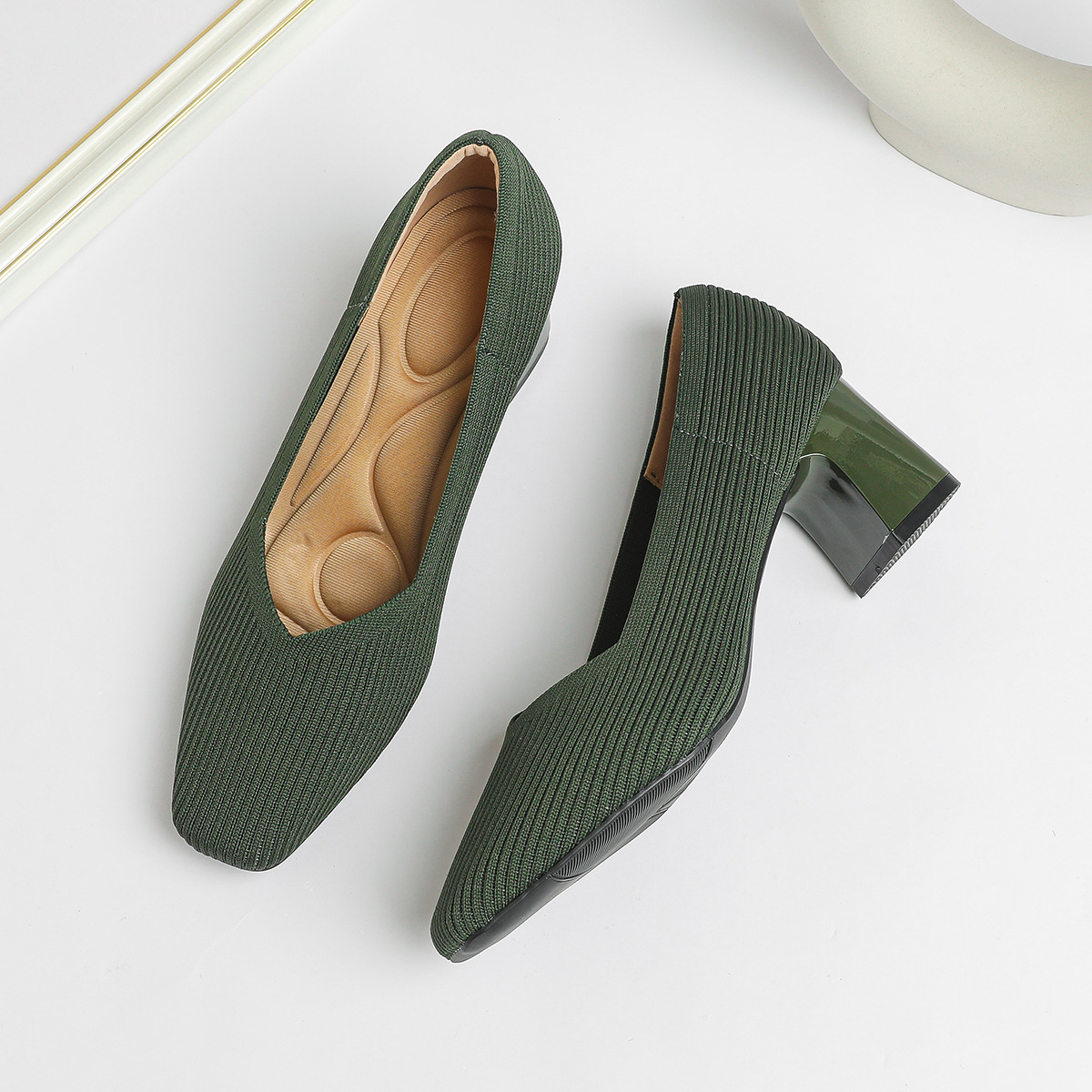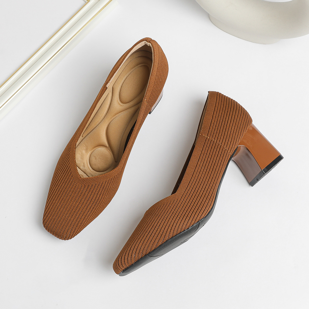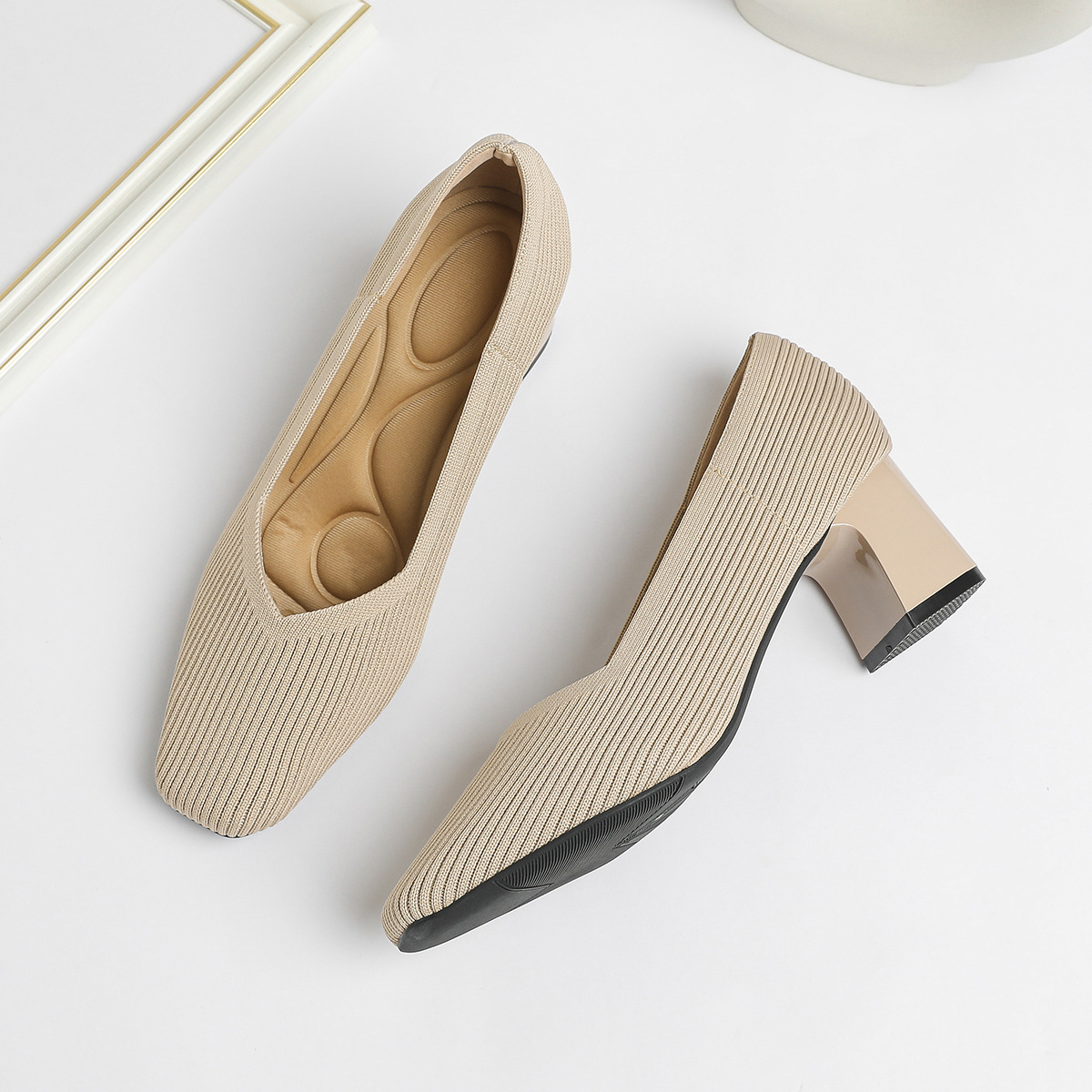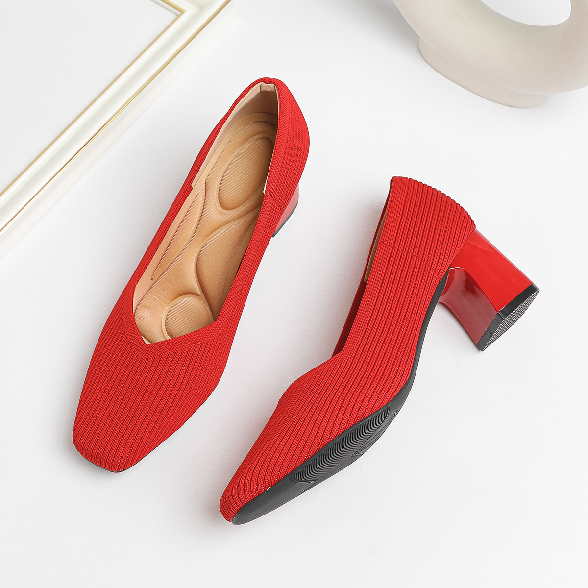 일본 공주 신발 사각 발가락 미드 힐 니트 신발 여성용 두꺼운 뒤꿈치 얕은 상단 니트 신발 편안한 통기성 스튜어디스 신발 여성 신발스토어 가기