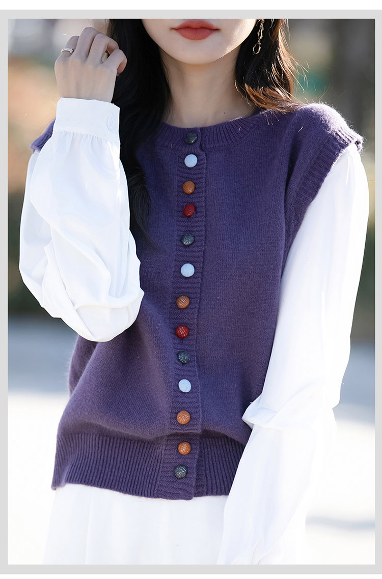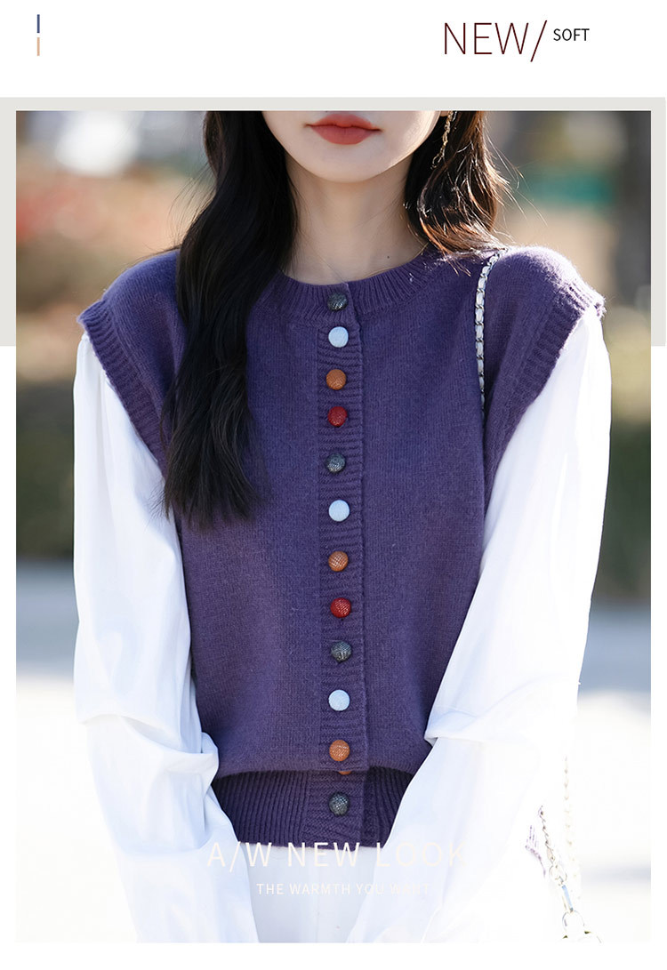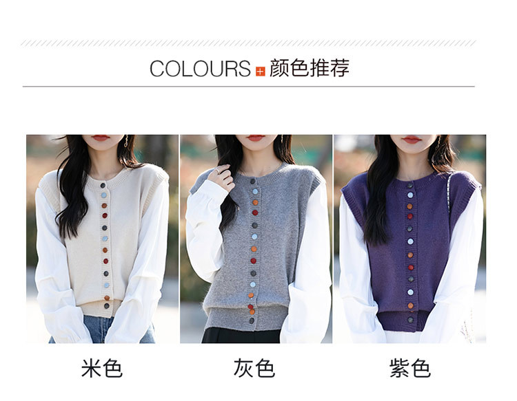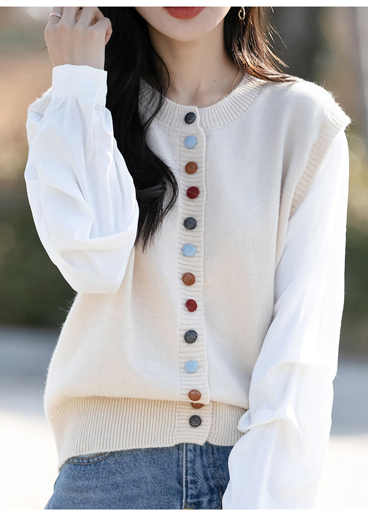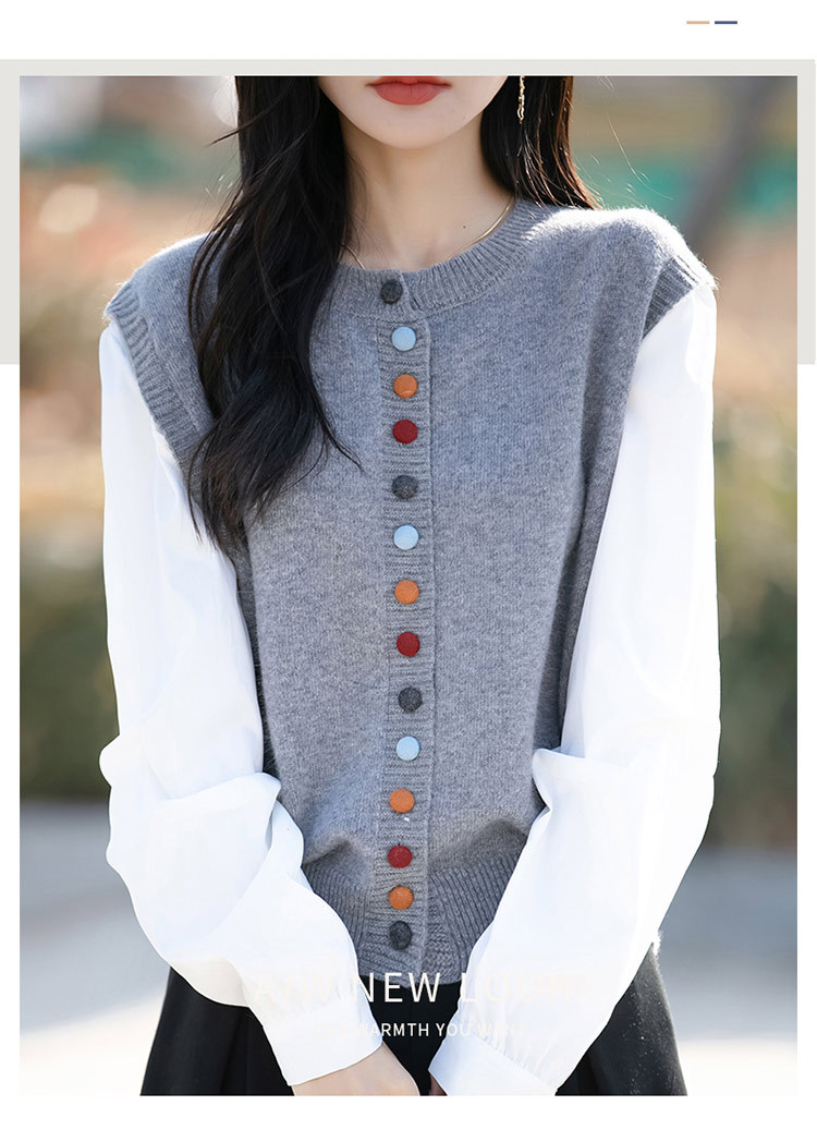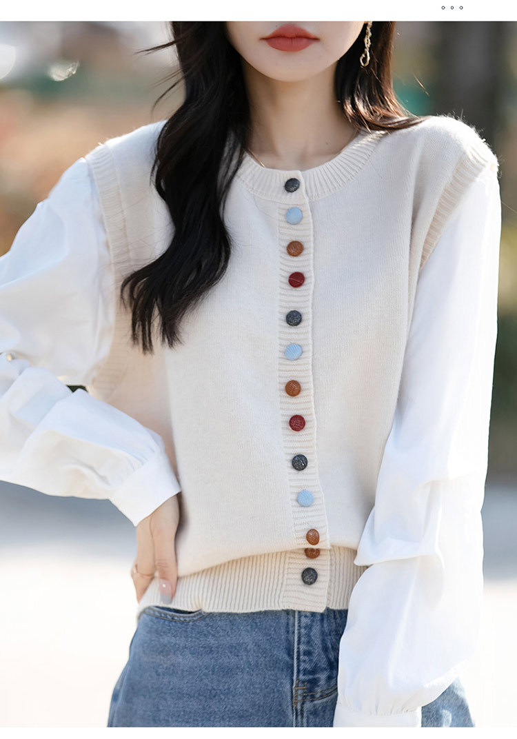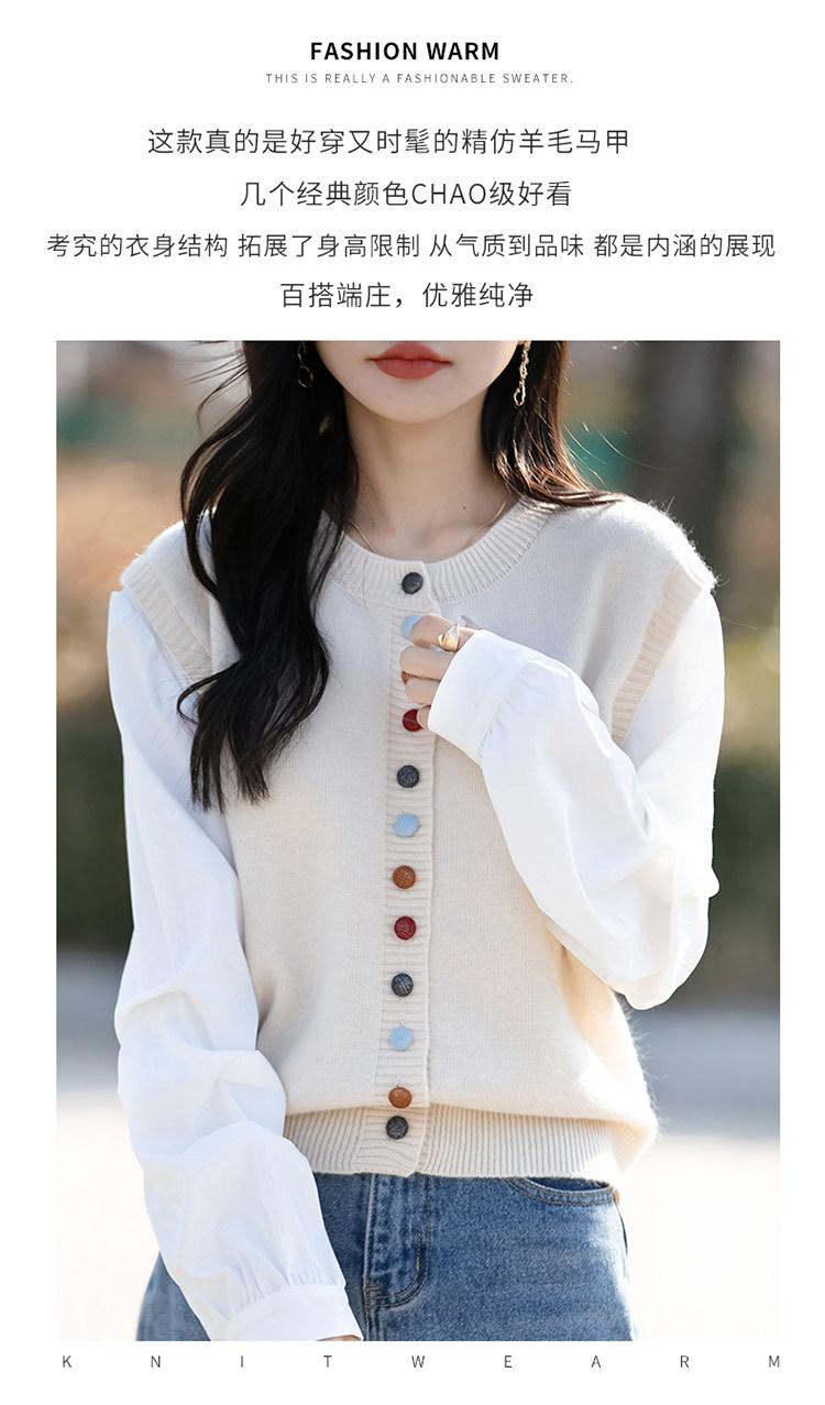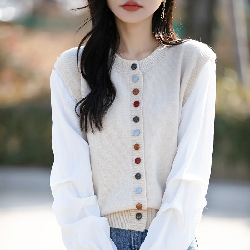 도매 봄과 가을 새로운 Worsted 울 크루 넥 니트 카디건 컬러 버클 컬러 매칭 느슨한 가짜 투피스 탑 여성스토어 가기