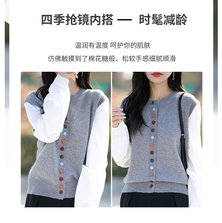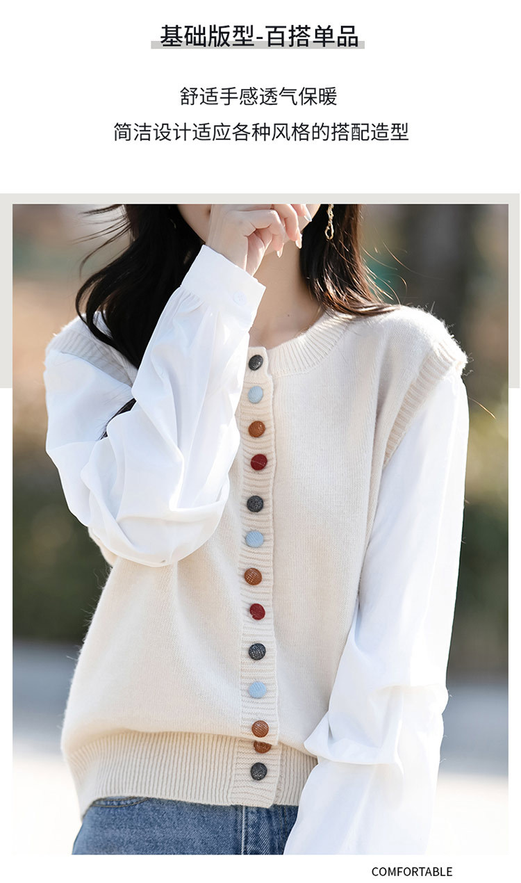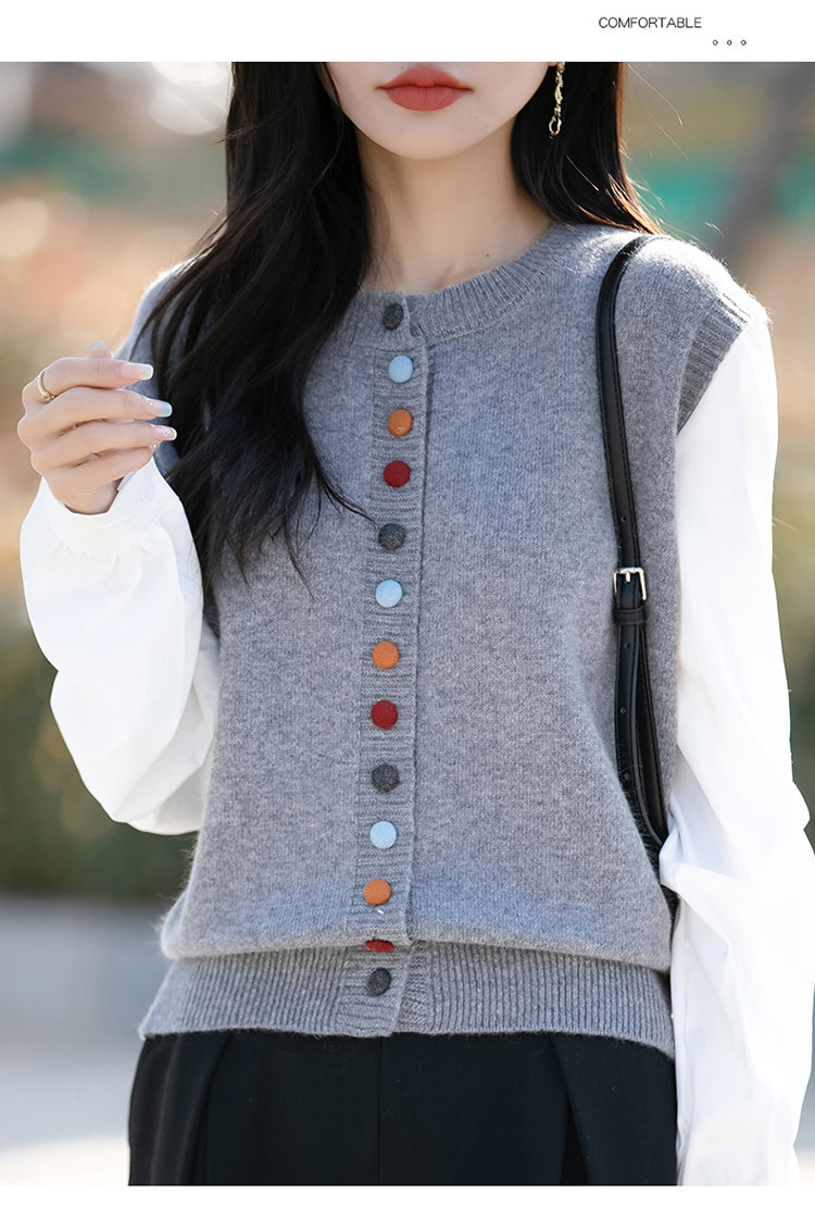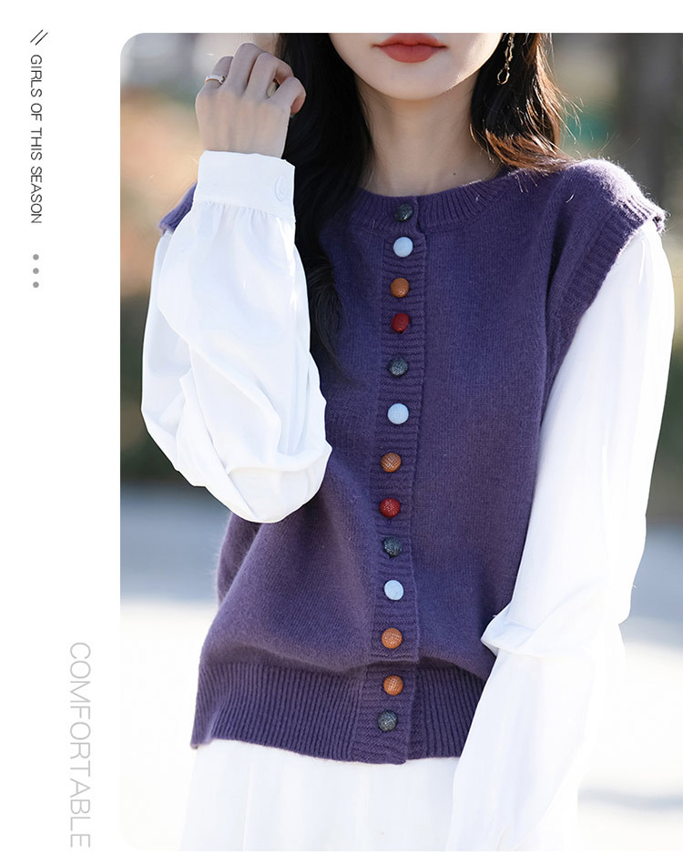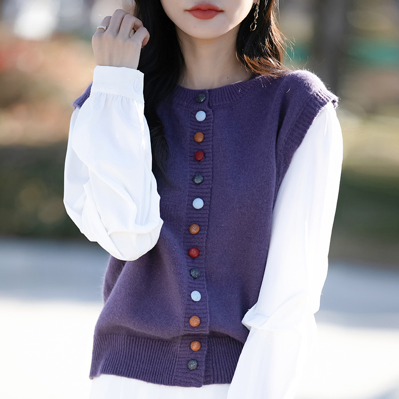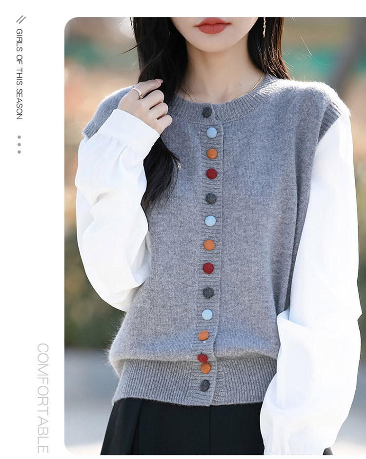 도매 봄과 가을 새로운 Worsted 울 크루 넥 니트 카디건 컬러 버클 컬러 매칭 느슨한 가짜 투피스 탑 여성
