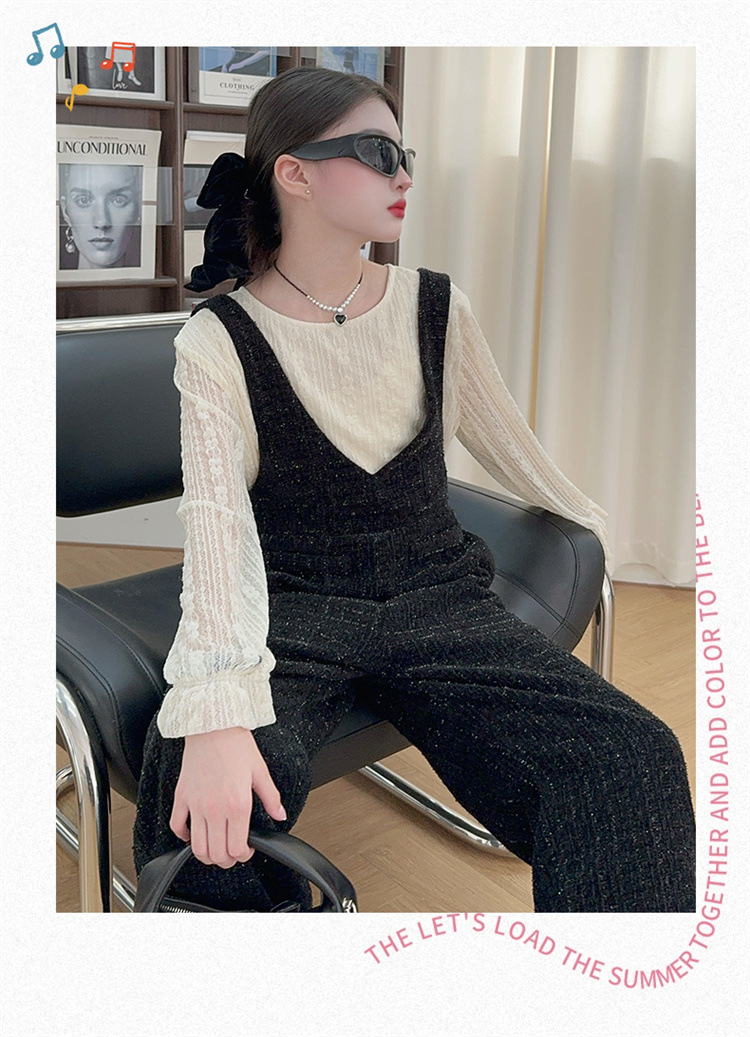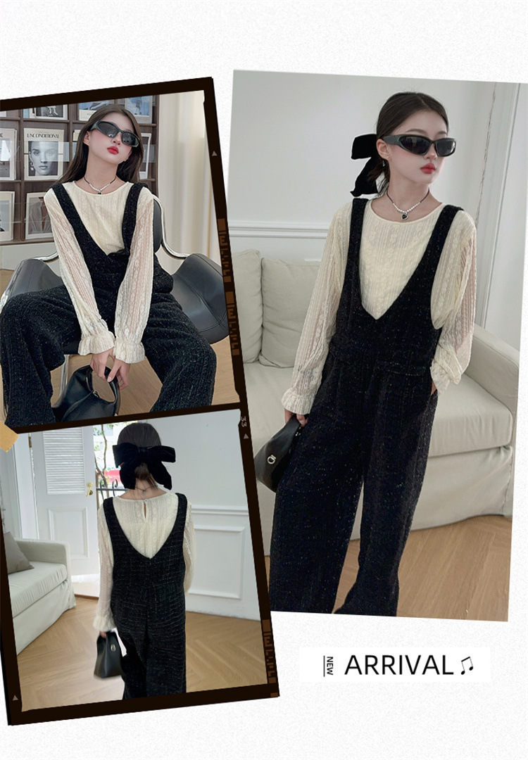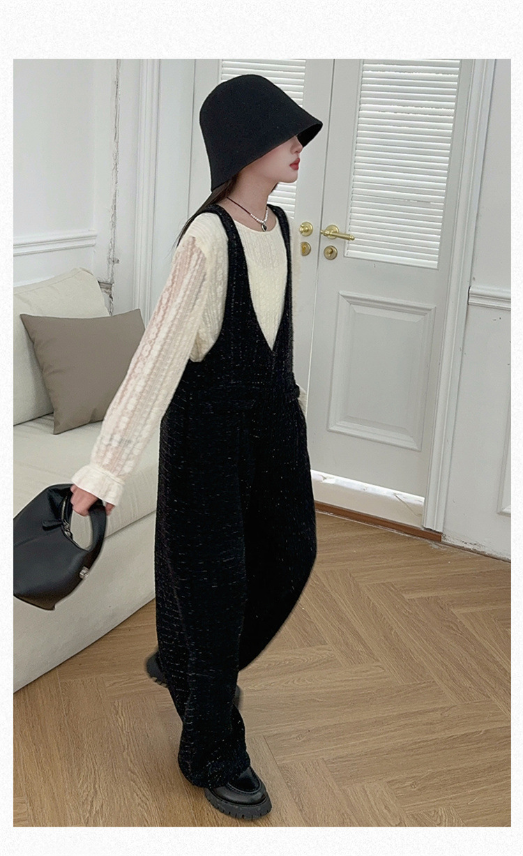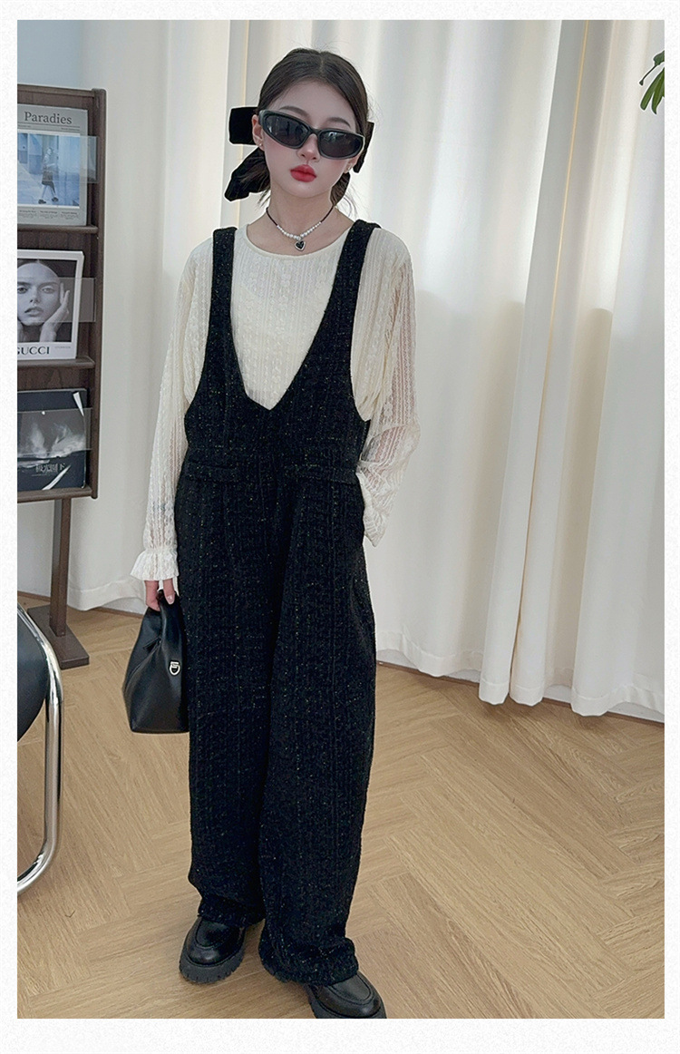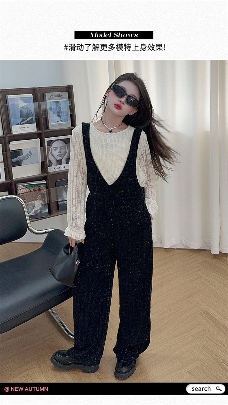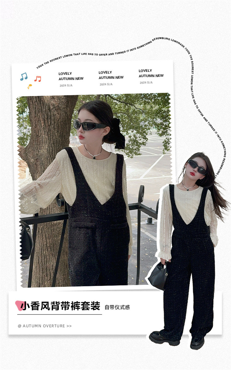 소녀의 게으른 스타일 스트랩 세트 어린이 트위드 바지 레트로 바지 레이스베이스 셔츠 투피스 세트스토어 가기