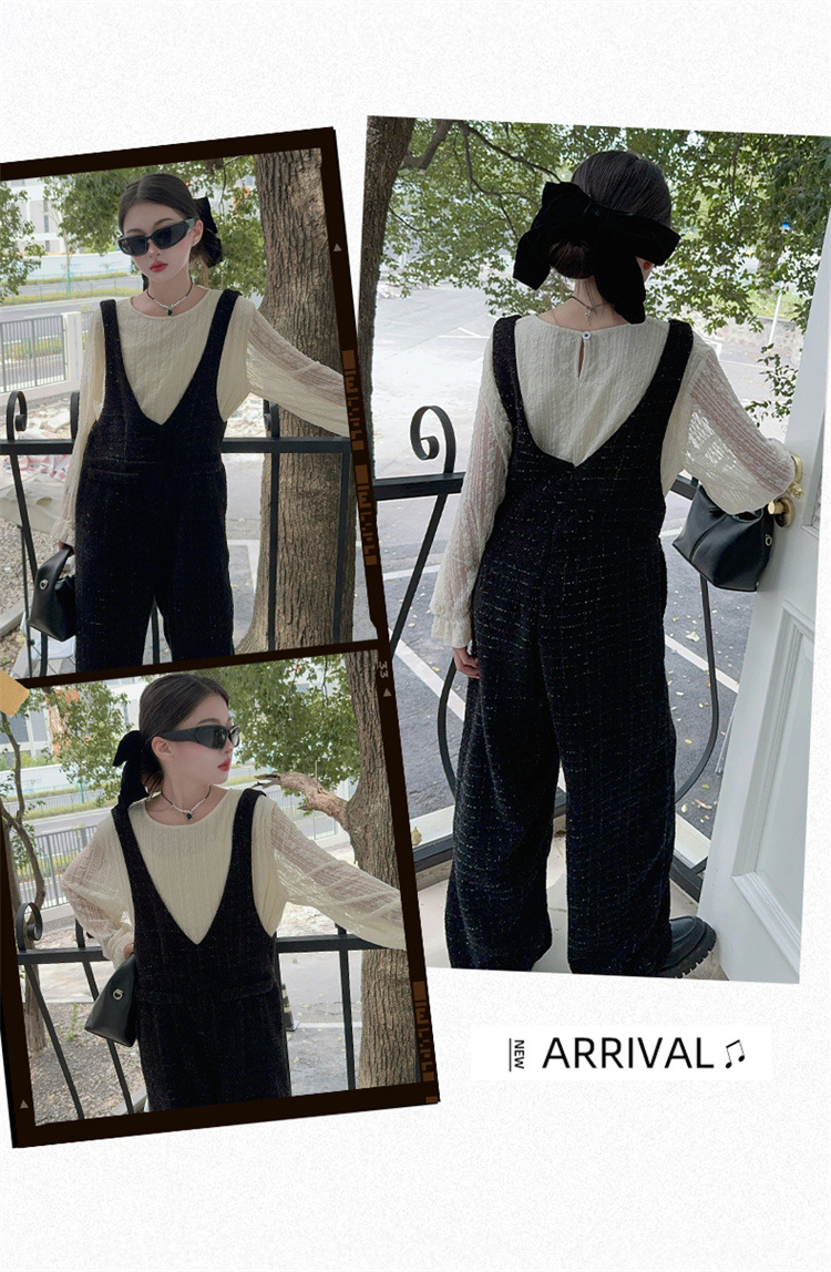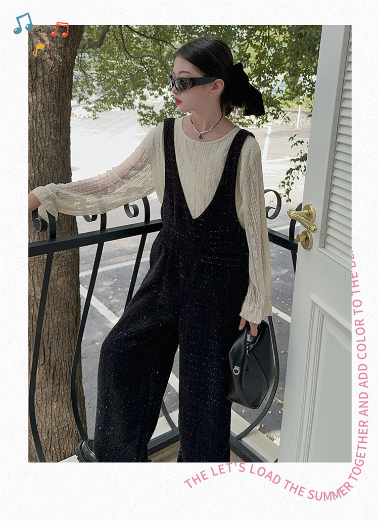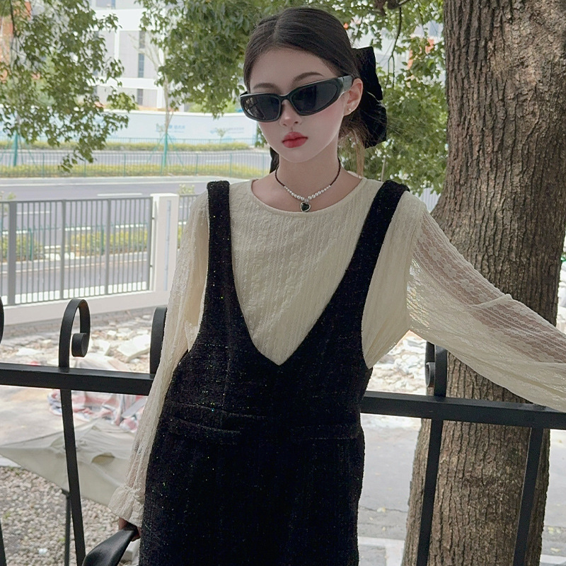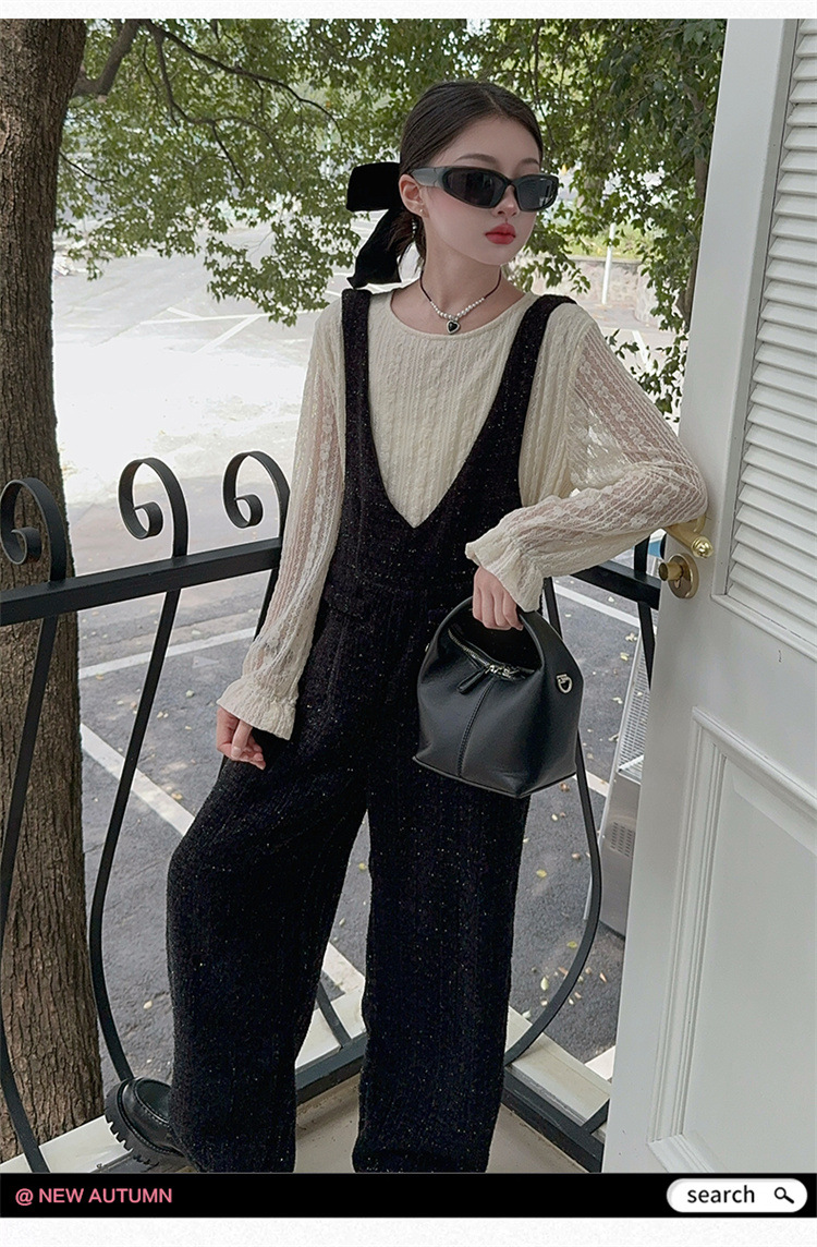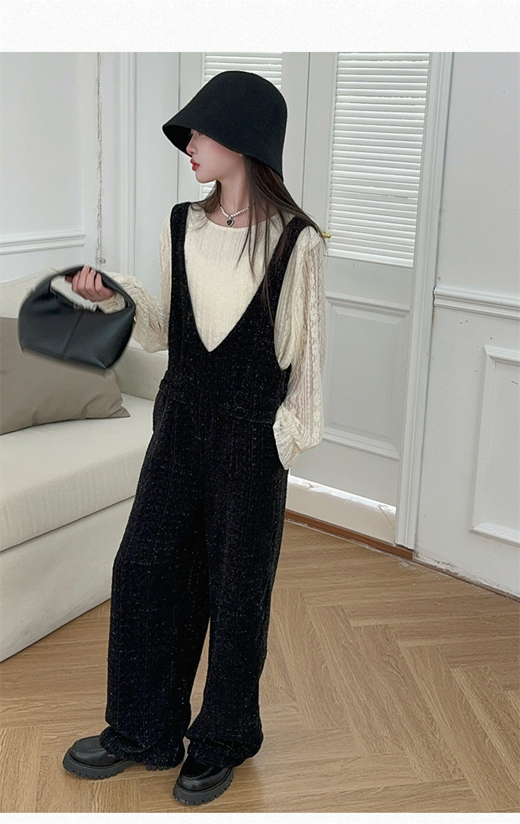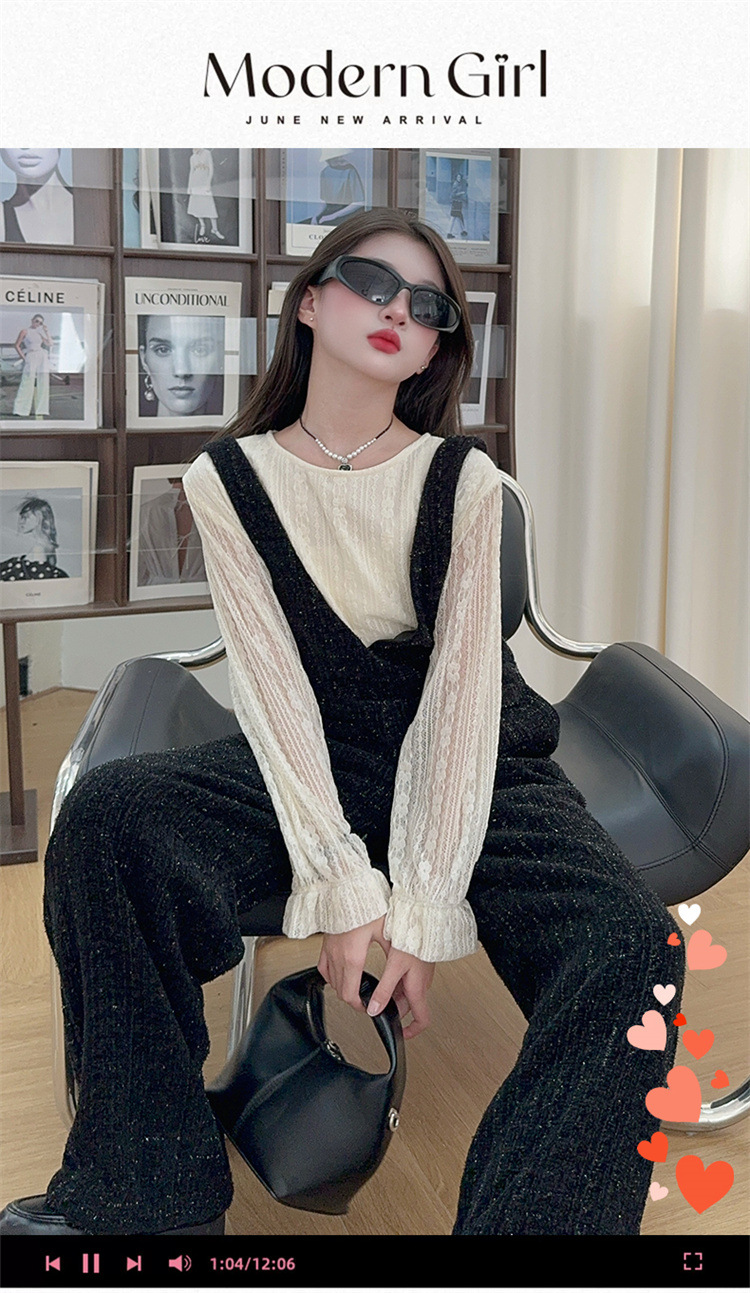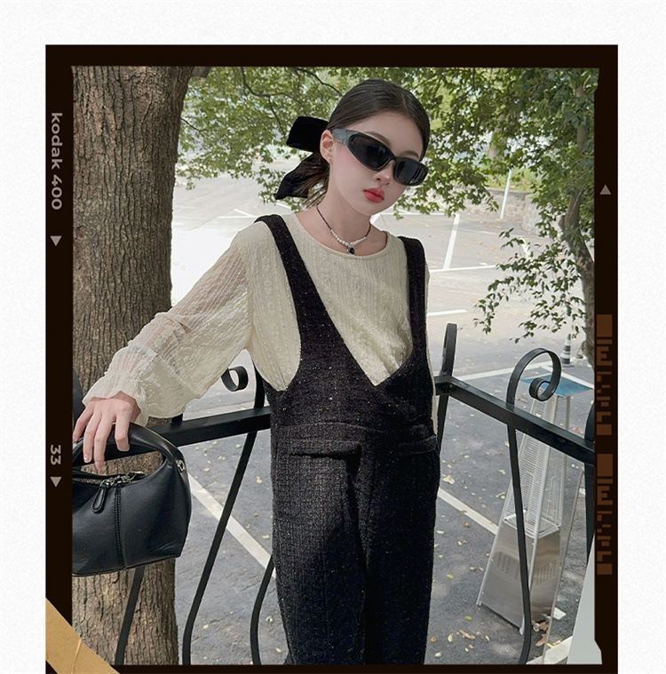 소녀의 게으른 스타일 스트랩 세트 어린이 트위드 바지 레트로 바지 레이스베이스 셔츠 투피스 세트스토어 가기